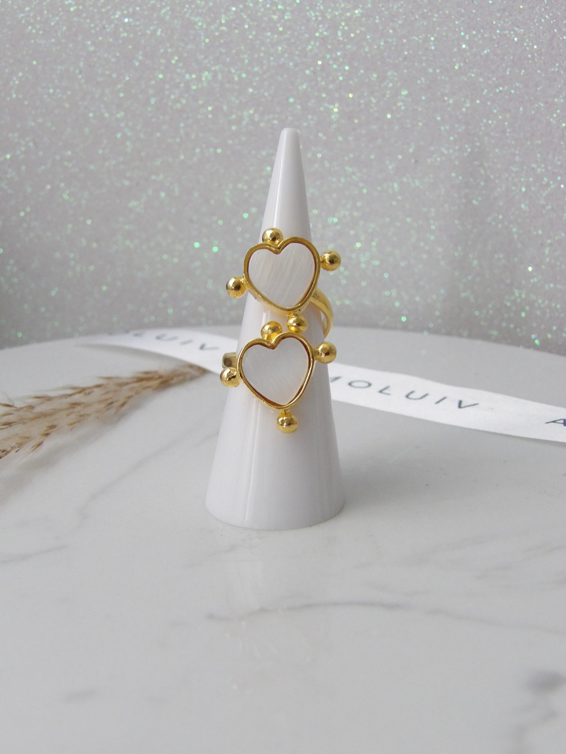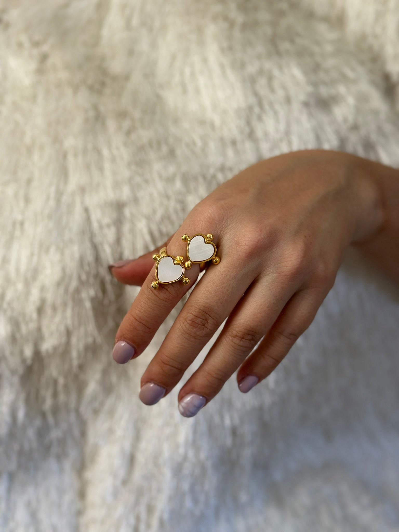 Completa tu historia de amor con nuestro Amour Glow Ring. Hecho a mano en bronce chapado en oro 24k y coronado con delicados corazones en madreperla natural, este anillo ajustable abraza tu estilo con dulzura y sofisticación. Ideal para llevarlo solo o en conjunto con su brazalete a juego.