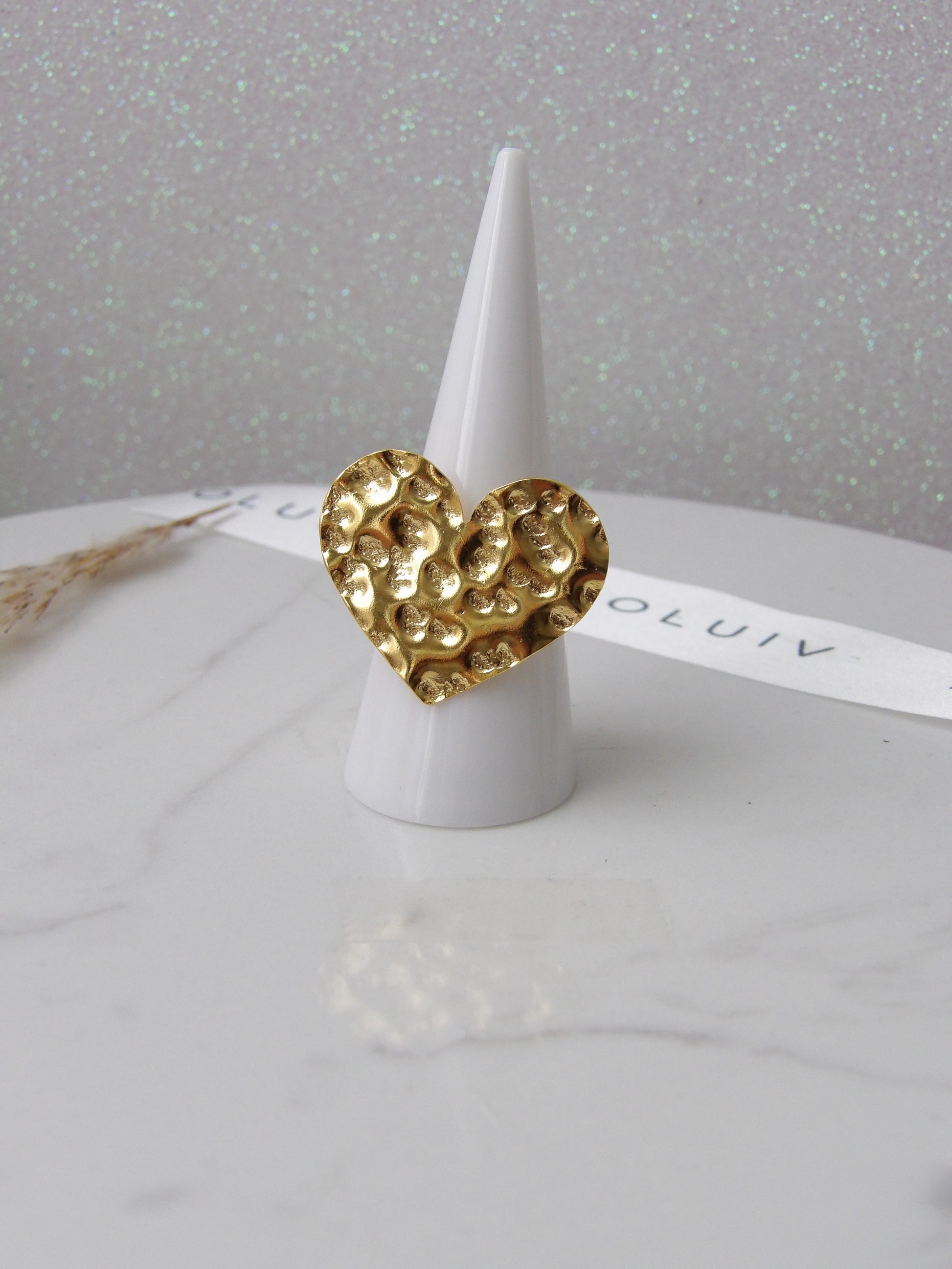 This adjustable ring, handmade in 24K gold-plated bronze, exudes character and shine. Its hammered heart-shaped design combines chic with playfulness, perfect for taking your style to the next level while remaining truly you. Wear it alone or layer it with other rings for a bold and unique look.