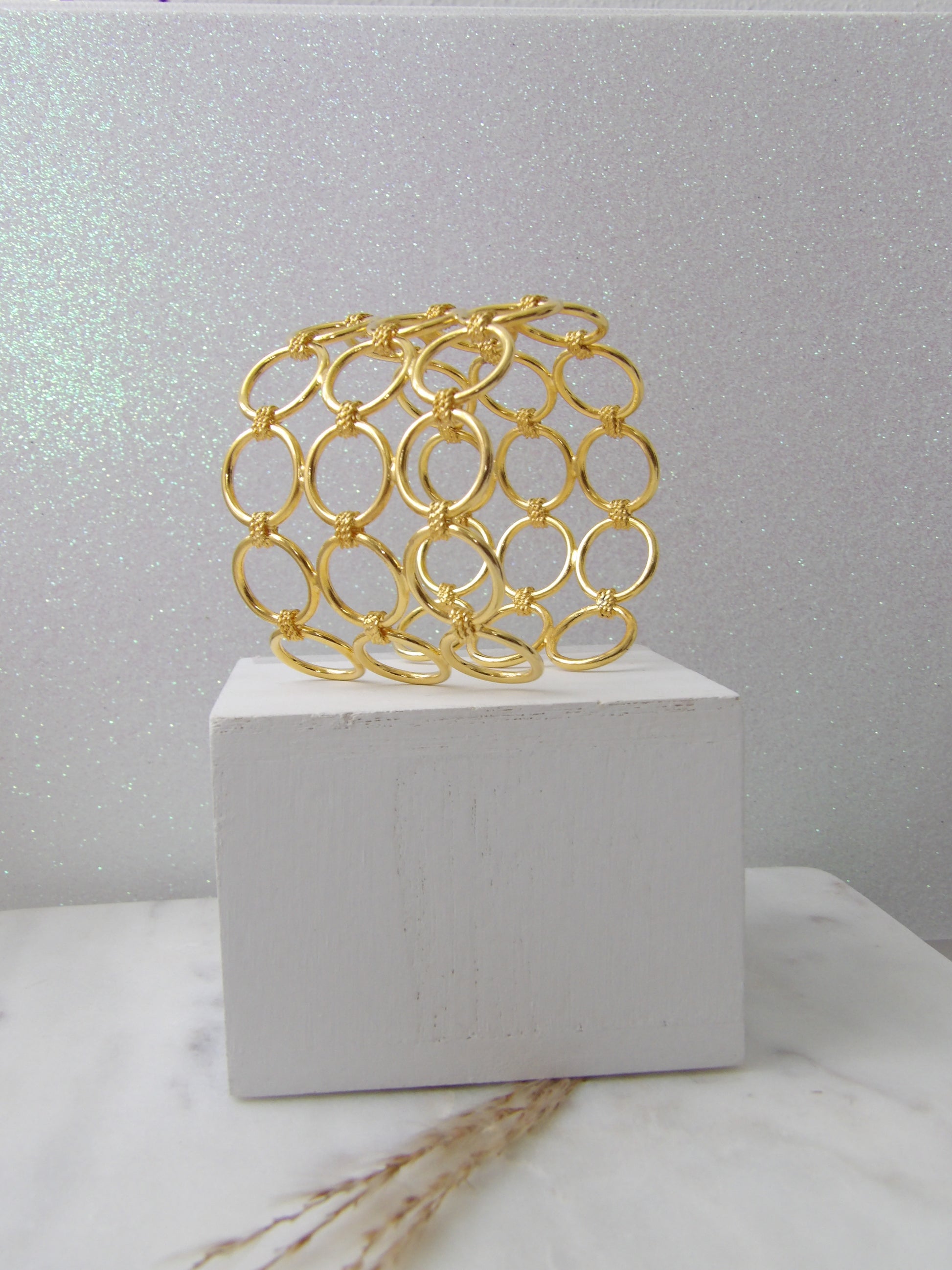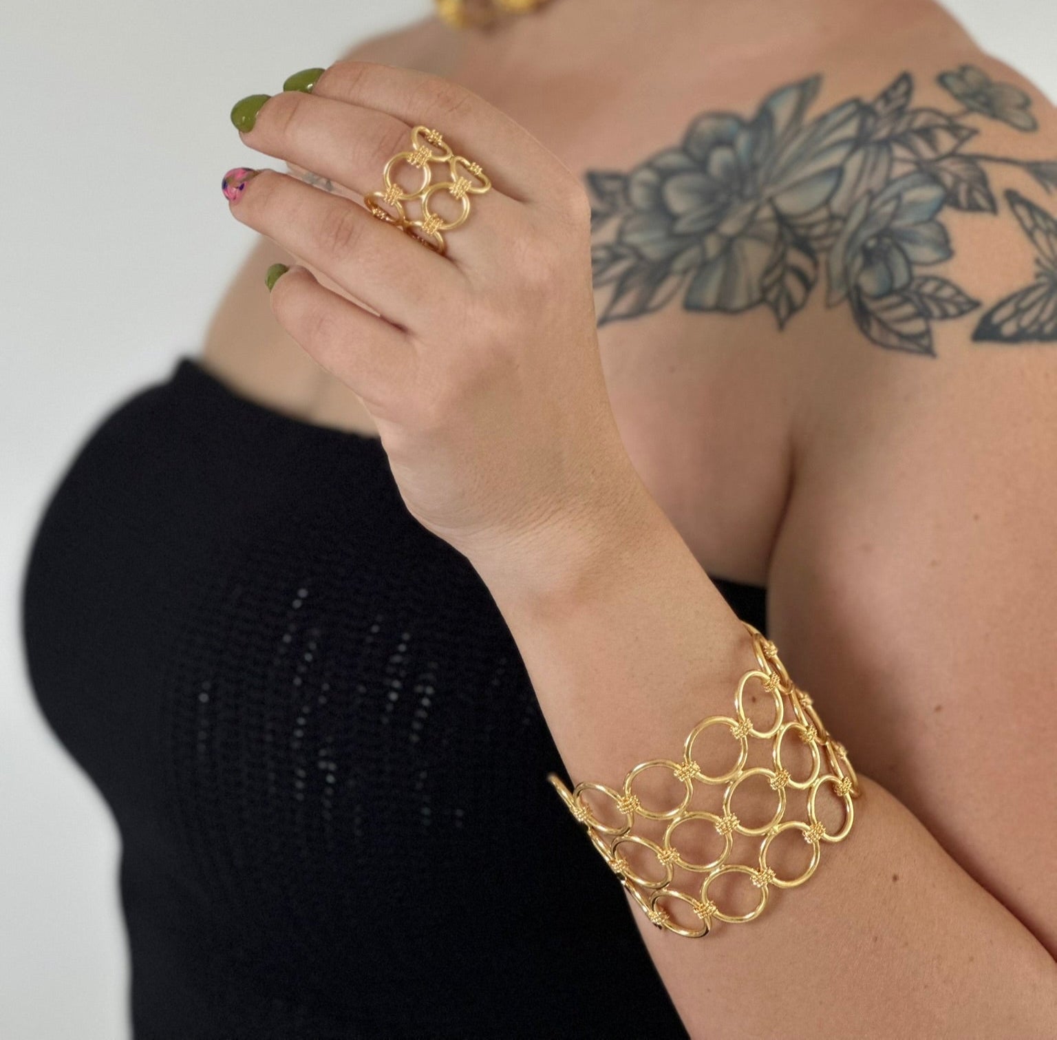 A tribute to enduring elegance. The Aurelia is a handmade piece in 24K gold-plated bronze, designed to stand out with strength and subtlety at the same time. Its structure of interwoven links creates an enveloping visual effect that caresses the skin with texture and movement. Perfect to wear alone or alongside the Aurelia ring, this bracelet is a statement of style: luminous, bold, and decidedly unique.