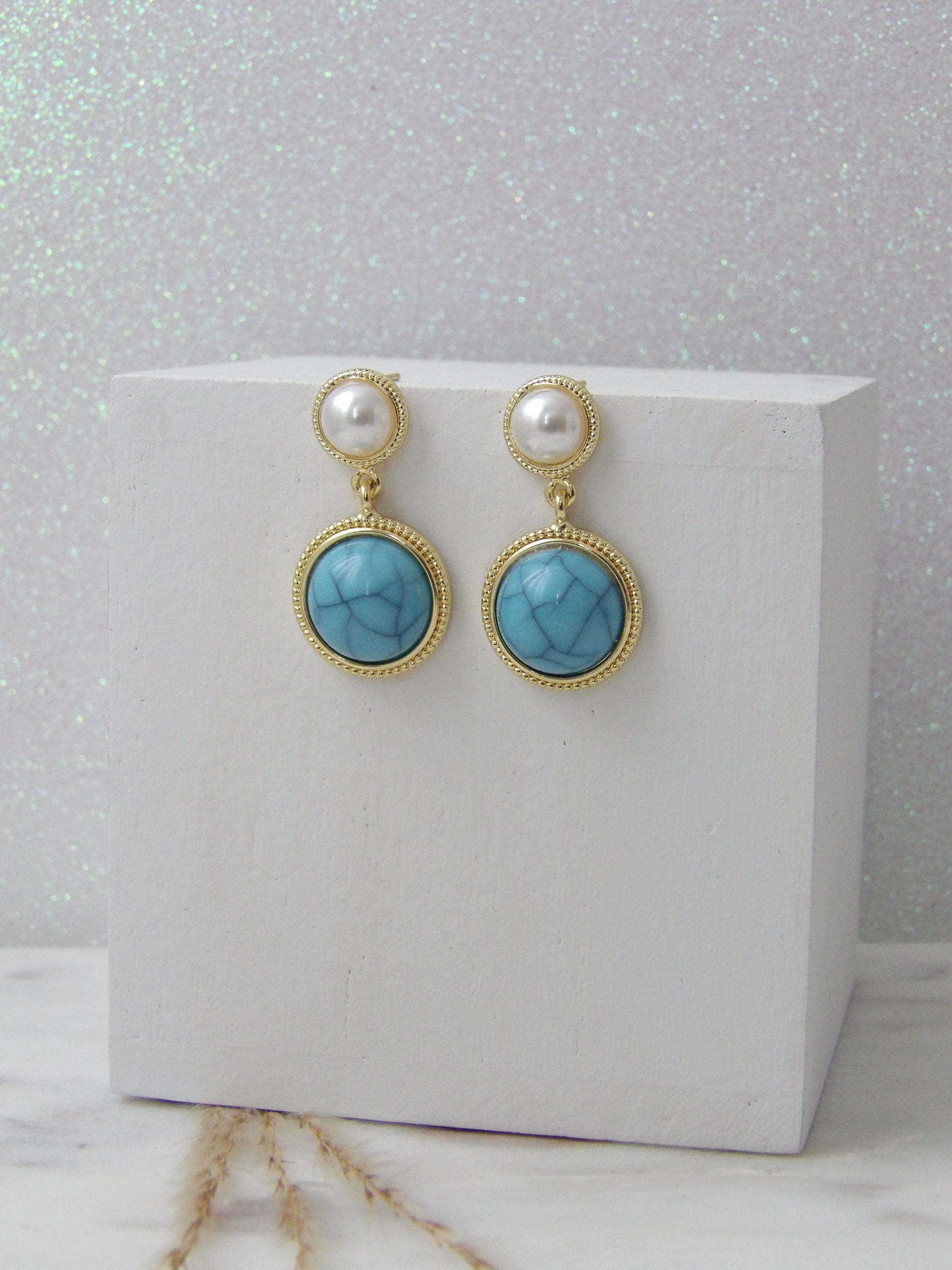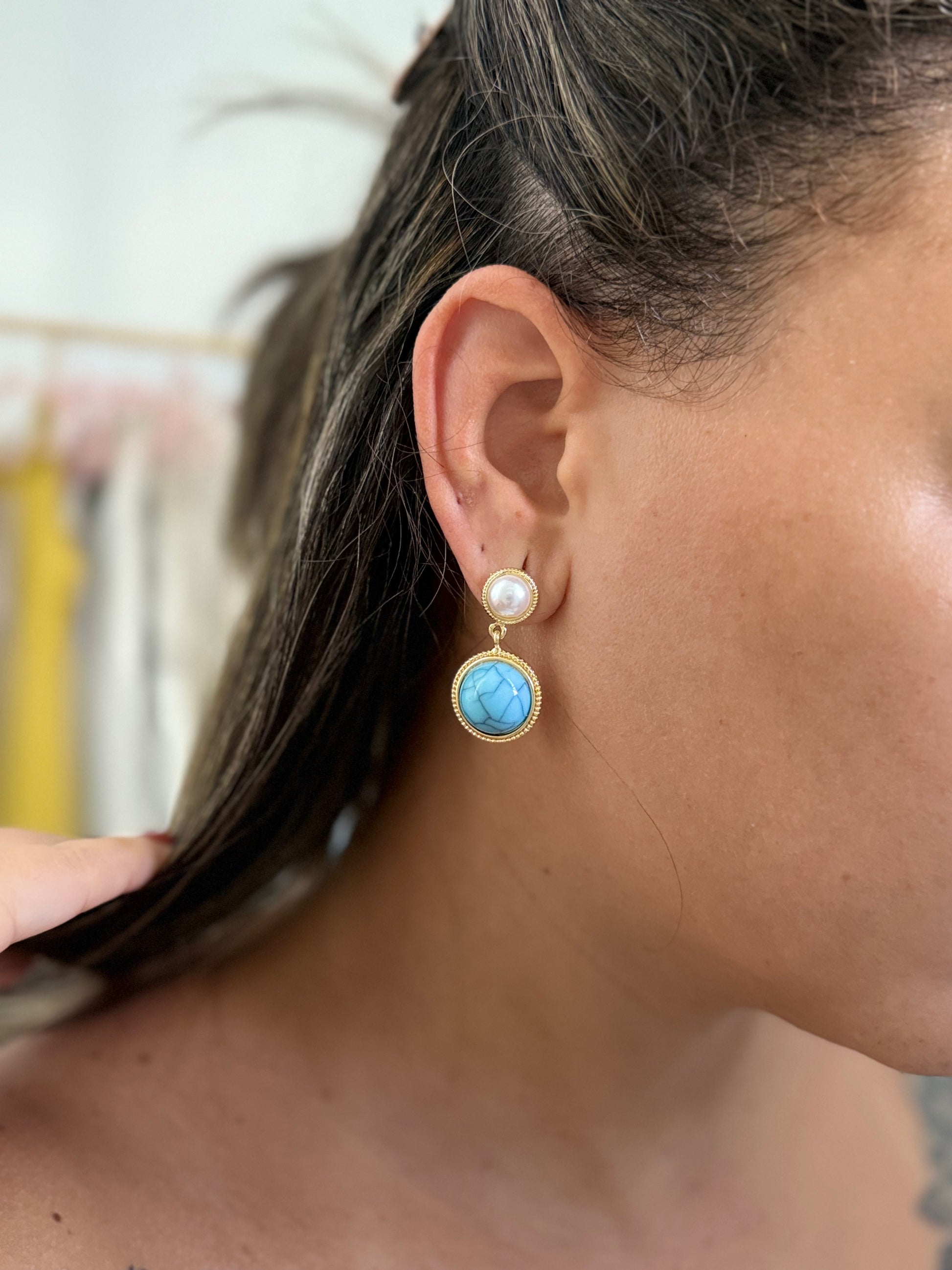 AZURÉA | Earrings with pearl and turquoise stone Fresh, elegant, and unique like you. AZURÉA combines the purity of the pearl with the magnetism of deep blue to gift you a piece that speaks of calm, strength, and beauty. Its classic design with a modern twist makes them the ideal accent for special days or to brighten up your routine. 💙 A jewel that shines with natural elegance. (RHODIUM)