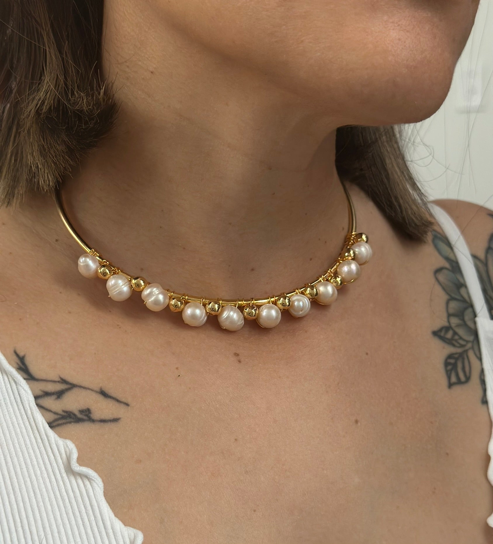Elevate your style with the ROMA CHOKER. This super sexy choker is handmade in 24K gold plated bronze with natural pearls, adding a touch of luxury to any look. Dare to be bold and stand out with this statement piece.