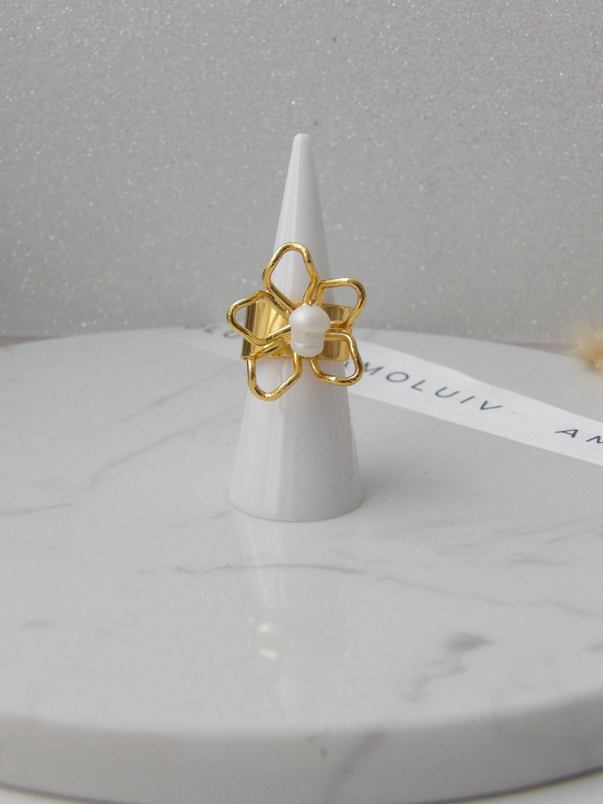 Add a touch of femininity to your style with the BLOOM BRONZE RING. The open flower design, featuring a pearl center, brings a balance of delicacy and modernity to this handmade piece. Plated with 24K gold, it radiates a luminous and poetic energy.