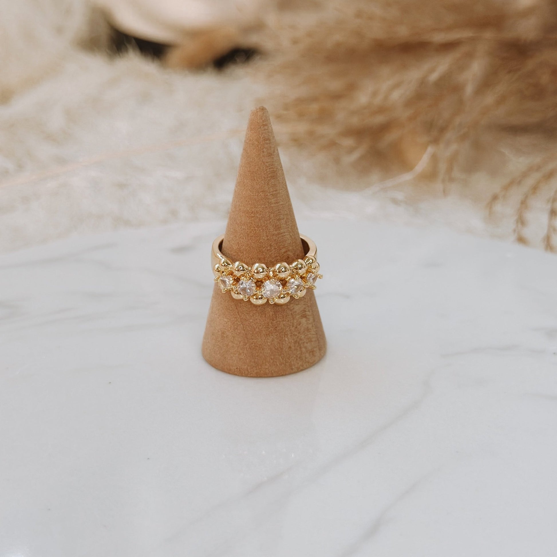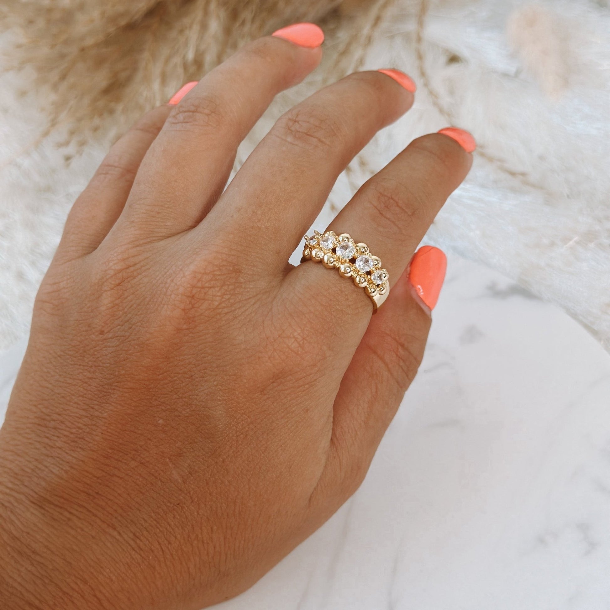 Indulge in the luxury of CLOUDS GOLD RING. This elegant piece features a rhodium finish for a sleek and sophisticated look. The adjustable design ensures a perfect fit, while shimmering zircons add a touch of glamour. Elevate any outfit with this exclusive and tasteful accessory.