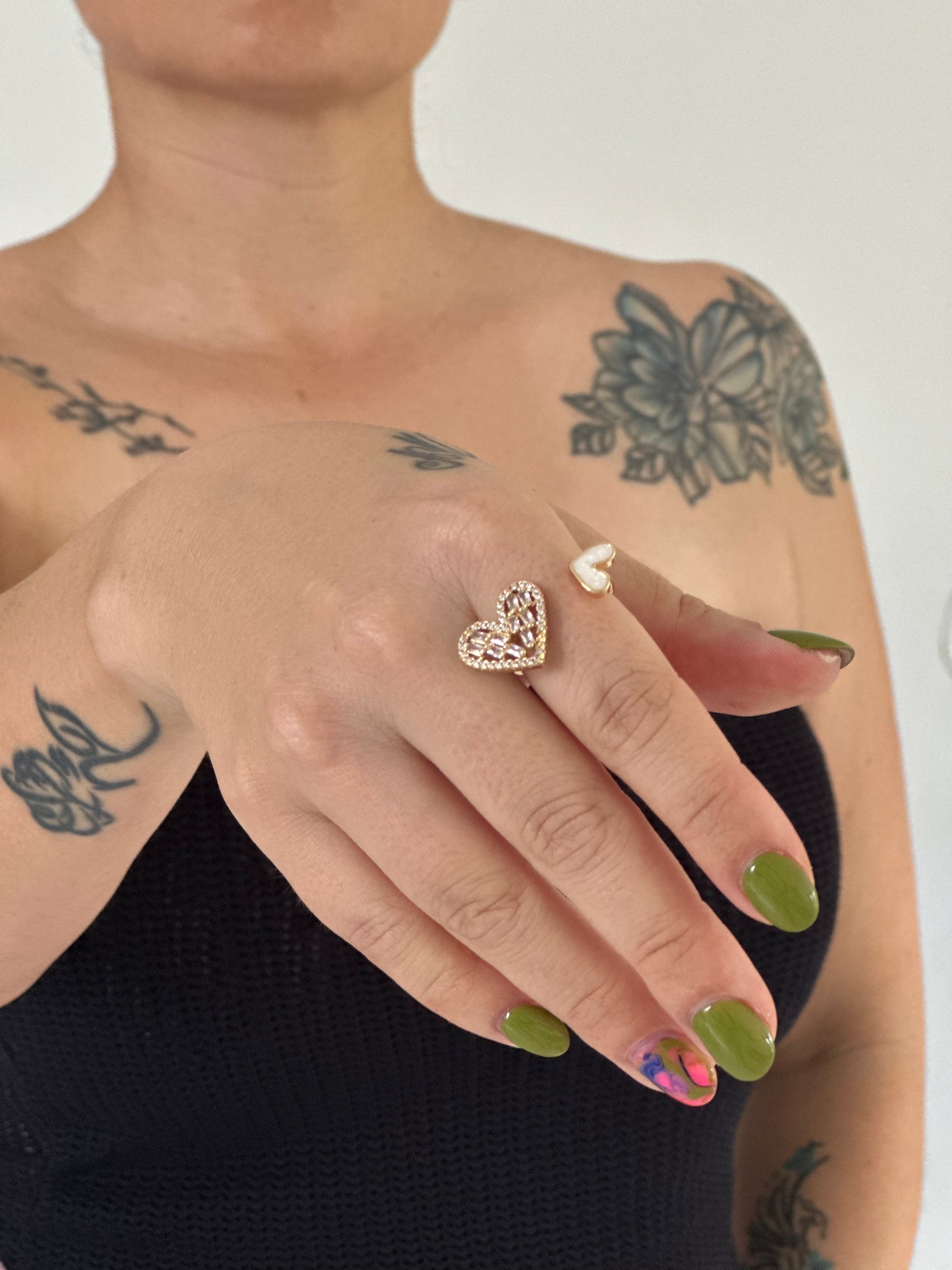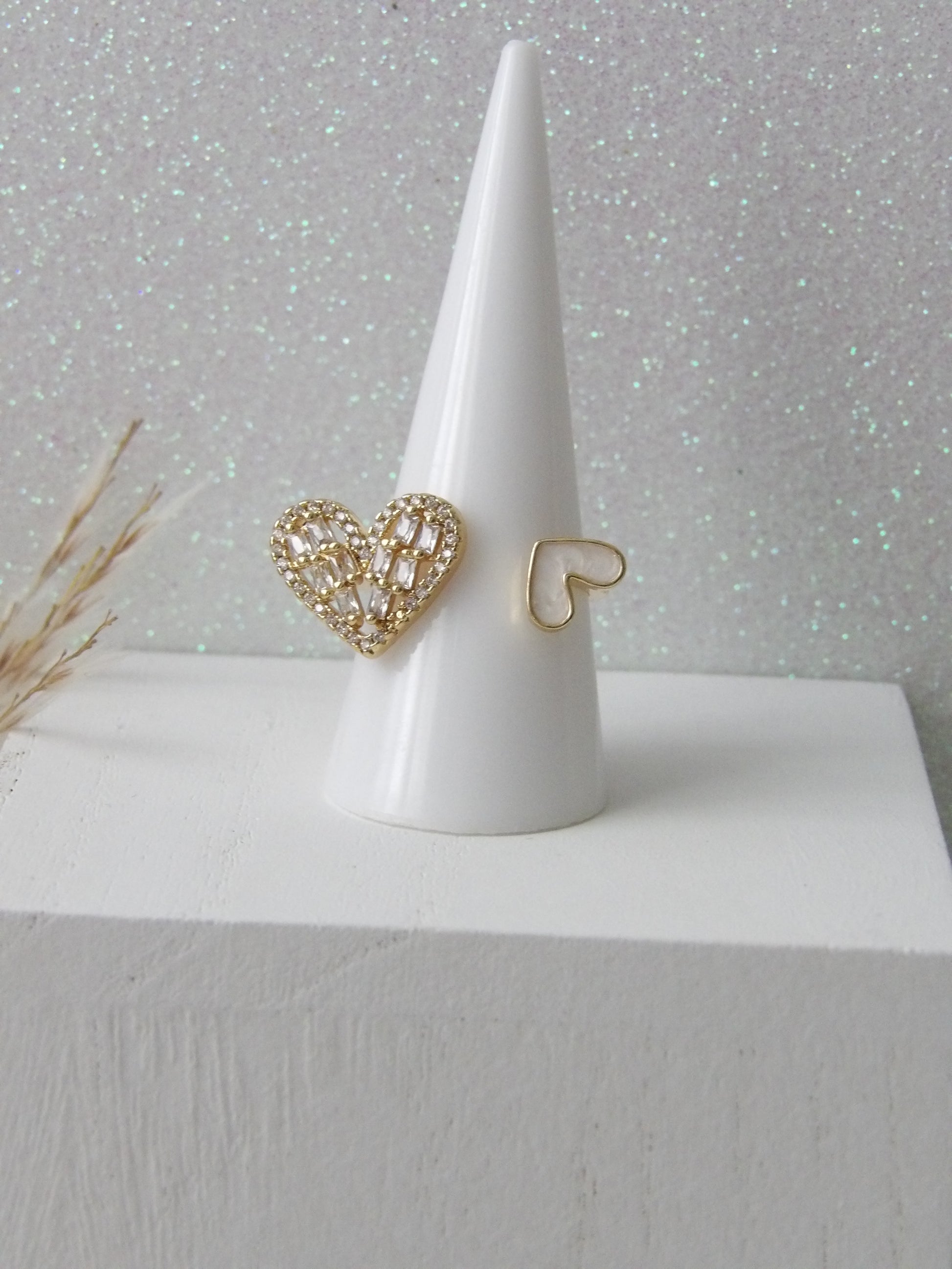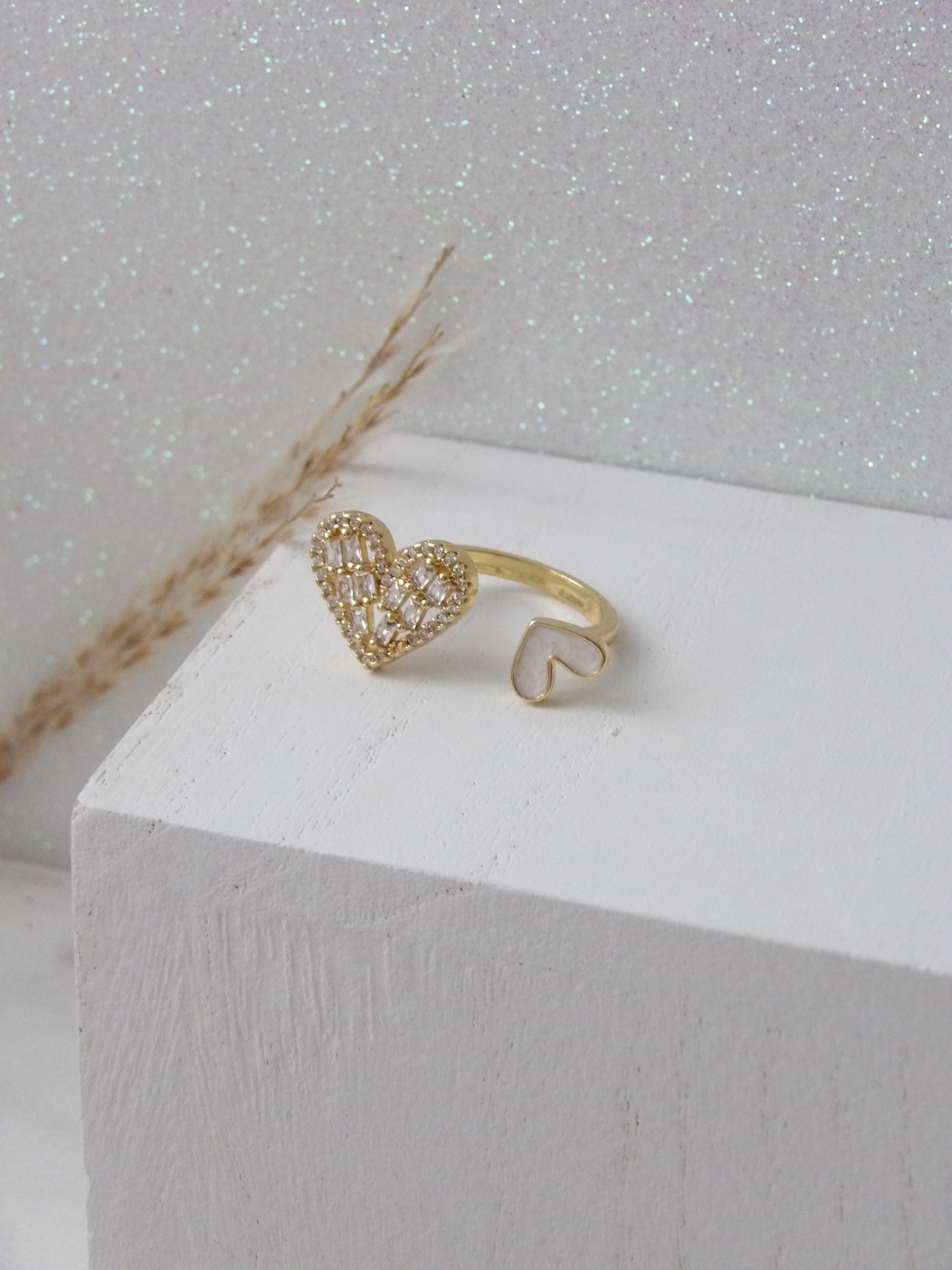 CŒUR LUMIÈRE | Adjustable Ring in Rhodium with Double HeartTwo hearts, one single intention: to shine with love.Cœur Lumière is an adjustable ring with an open design that celebrates delicacy and inner light. One shining heart with zirconia inlays and another more subtle in a mother-of-pearl tone come together in a design that softly and charmingly wraps around your finger.✨ A jewel to remind you that you deserve to shine… with love and without fear.