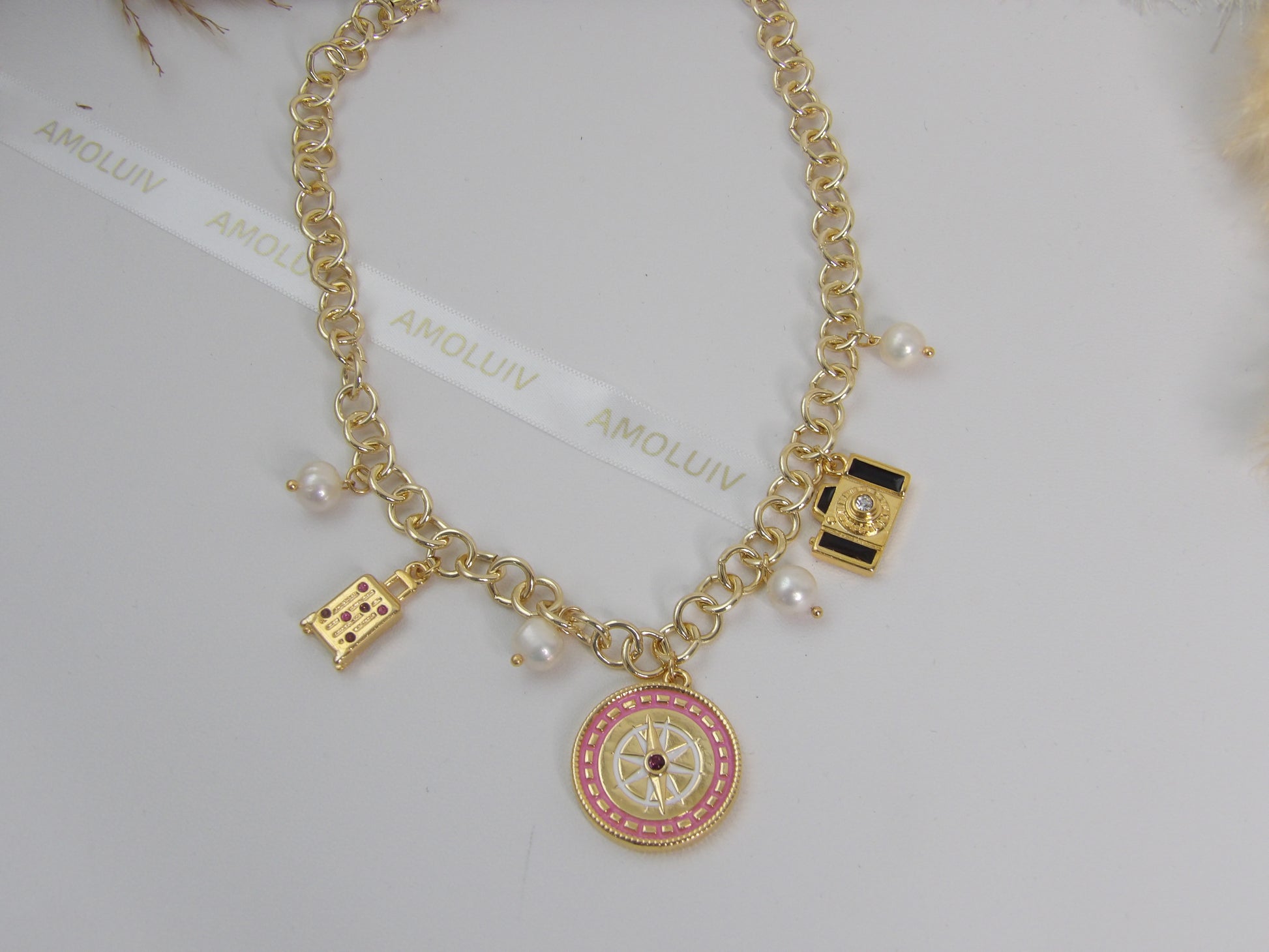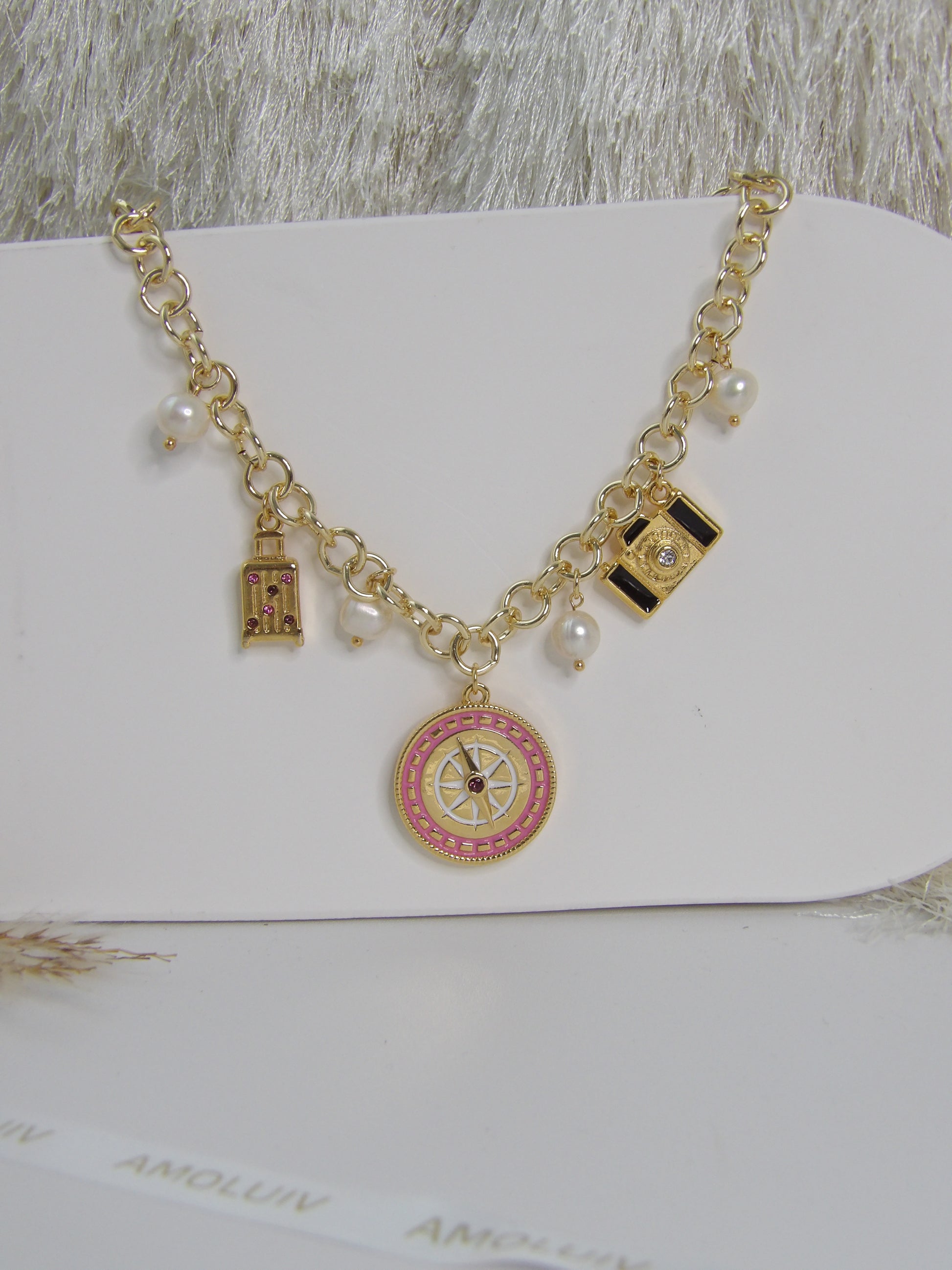 Experience the magic of travel with our DREAMY ESCAPE NECKLACE GOLD. This elegant piece features a delicate rhodium chain adorned with a compass rose, pearls, a camera, and a suitcase charm. A must-have for any travel lover, it's like wearing an adventure journal around your neck! ✨