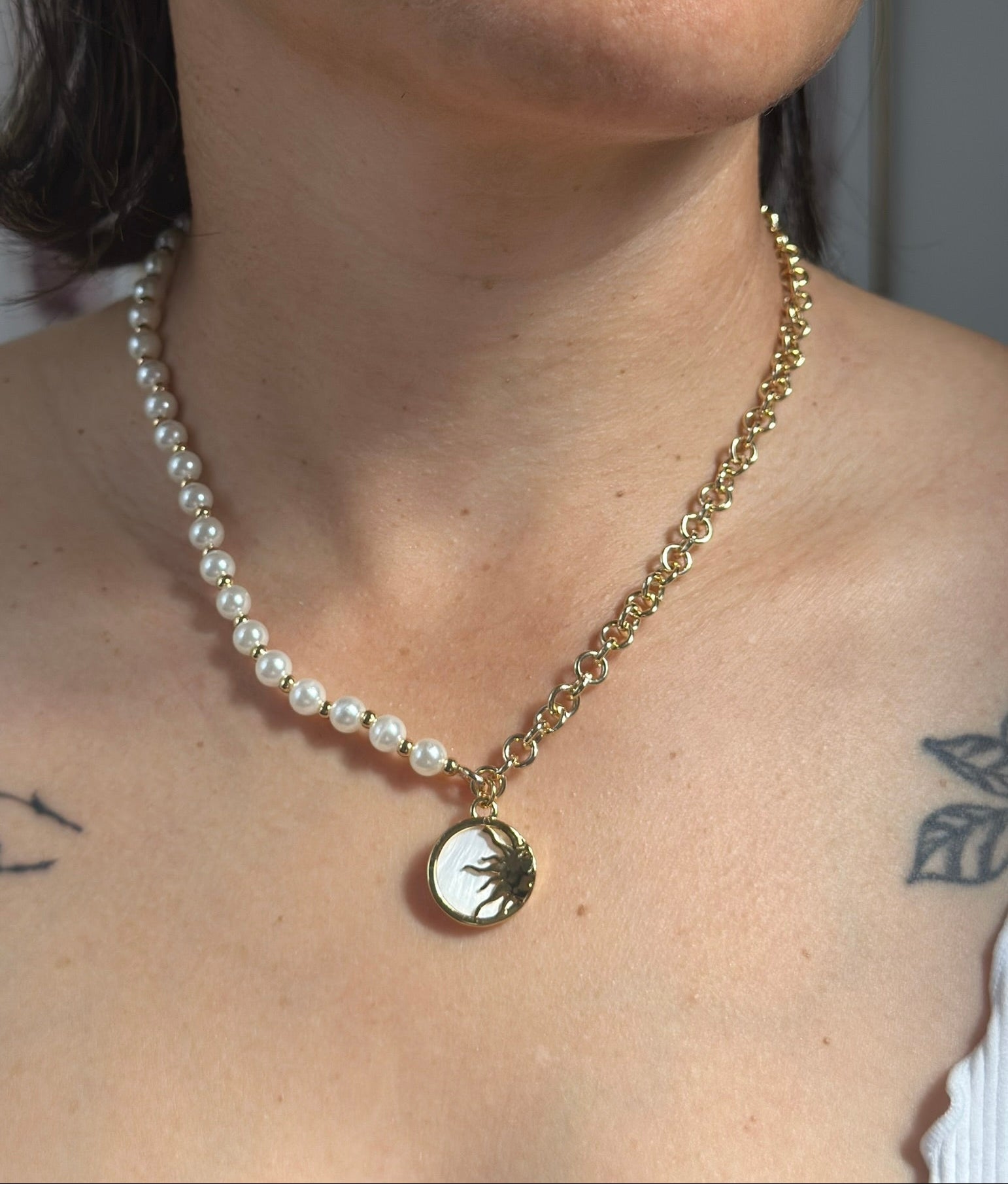 Introducing the Eclipse Necklace, a golden delight adorned with lustrous pearls. This playful piece will elevate any outfit with its unique combination of gold and pearls. Whether you're dressing up or down, the Eclipse Necklace is sure to make a statement.