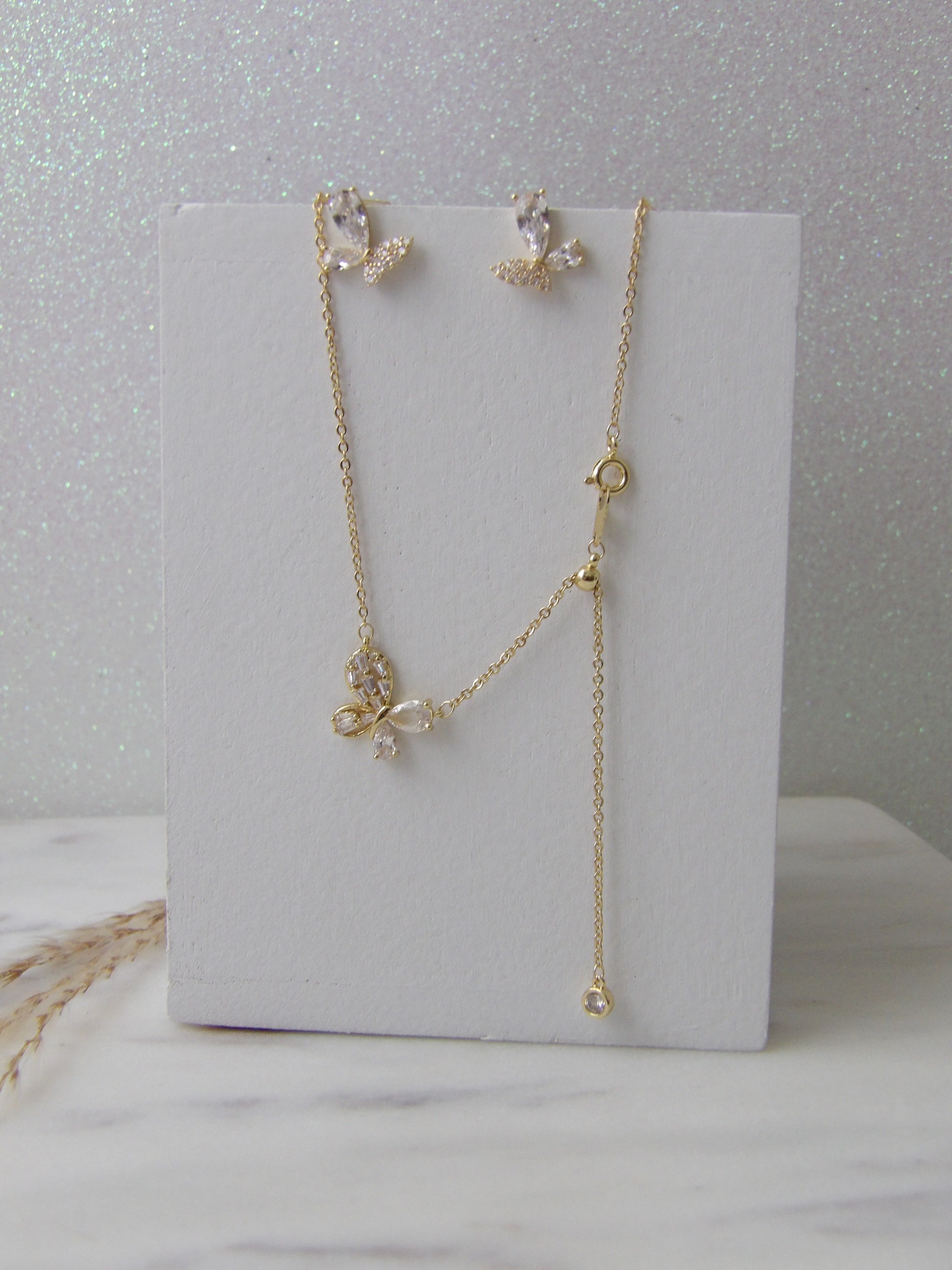 Long necklace and earrings set in rhodium with butterfly-shaped zirconias. Lightness, movement, and shine. The Élan Set captures the essence of femininity with an ethereal design that combines delicacy and sensuality. The asymmetrical necklace with a long drop adds an unexpected and seductive touch, while the zirconia butterflies elevate the ensemble with a sense of natural elegance. Perfect for a look that soars high… and leaves a mark.