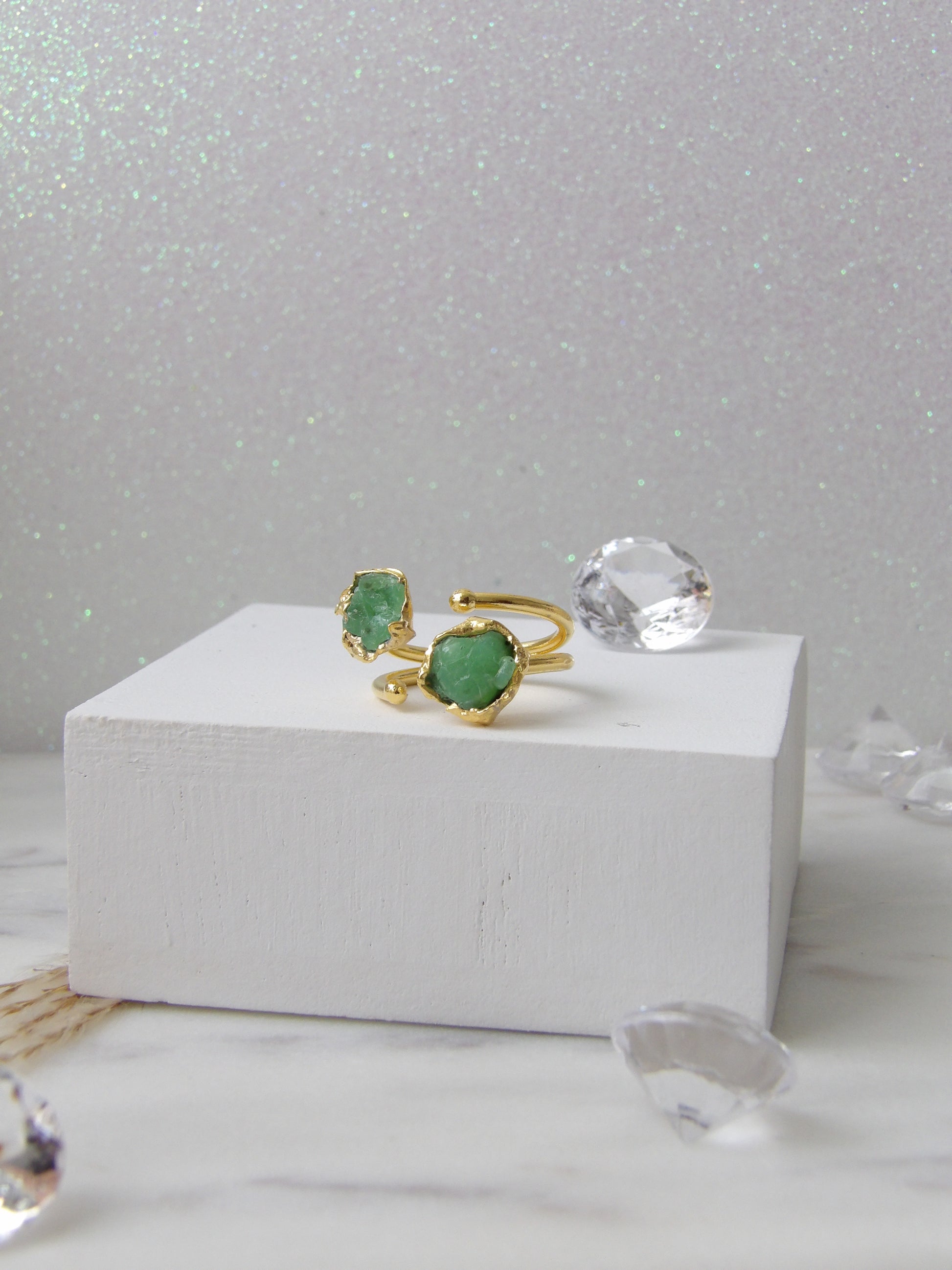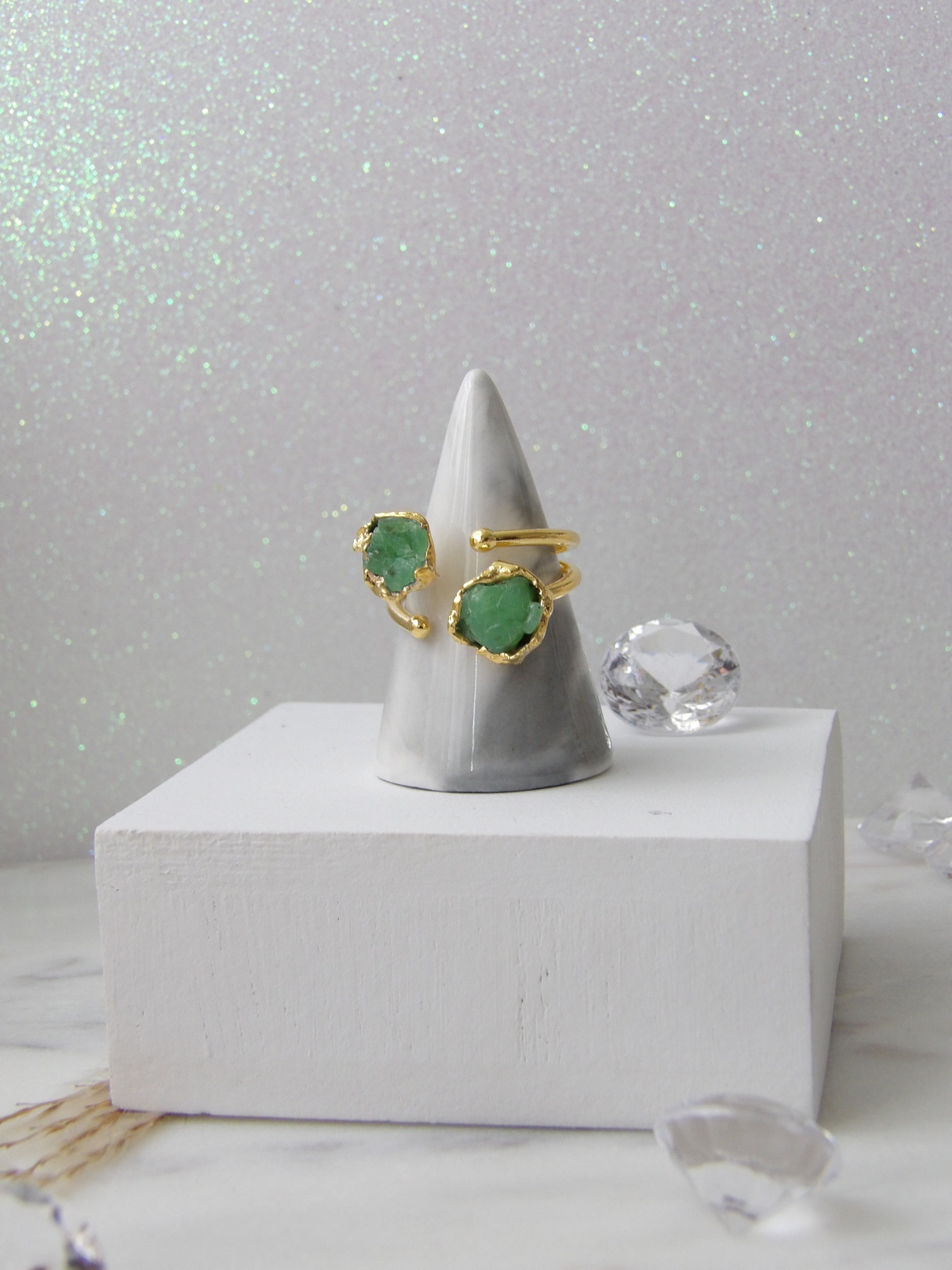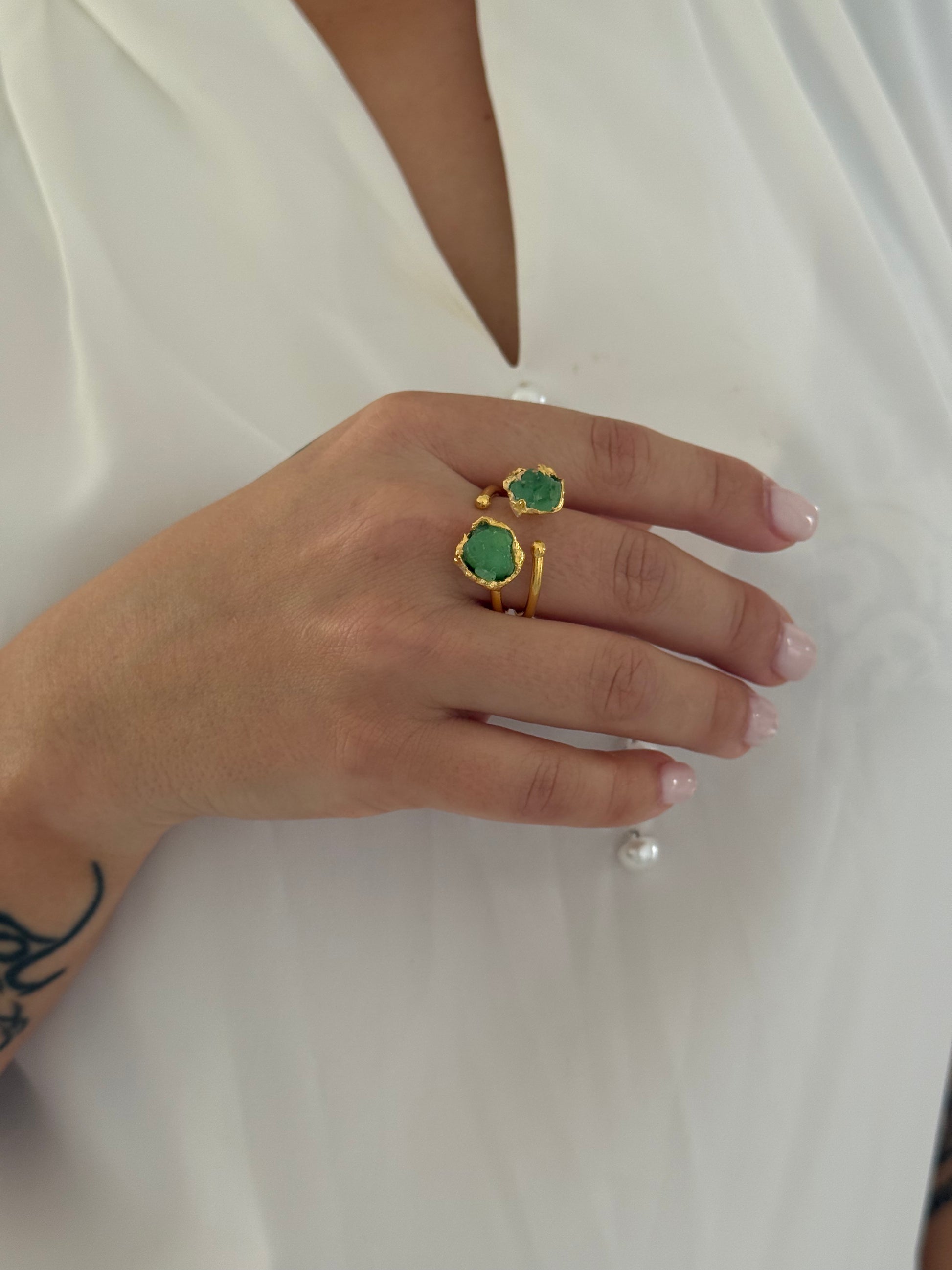 The Esencia Verde Ring combines the shine of bronze with the organic strength of green druzy stone, achieving a fascinating and elegant contrast.