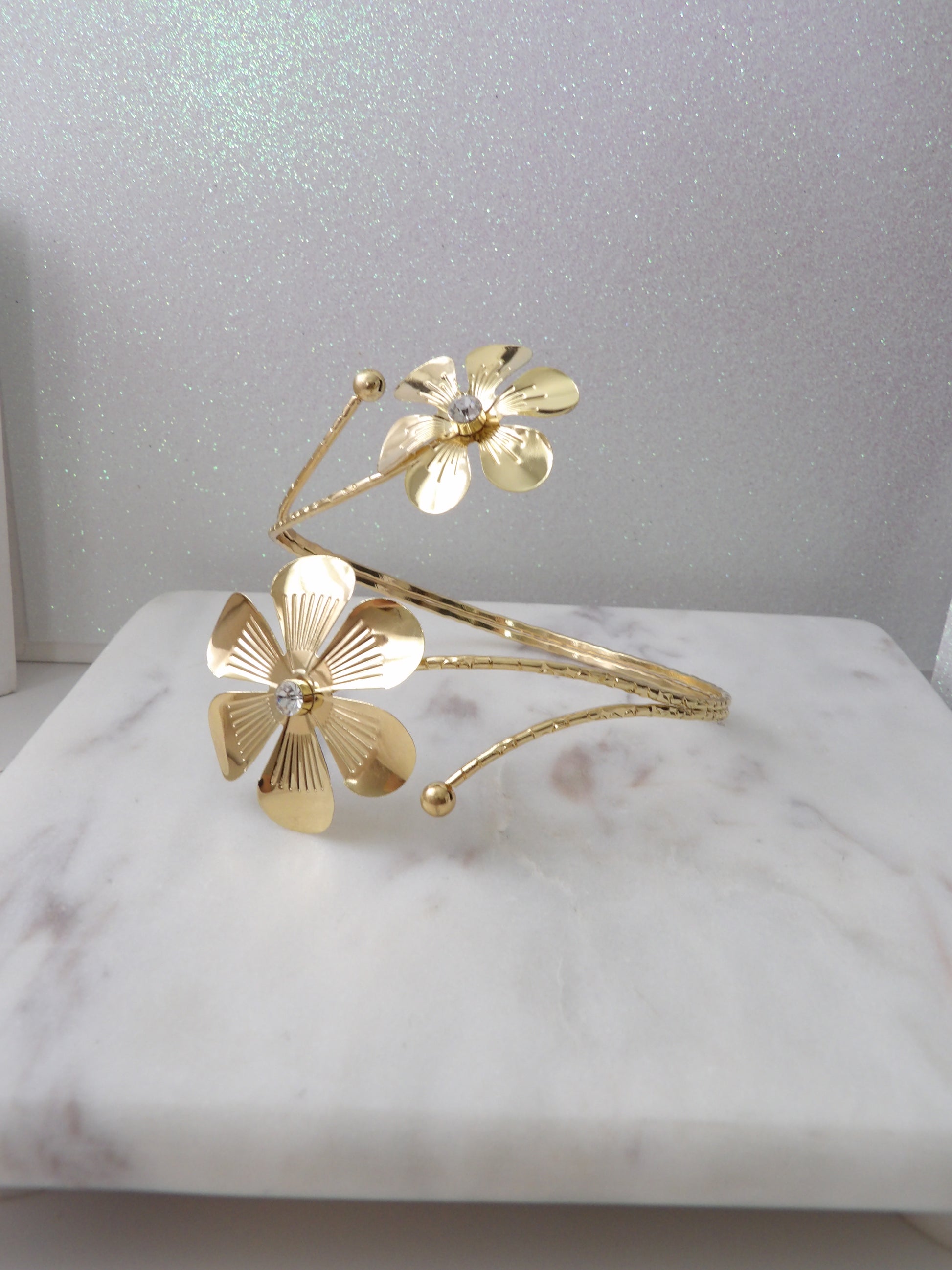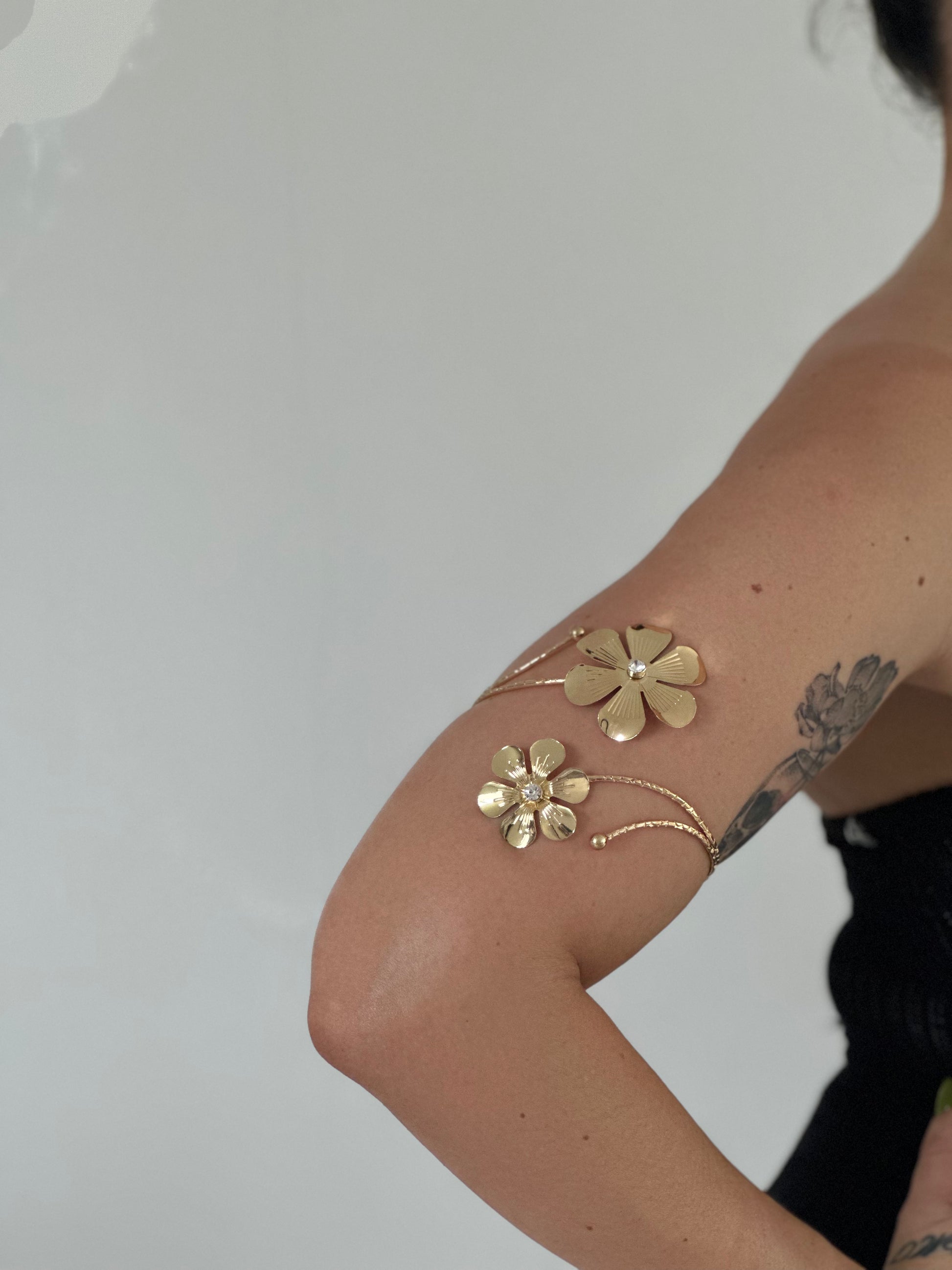 A secret garden that embraces your skin. This arm bracelet, crafted in rhodium with a bright floral design, combines charm and sophistication in a piece that speaks for itself. Adjustable and lovely, it is perfect for elevating any look with an unexpected and chic touch. ✨ Wear it on your bicep and let your style blossom.