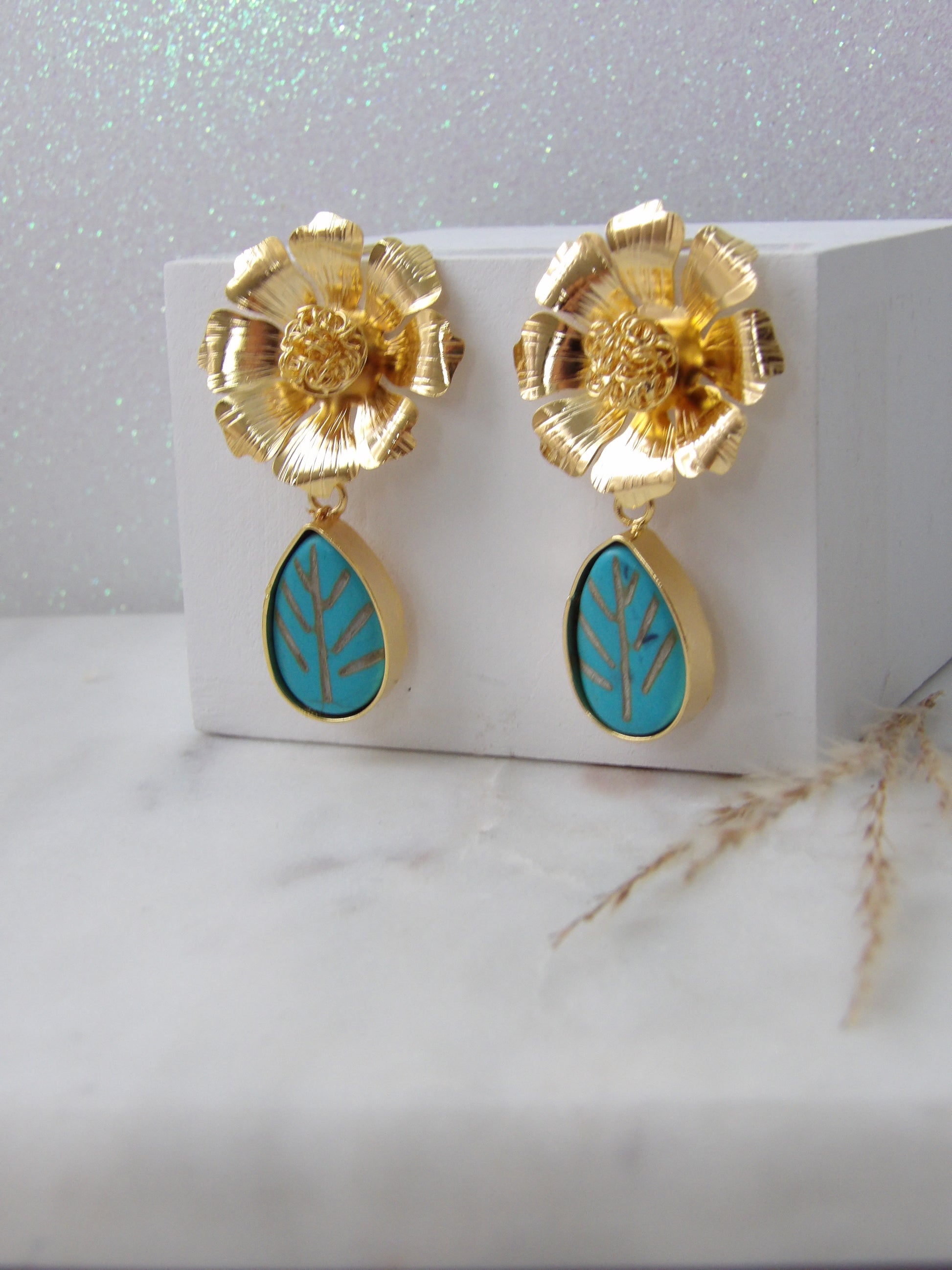 A meeting between nature and sophistication. The Flor de Agua Earrings combine the golden sparkle of a hand-sculpted flower in 24k gold-plated bronze, with a touch of turquoise in the shape of a drop, inspired by the freshness and purity of water. A lightweight, vibrant, and exclusive design, perfect for elevating your look with a tropical and elegant touch. Wear them and feel your style bloom.