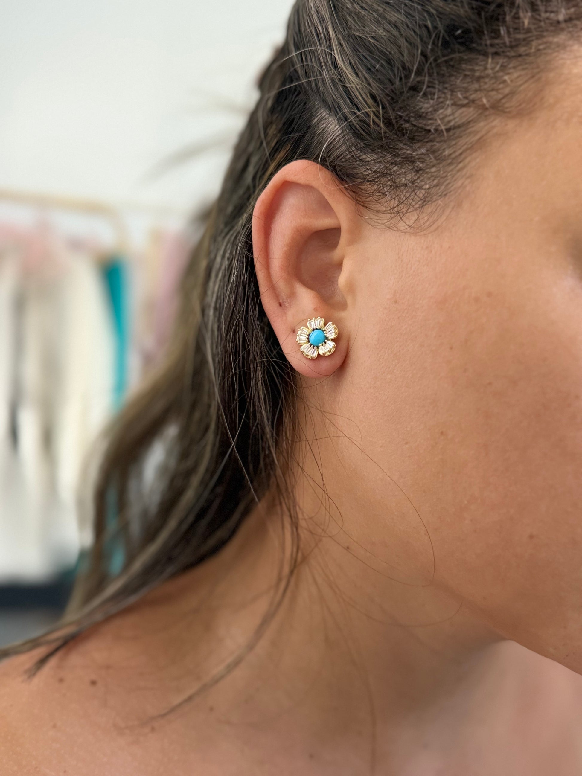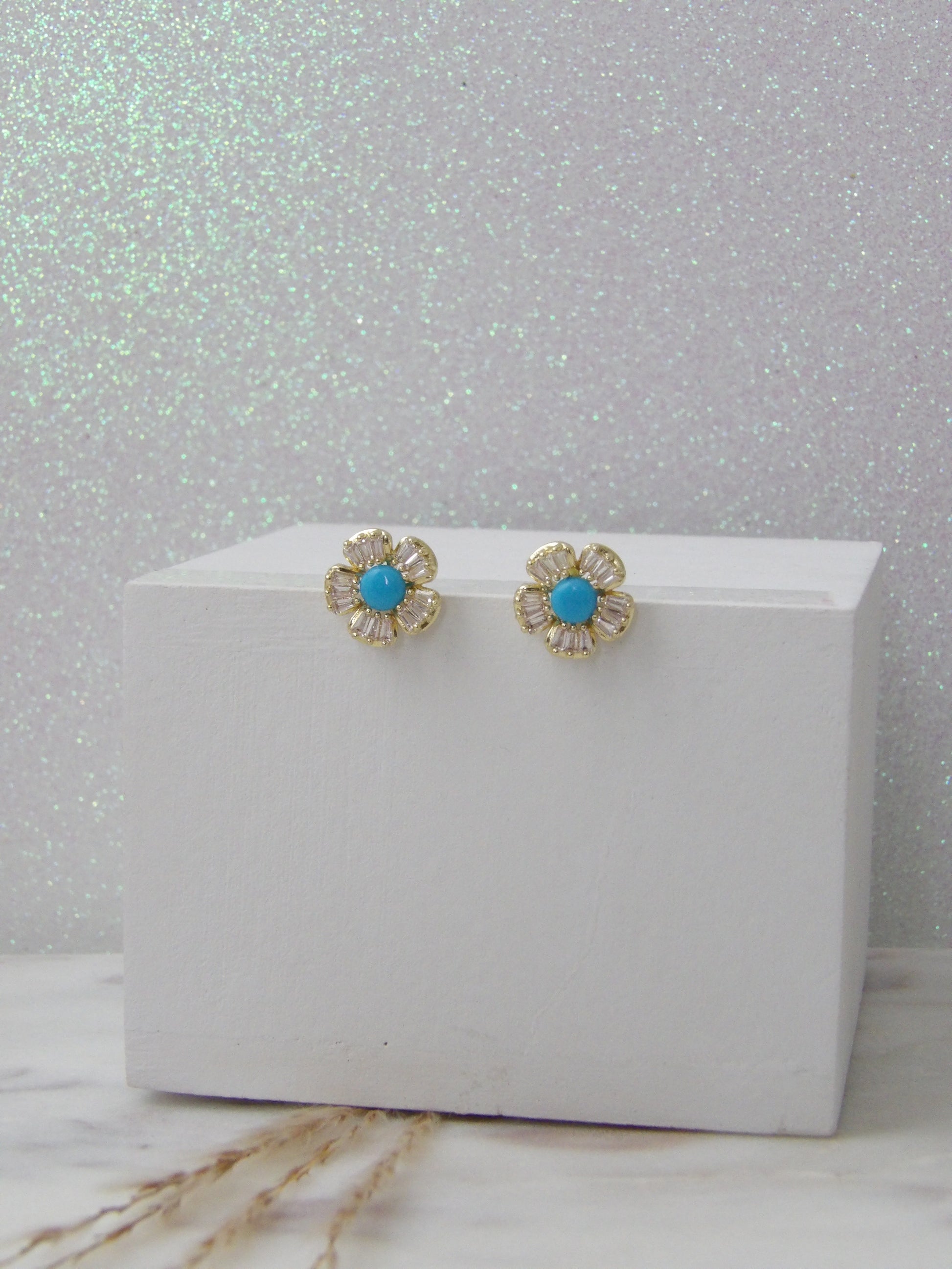 FLORÉA | Floral earrings in rhodium with zirconia and turquoise accent A design that blooms with elegance. FLORÉA combines the freshness of turquoise with petals full of sparkle to bring to life a pair of earrings that do not go unnoticed. Lightweight, sophisticated, and full of charm, they are made to enhance your natural light. 🌸 Jewelry that blooms with you.