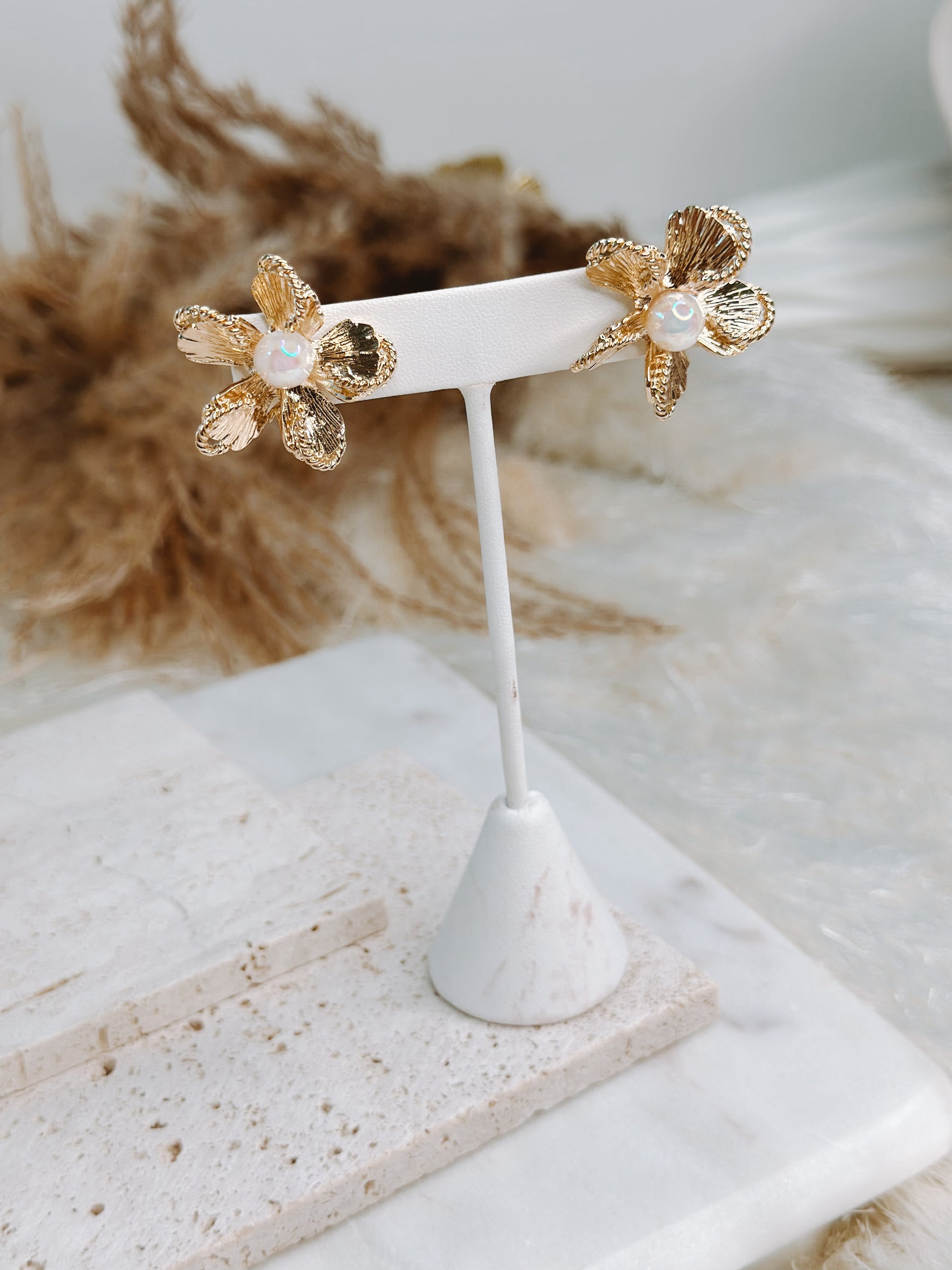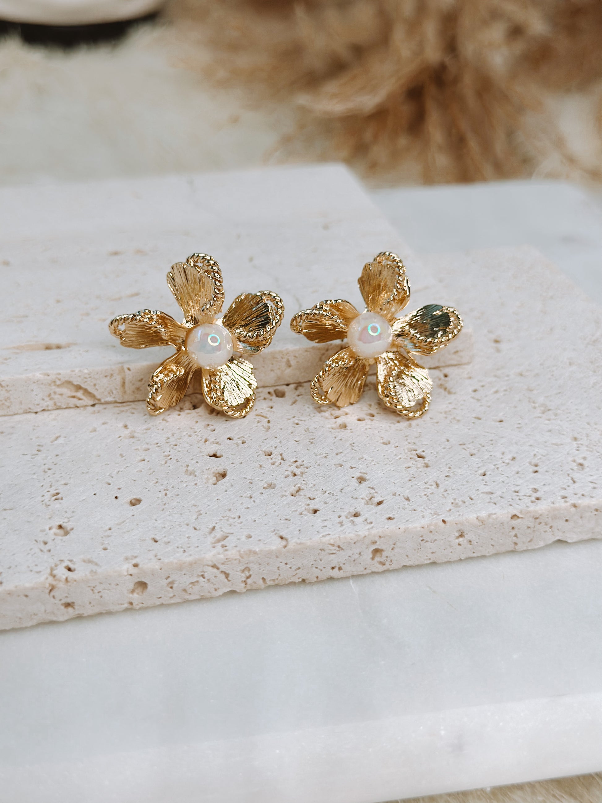 Add a touch of elegance with our FLOWER PEARL GOLD EARRINGS. These exquisite earrings feature delicate goldfield material and intricate detailing, making them the perfect accessory for any special occasion. Elevate your style with these luxurious and exclusive earrings.