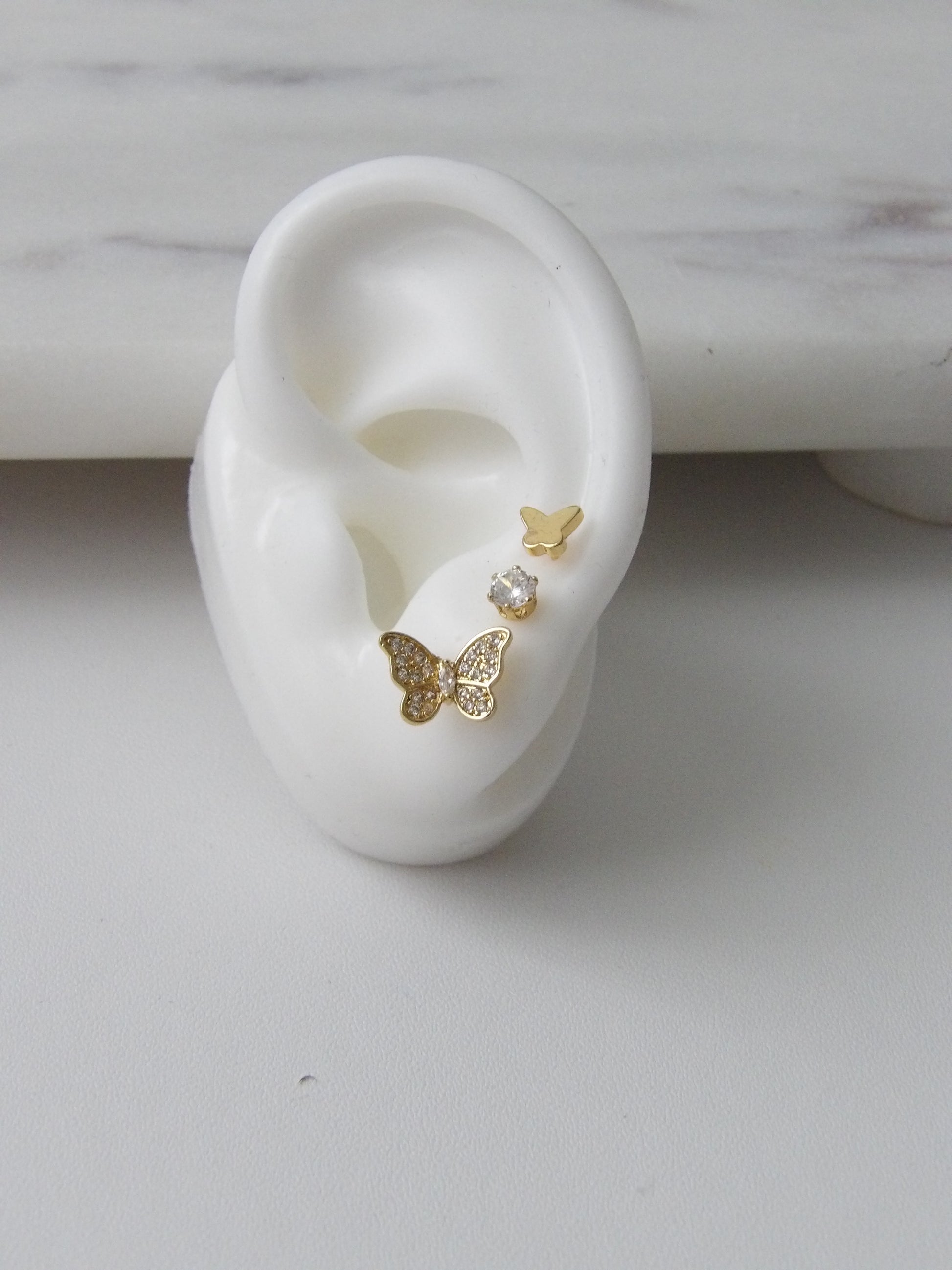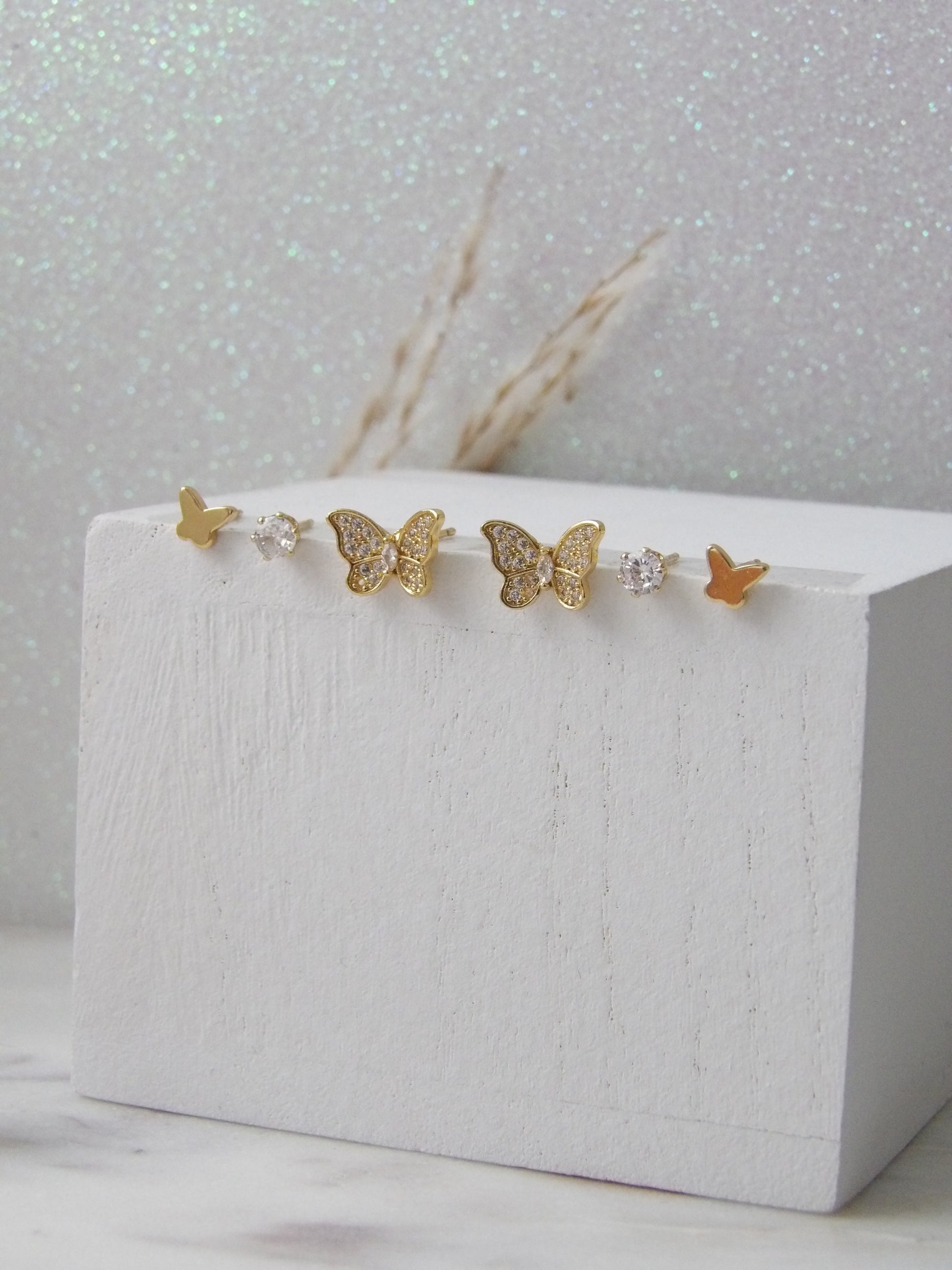 FLUTÉE | Gold Rhodium Earring Set (6 pieces)Delicacy that flies with you.Flutée is a charming set of stud earrings in gold rhodium, featuring shiny butterflies, crystals, and minimalist touches. Designed to combine with each other or worn asymmetrically, this set celebrates freedom, softness, and the beauty of small details. ✨ Subtle, versatile, and absolutely delightful.