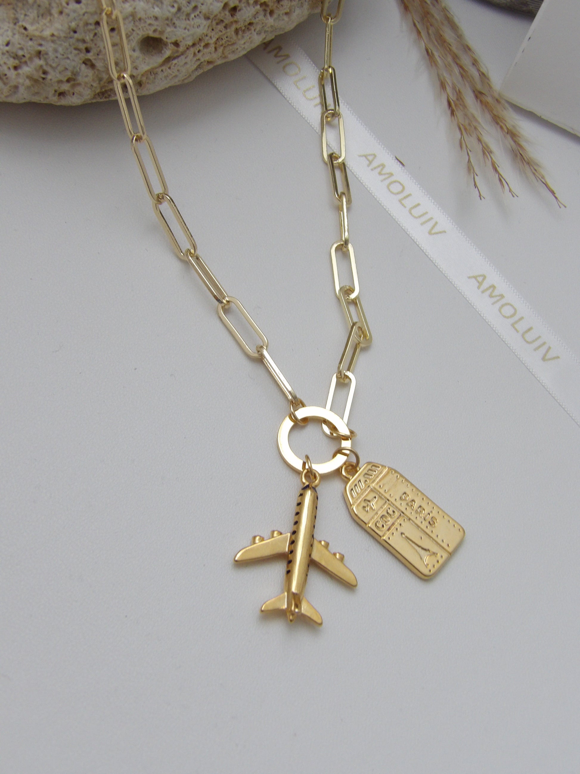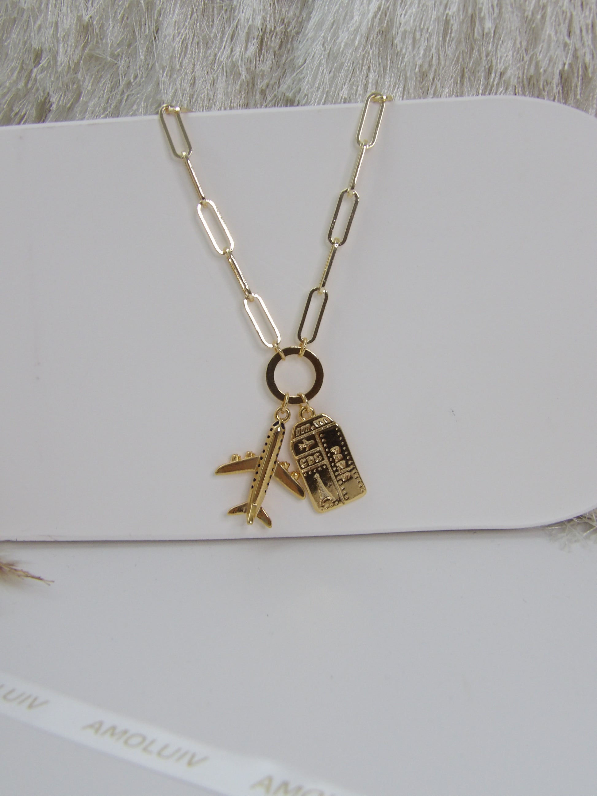 Unleash your inner adventurer with the GOLDEN GETAWAY NECKLACE. Made with striking rhodium and adorned with plane charms and a travel ticket, this piece is the perfect accessory for any risk-taker. Wear it as a reminder to always seek out new experiences and embrace the thrill of the unknown!