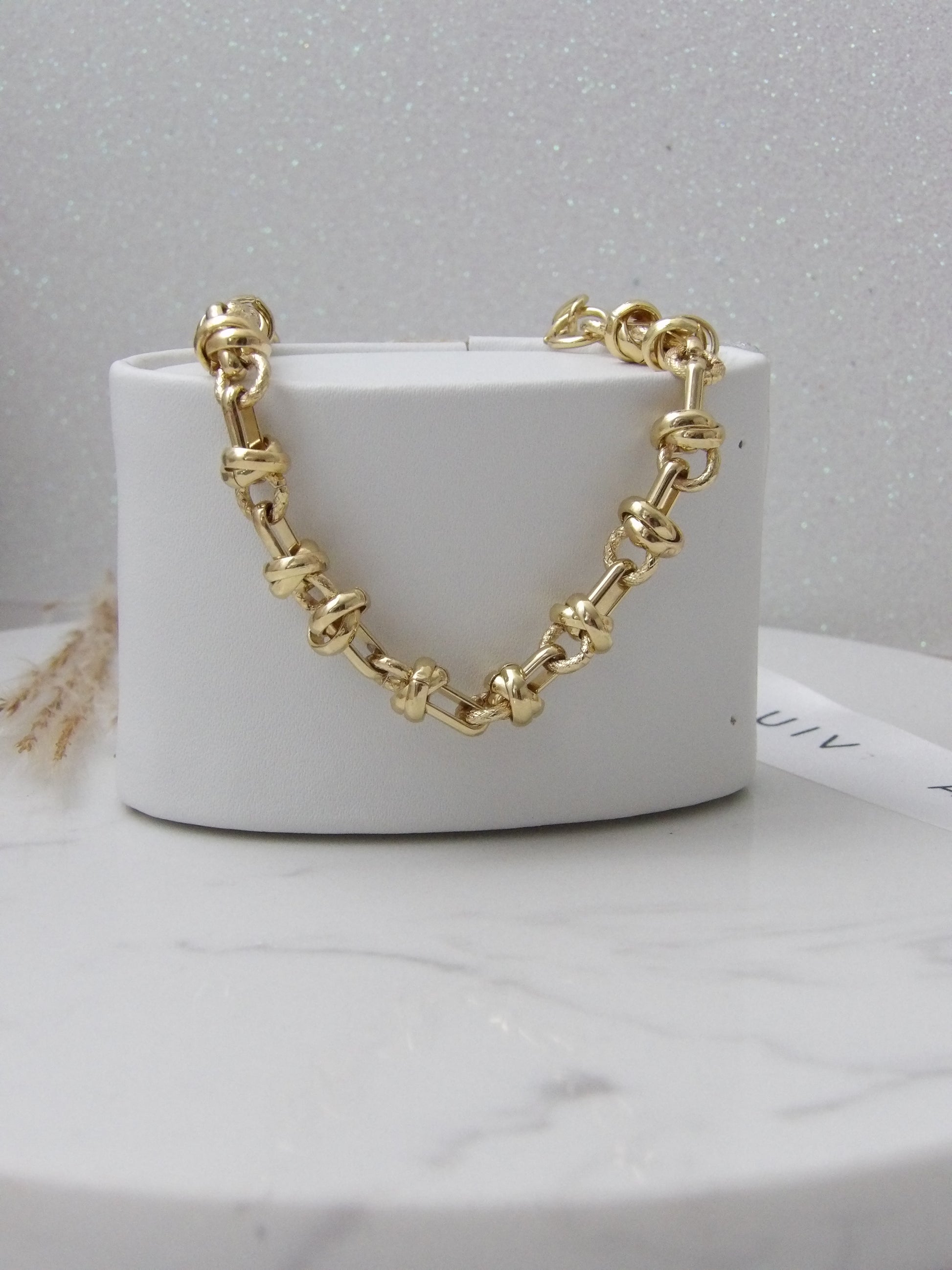 This bracelet has a very refined and geometric structure, with a classic yet modern design, ideal for a woman who appreciates timelessness with a touch of originality. The gold-plated rhodium finish makes it even more sophisticated.