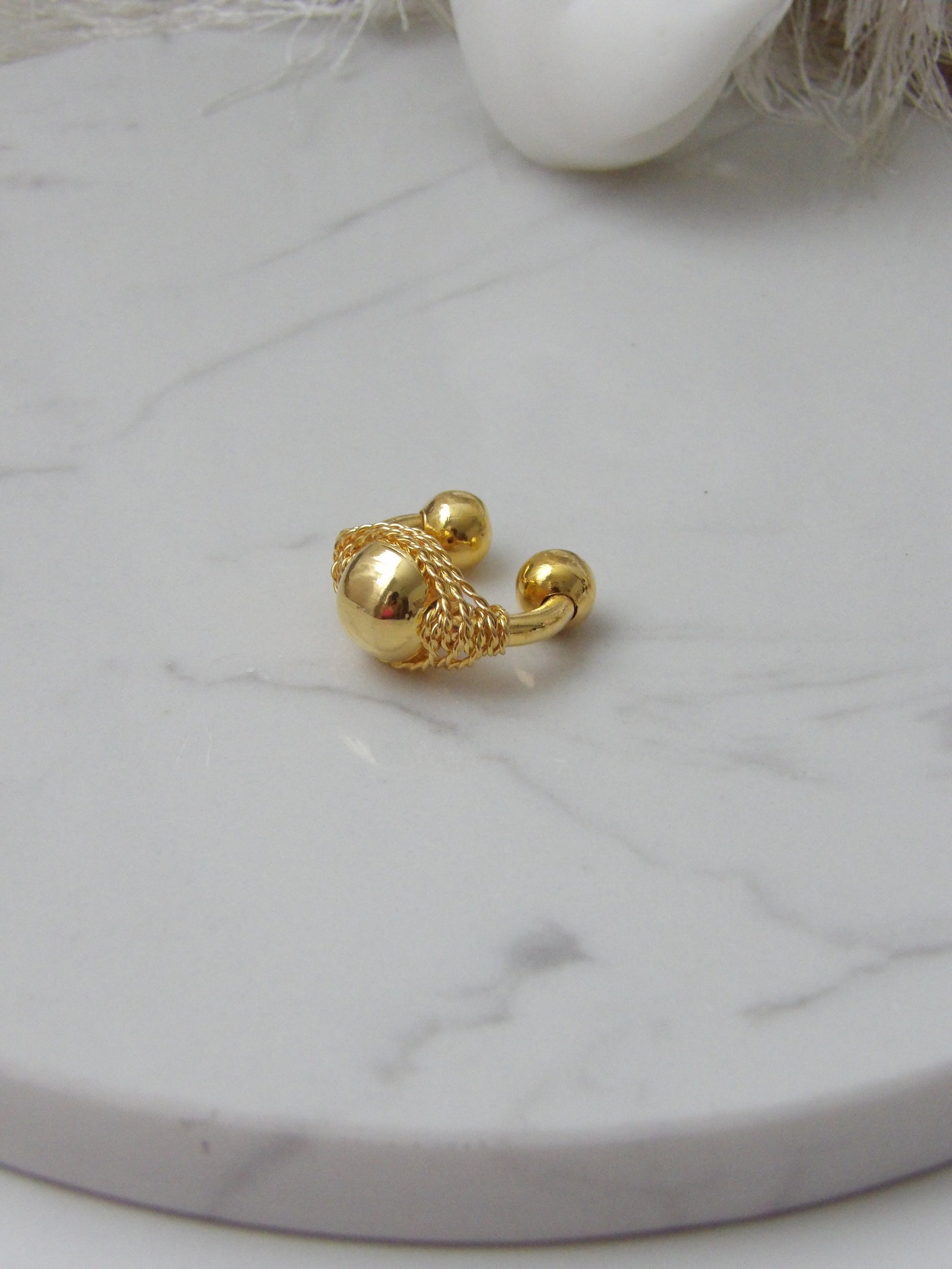 Elevate your style with our GOLDEN ORB BRONZE EAR CUFF. Handmade and 24K gold plated, its robust and textured design exudes power and elegance. With a polished center, this cuff is perfect for a modern, sculptural look. Make a statement and stand out with this unique piece, no piercings required.