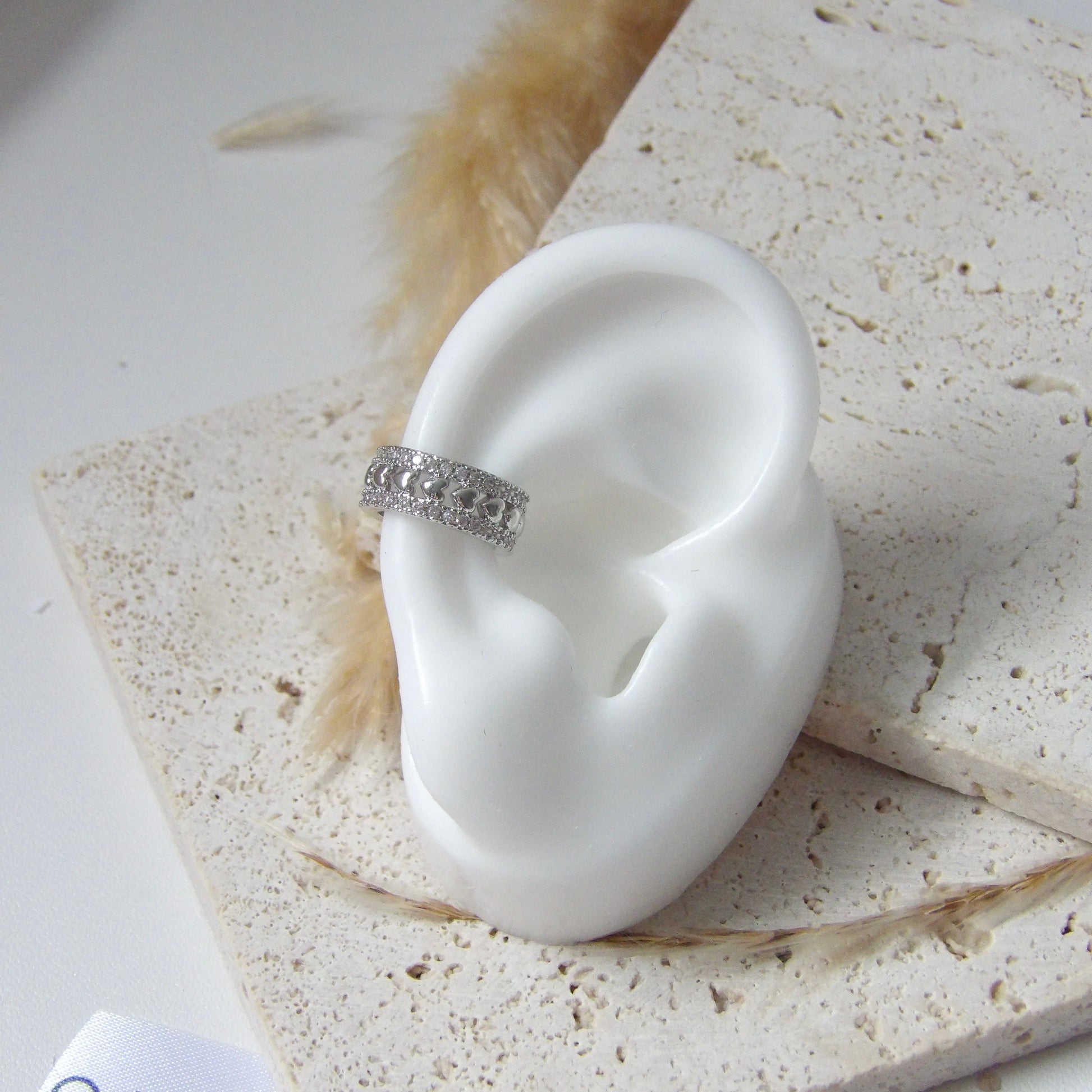 Embody delicate elegance with our GRACE EAR CUFF SILVER. Crafted with exquisite GOLDFIELD and adorned with intricate hearts and sparkling zircons, this ear cuff adds a touch of beauty to any style. A must-have for those who appreciate the finer things in life.