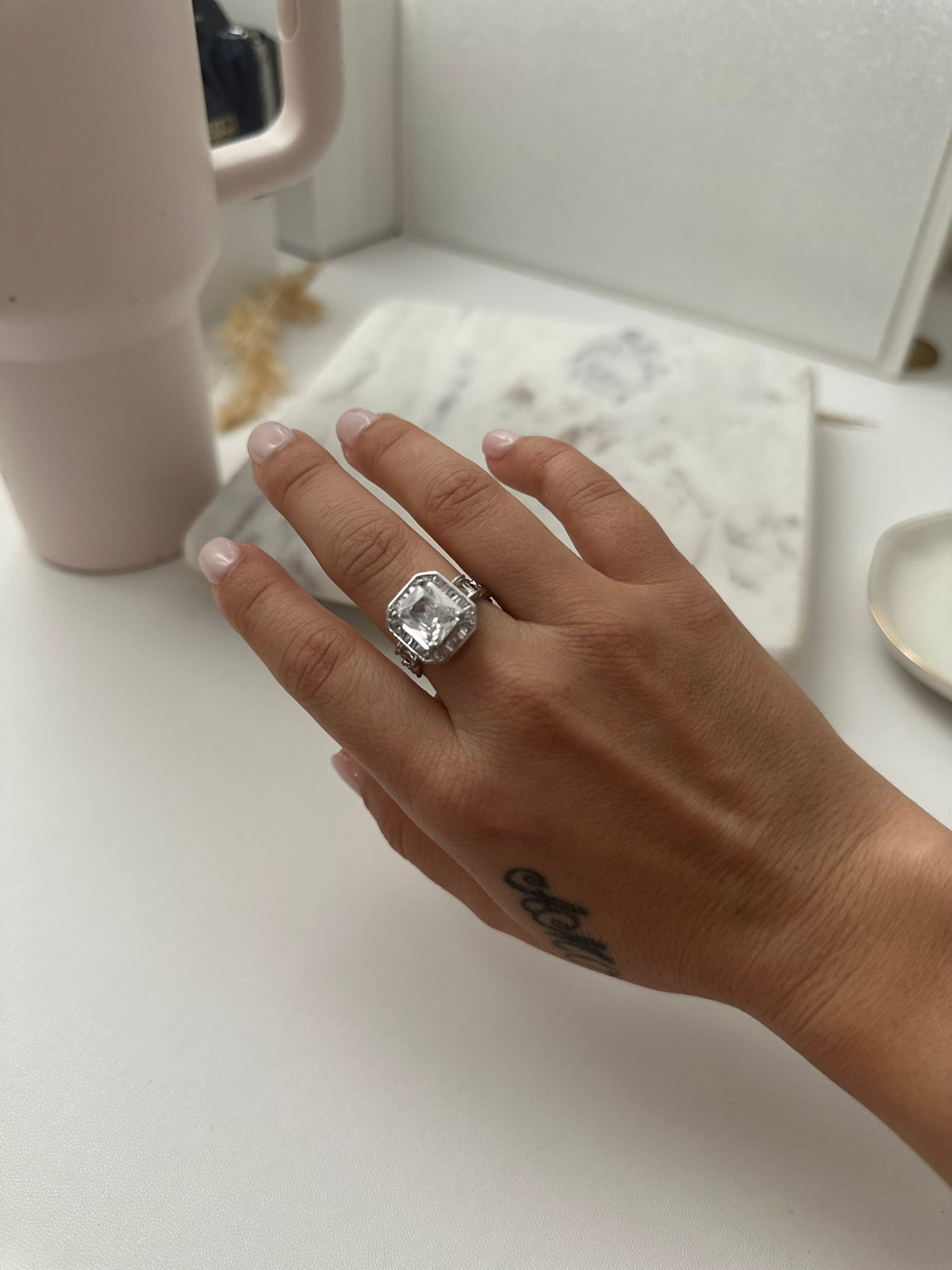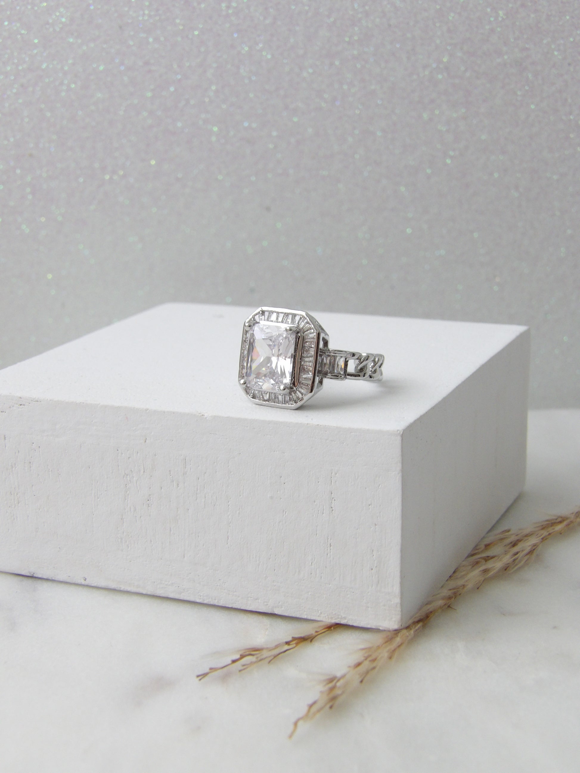 A glow that imposes elegance. The Imperial Ice ring dazzles with its maxi rhodium design, featuring a central emerald-cut stone that reflects light with strength and subtlety. Carved details on its base enhance the sparkle and add a classic and sophisticated air.A jewel for those who are not afraid to stand out with elegance, power, and personal style. Perfect for elevating any look with a touch of timeless luxury. ✨