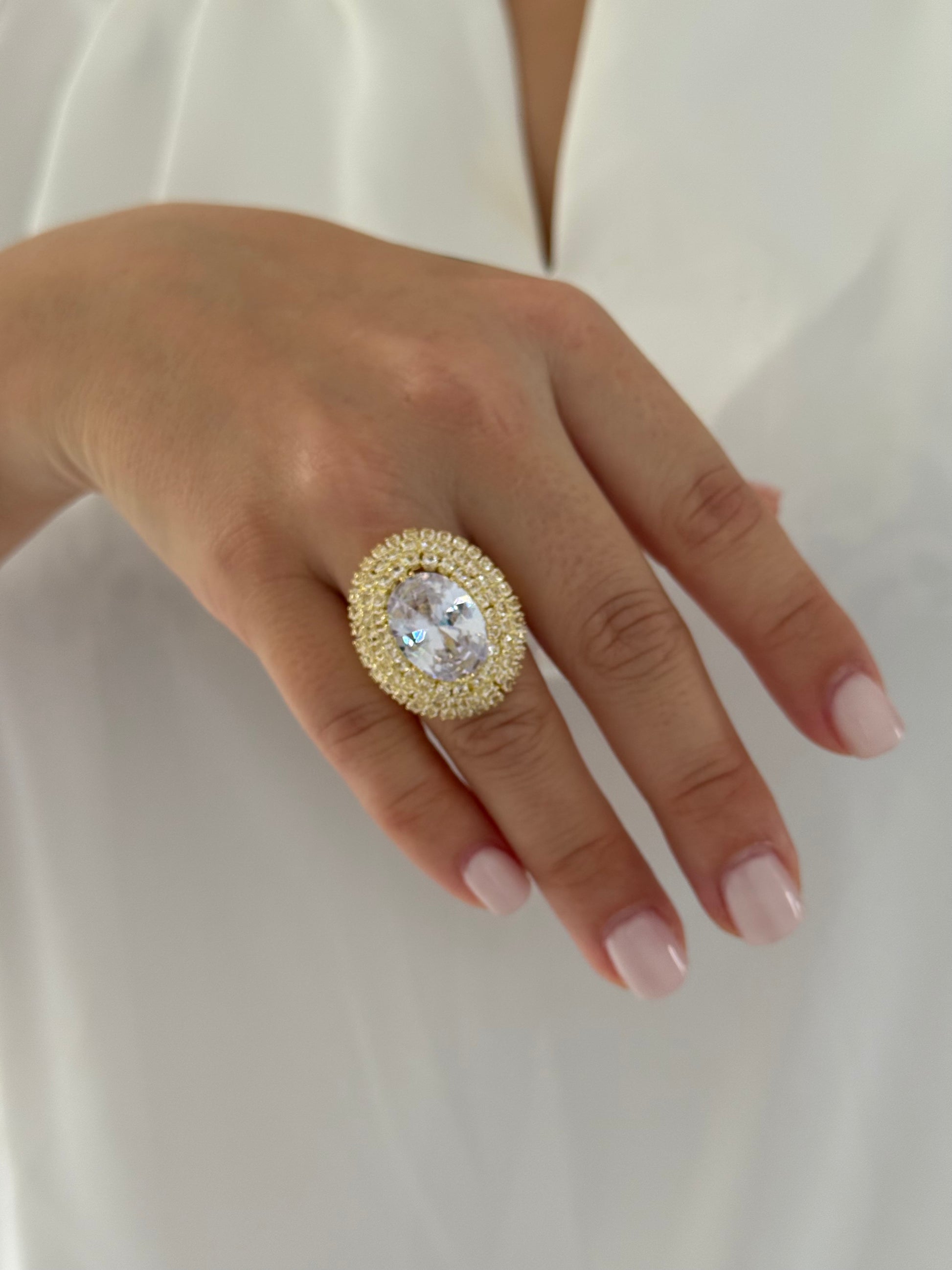 An imposing ring designed to stand out without asking for permission. The Imperium Ring is synonymous with power, sophistication, and absolute brilliance. Its maxi adjustable design in rhodium plated gold is crowned with an imposing central stone surrounded by zirconias that capture light from any angle. A jewel that does not go unnoticed, made for women who dare to shine with elegance and authority. ➤ Wear it alone or combine it with other pieces from our collection for an unforgettable look.Â