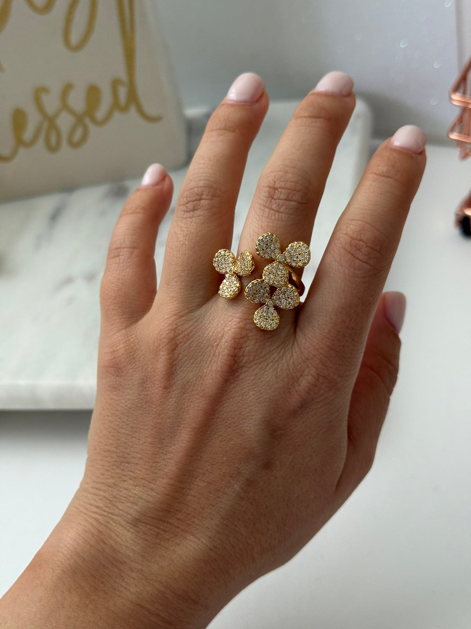 A summer glimmer in your hand. The Isla Bloom Ring is inspired by the lightness of tropical flowers and the soft glow of the sun on the skin. Adjustable and dipped in golden rhodium, it combines finely textured petals with a sleek and fresh design that transforms any look into a statement full of charm and joy. Wear it alone or combine it with other pieces for a look that breathes breeze, light, and freedom.