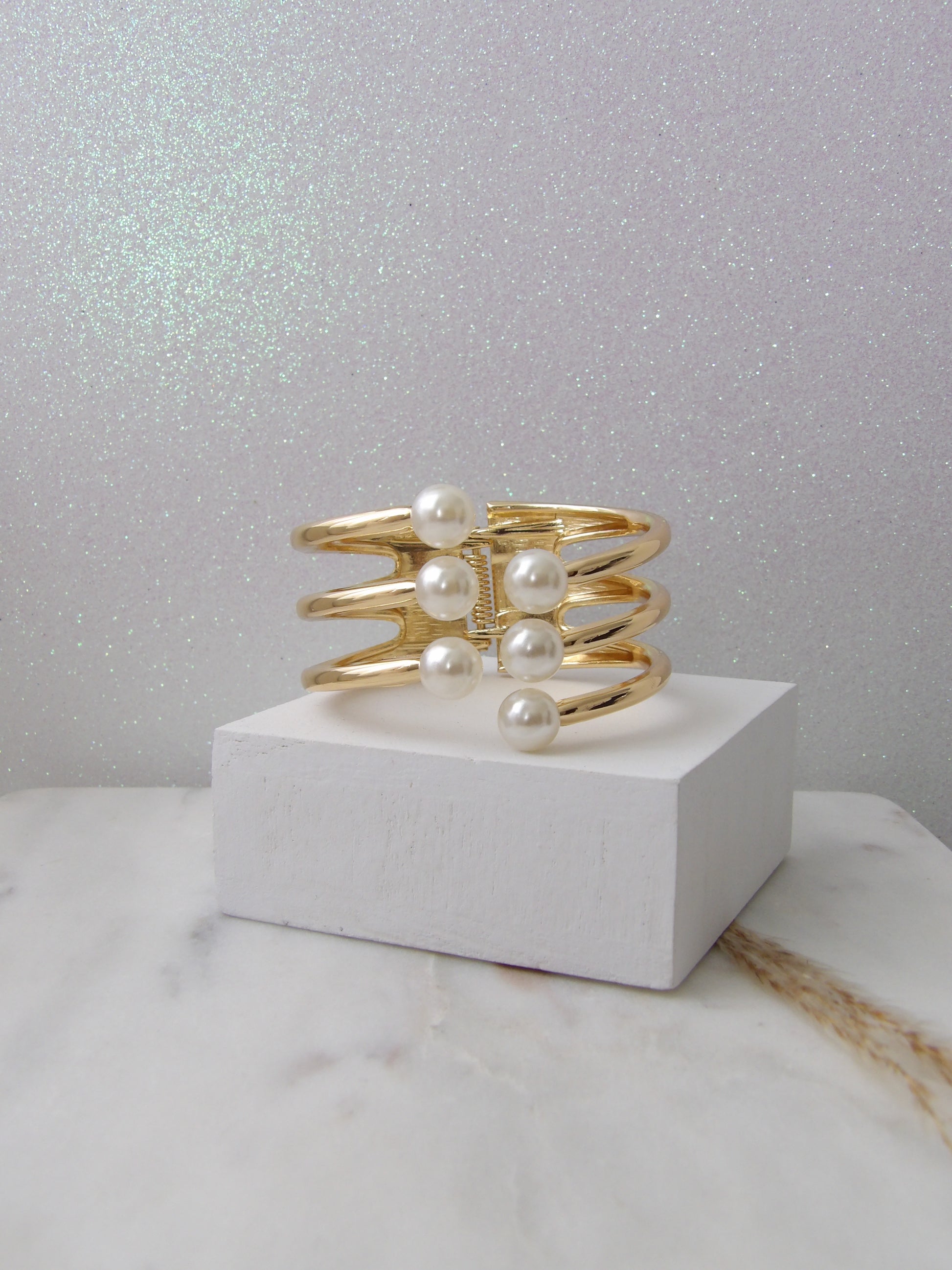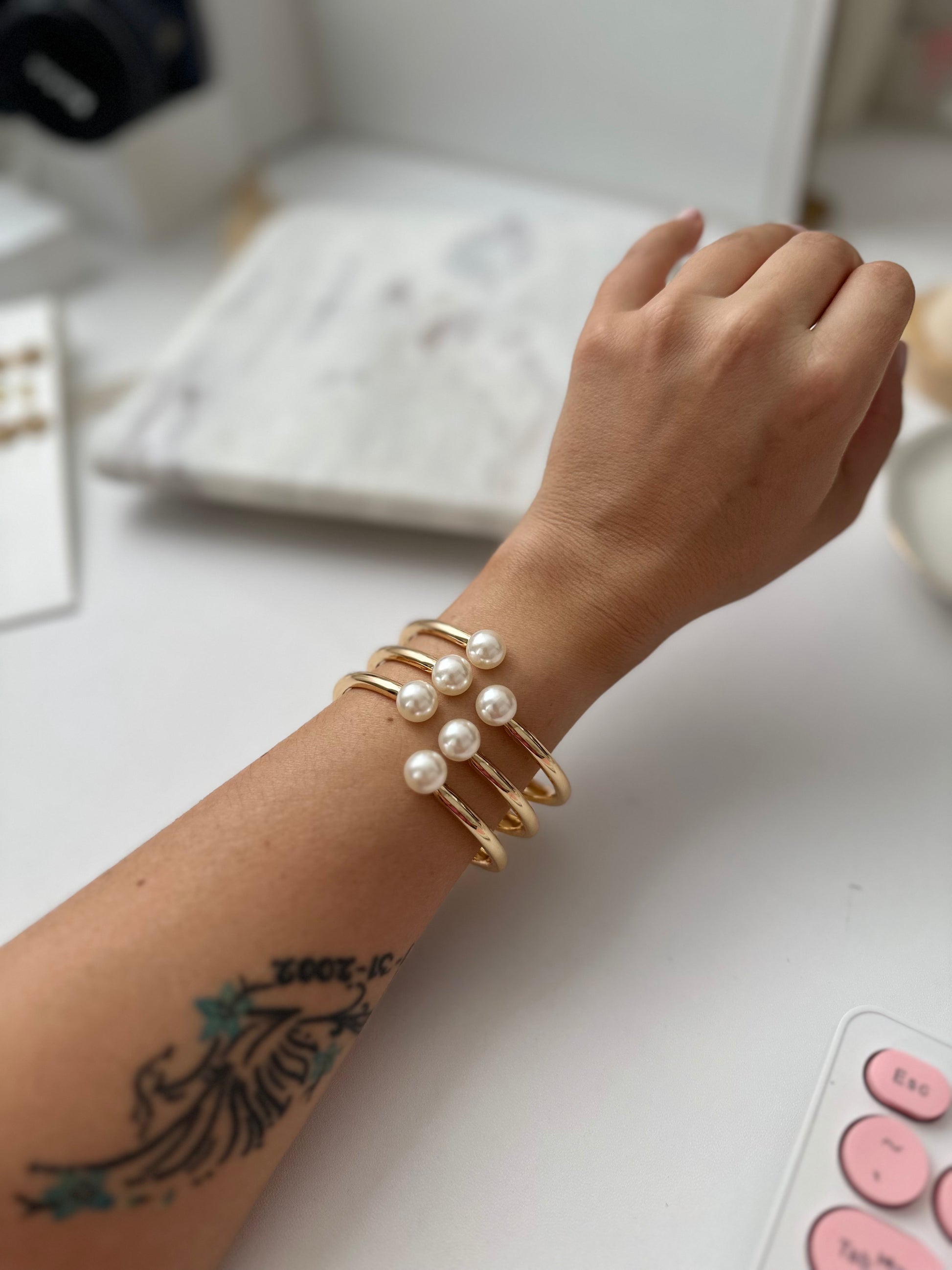 A balance between structure and softness, the Isola Bangle fuses modern lines with the timeless charm of pearls. Crafted in gold-rhodium, its enveloping design enhances the wrist with elegance and subtle strength. Perfect for elevating any look with a touch of contemporary sophistication.