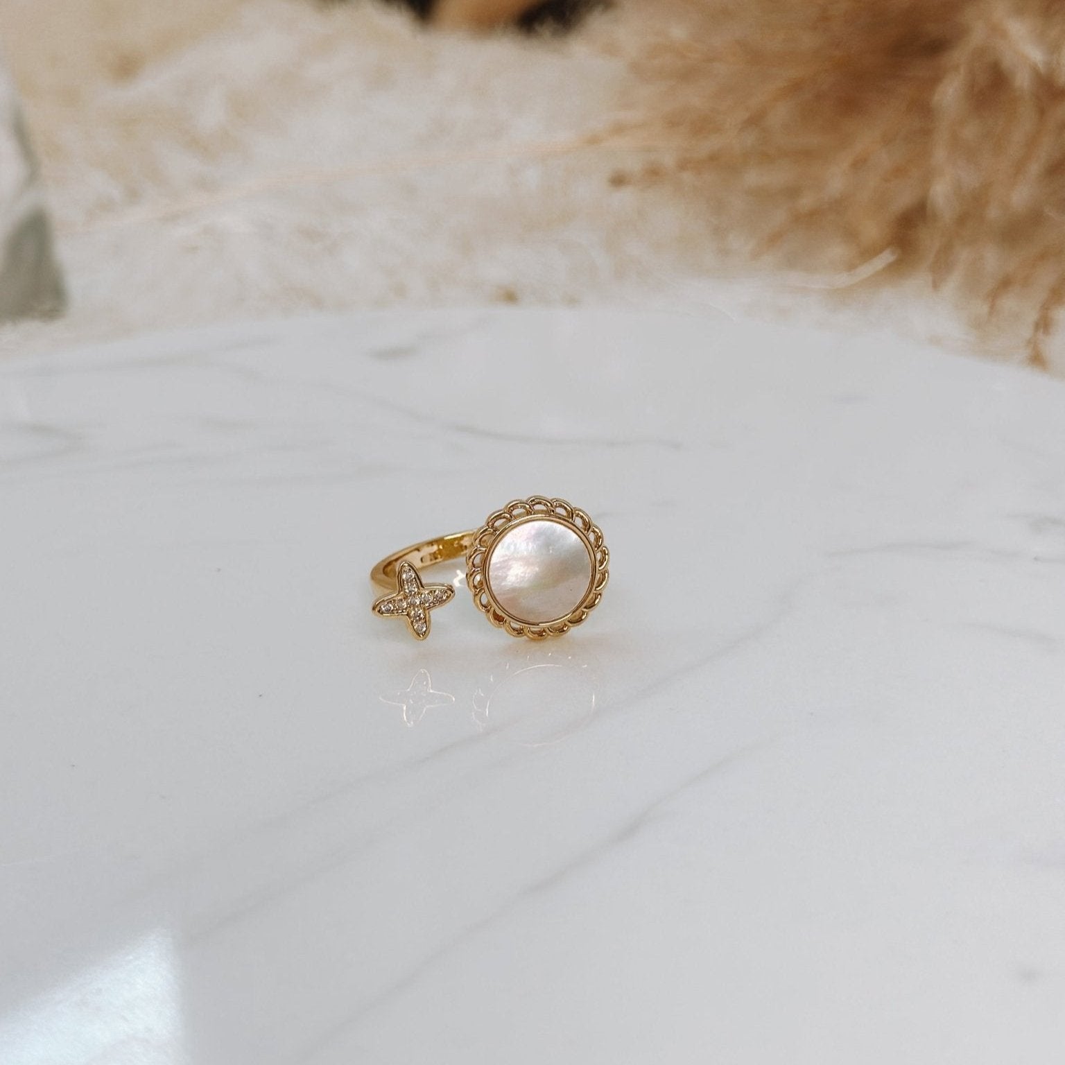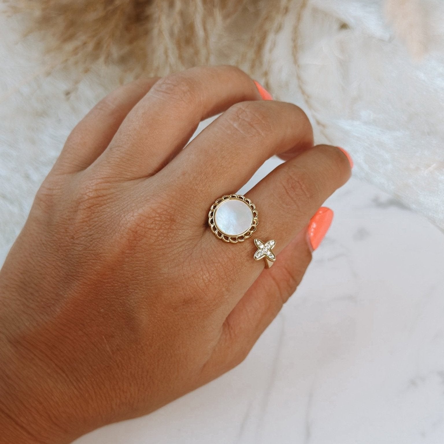 Indulge in luxury with our exquisite AURORA GOLD RING. The rhodium plating adds a lustrous finish, while the adjustable design ensures a comfortable fit. Adorned with delicate nacar and sparkling zircon, this ring is a true statement piece. Elevate your style with this exclusive and sophisticated ring.