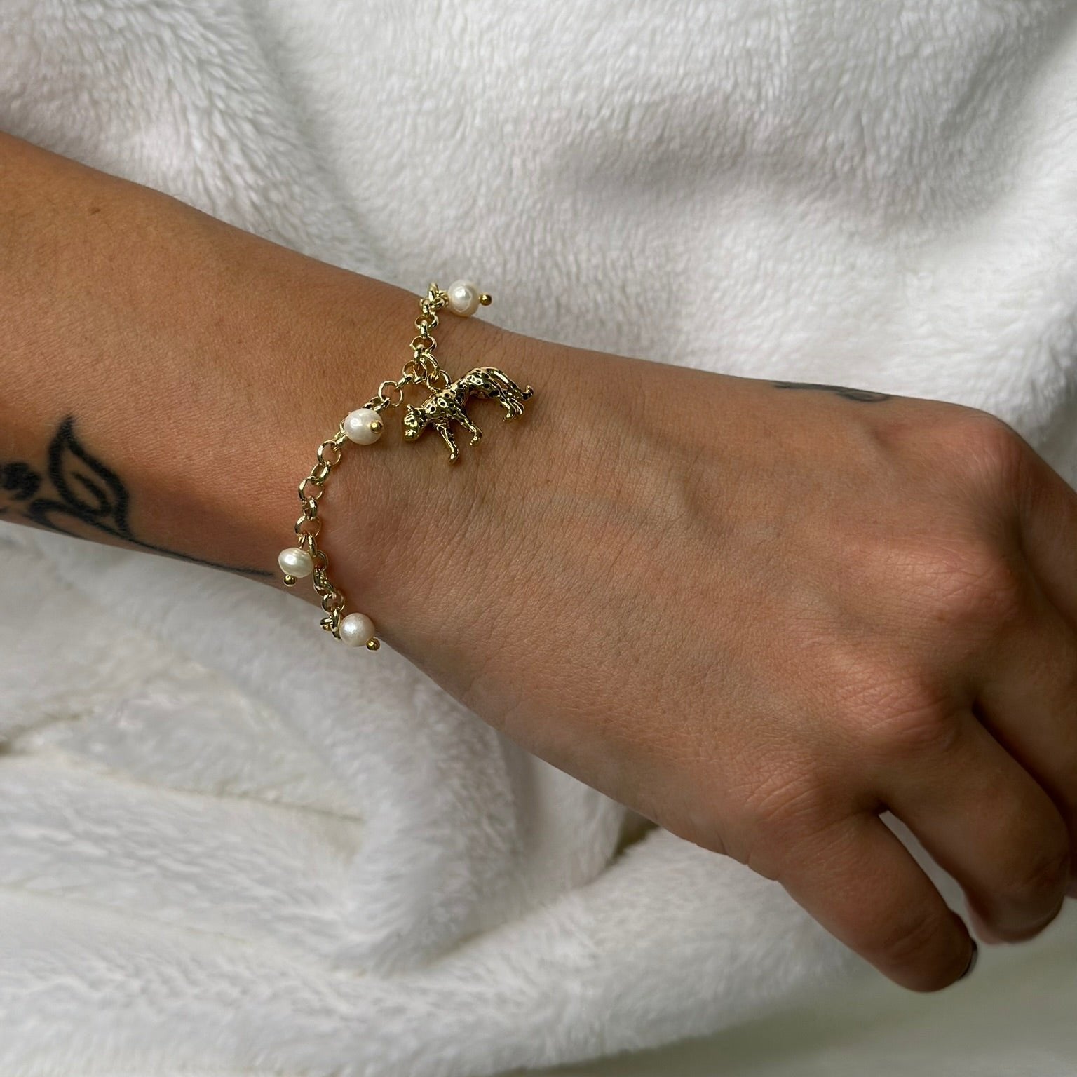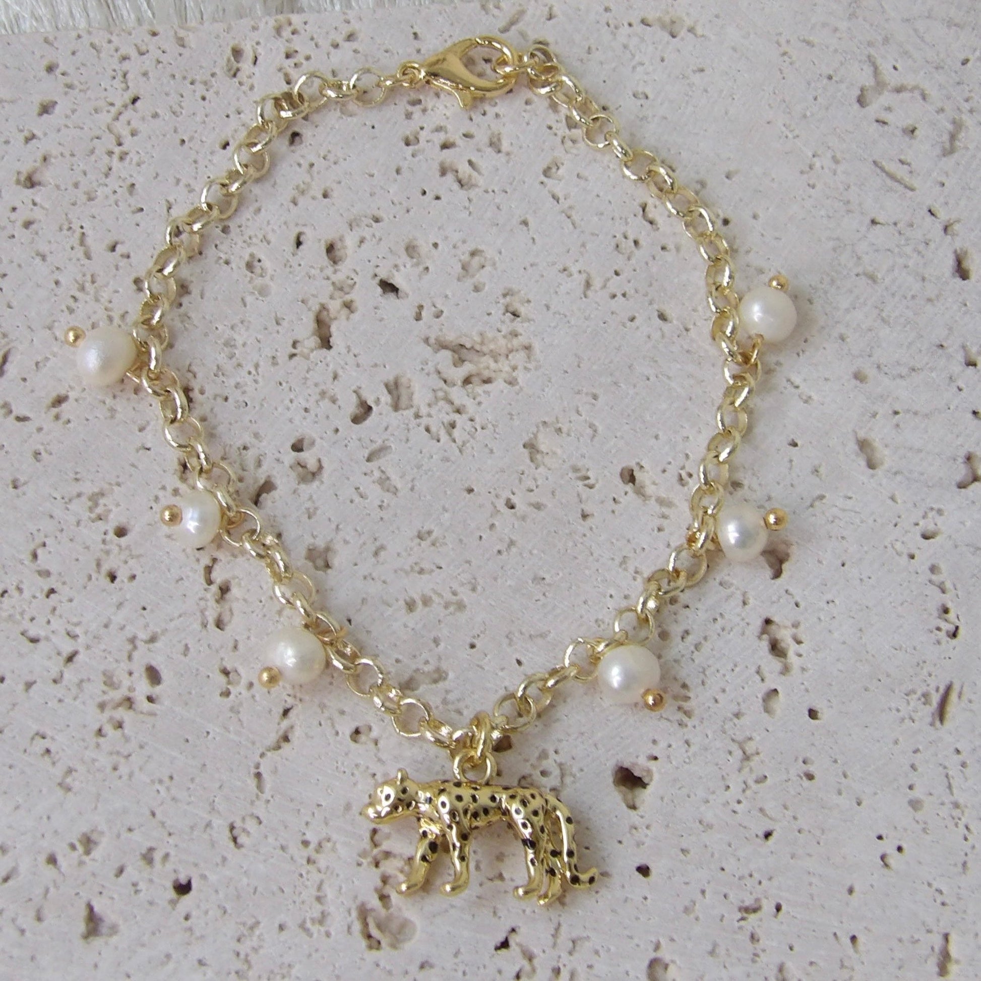 Add a touch of wild elegance to your wardrobe with our LEOPARD BRACELET GOLD. Handmade with beautiful leopard charm and pearls, this bracelet features a rhodium finish for a sleek and stylish look. Ready to make a statement? (Pounce on this bracelet now!)
