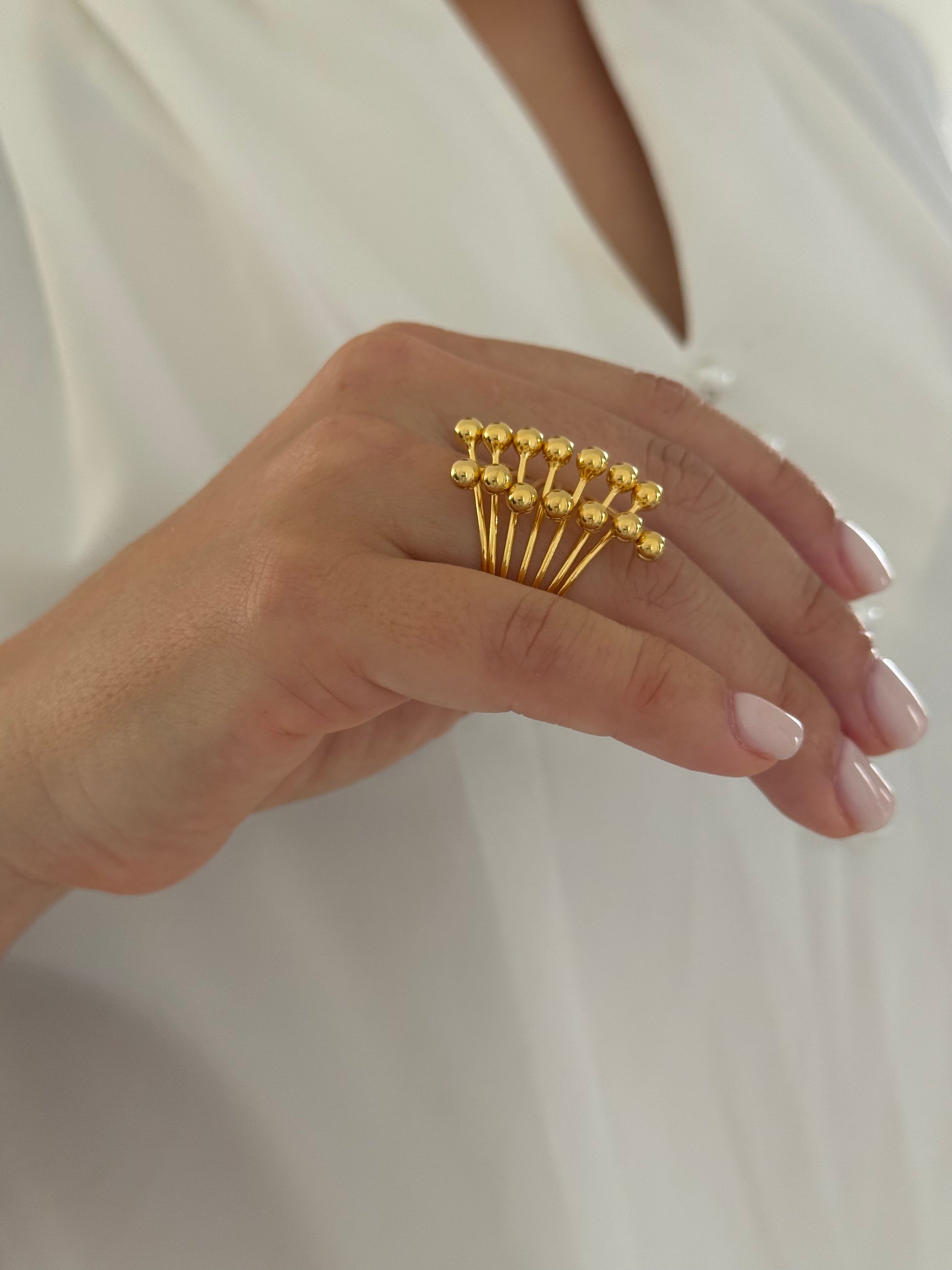 Handcrafted in bronze with a gold plating, its enveloping and elegant structure instantly elevates any look.