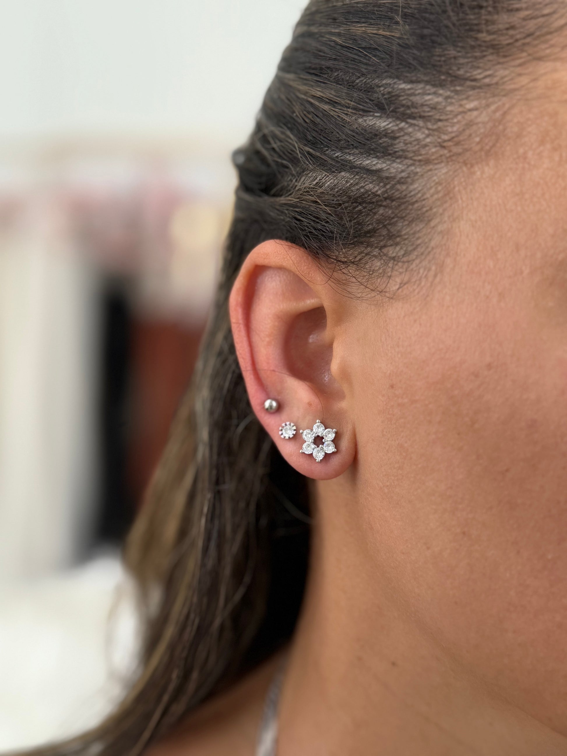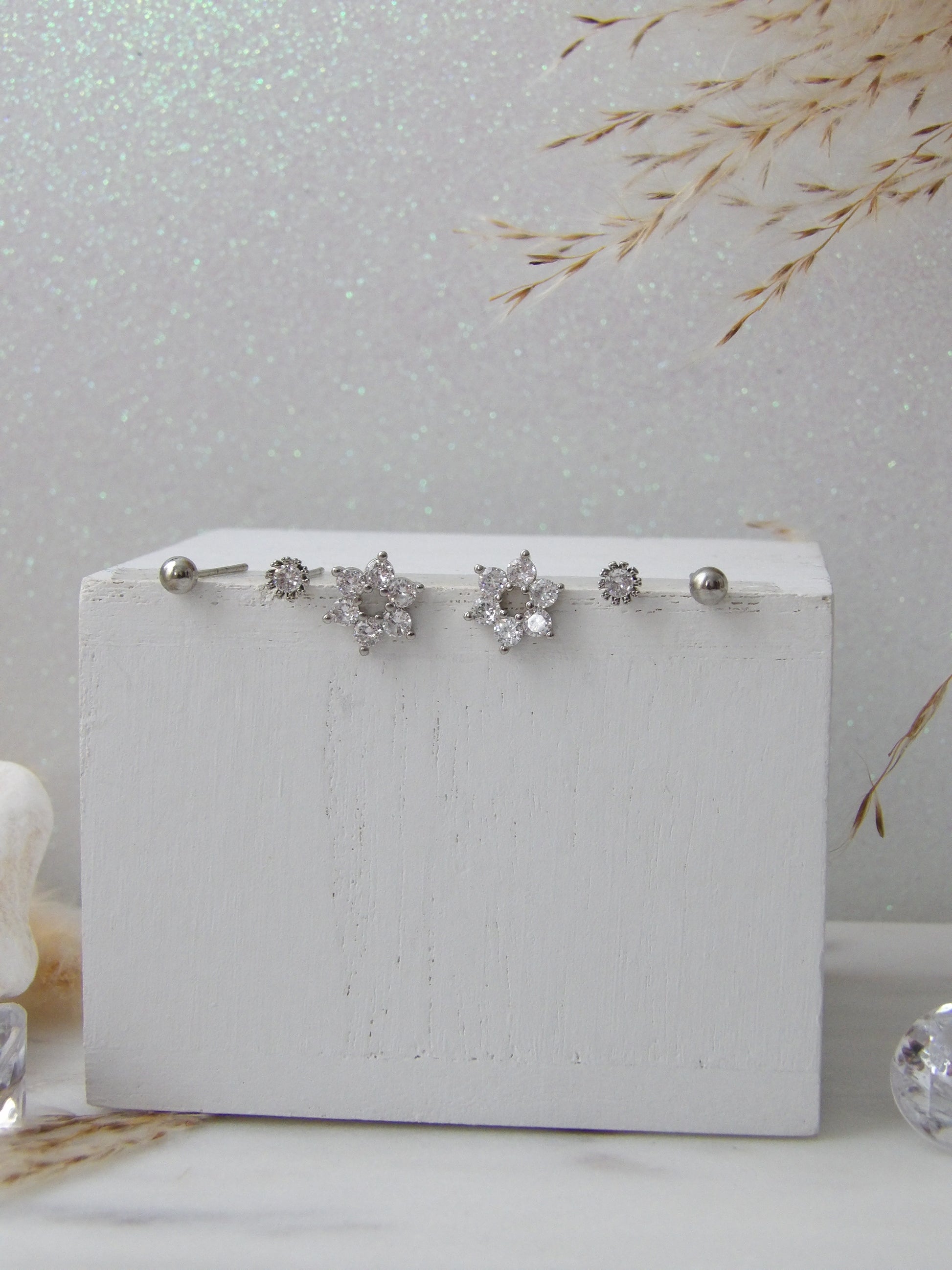 A radiant floral-inspired earring set crafted in rhodium and adorned with sparkling cubic zirconia. Designed to elevate your everyday look or add a touch of brilliance to a special occasion. Lightweight, versatile, and full of charm—this set lets you mix and match with ease.