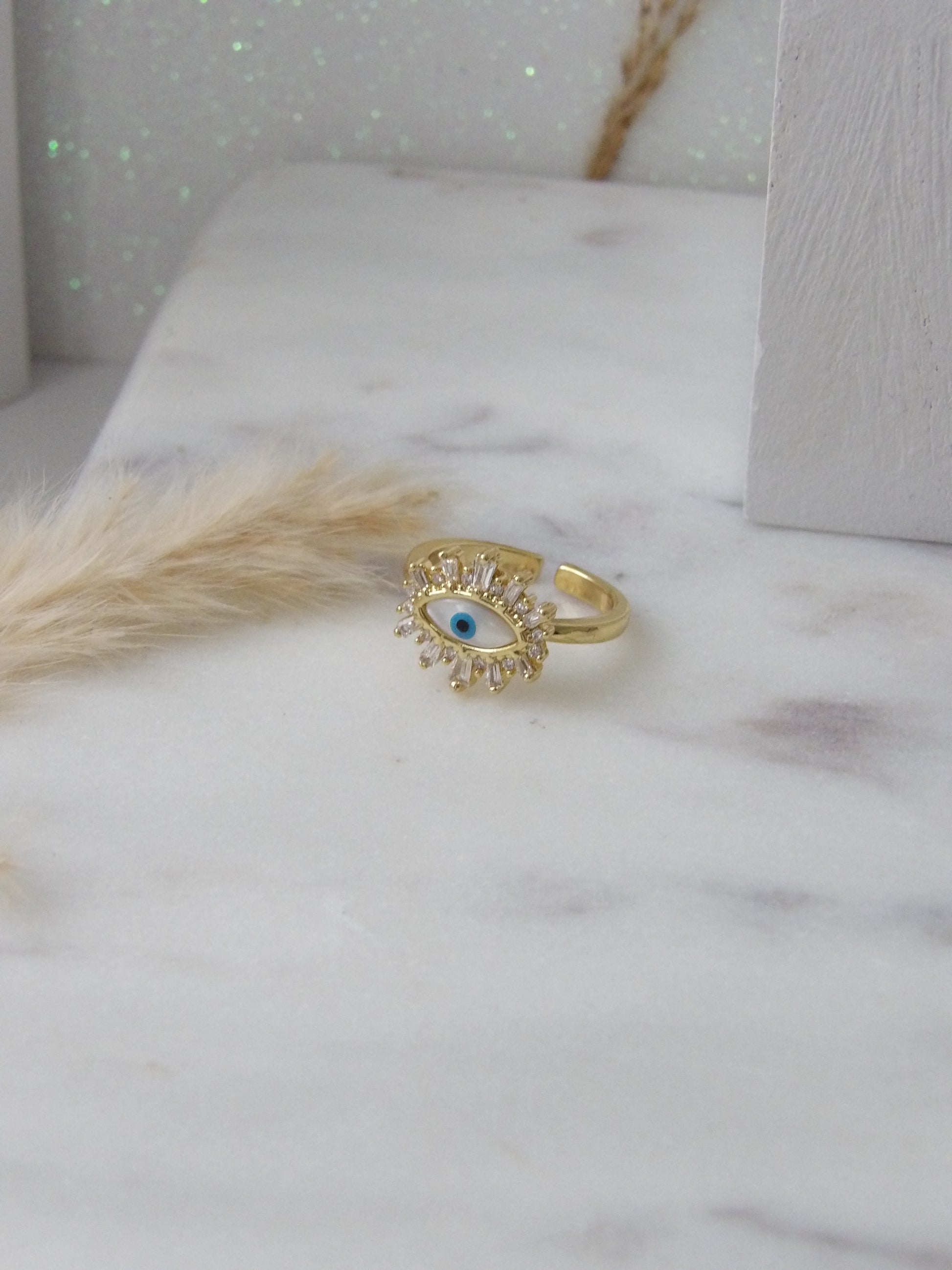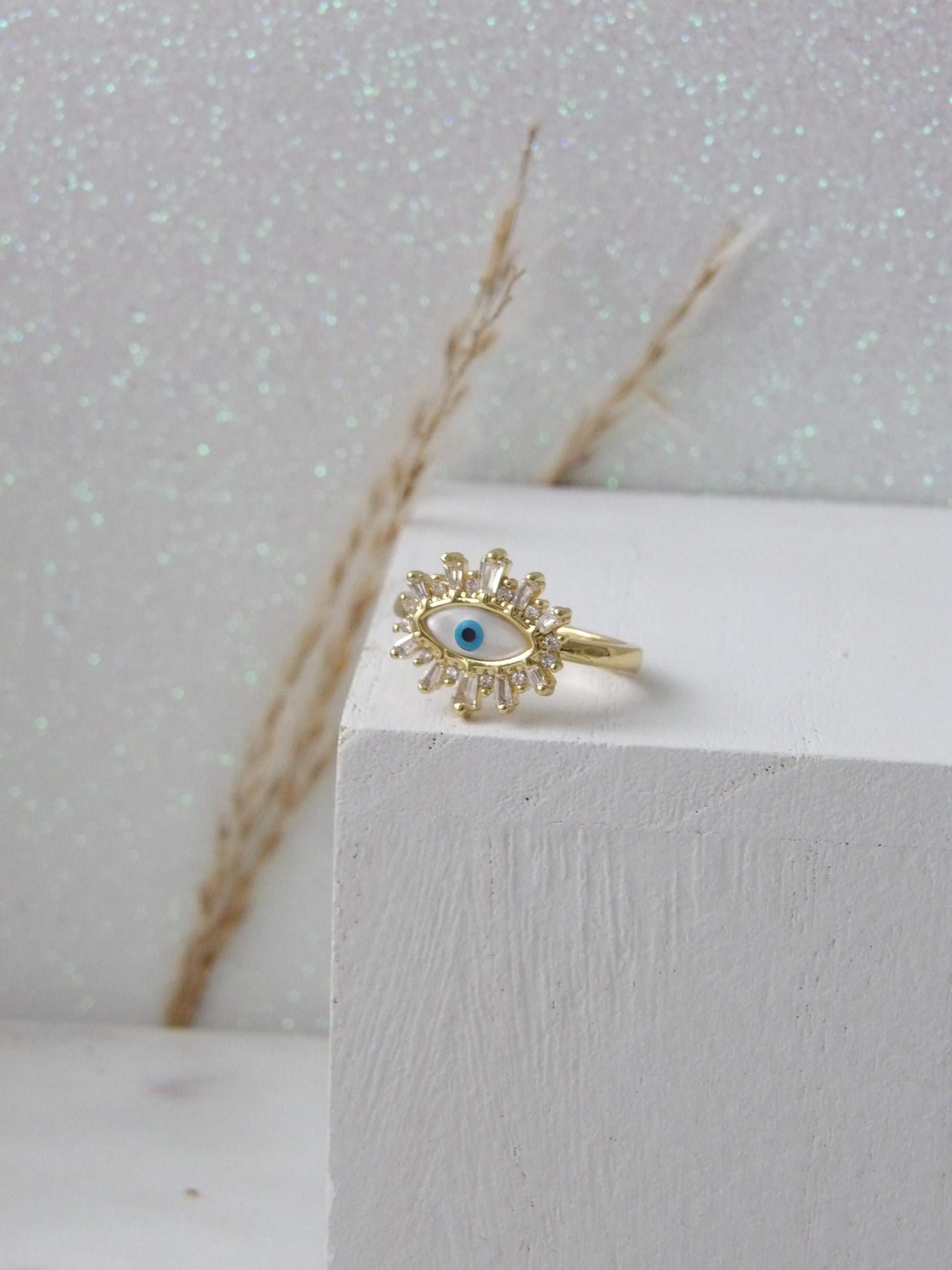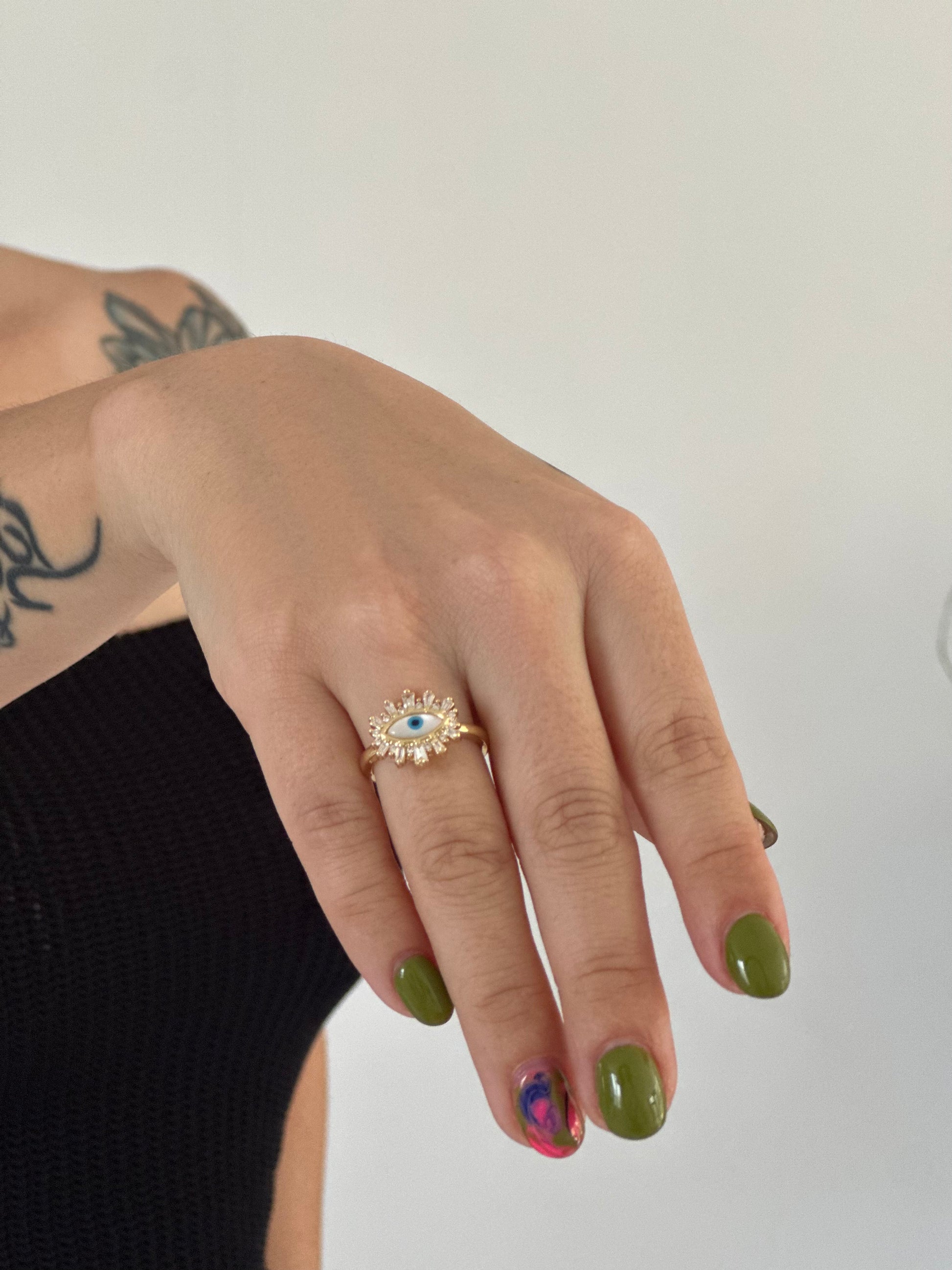 LUMINA EYE | Adjustable Rhodium Ring with Eye Design and ZirconiasShine that protects, style that stands out. Lumina Eye is a playful and elegant ring, featuring a central eye design surrounded by sparkles of zirconias, a symbol of intuition, energy, and good vibes. A piece of jewelry to attract light, reflect your essence, and add a unique touch to your daily look.✨ Because your gaze is also carried in your hands.
