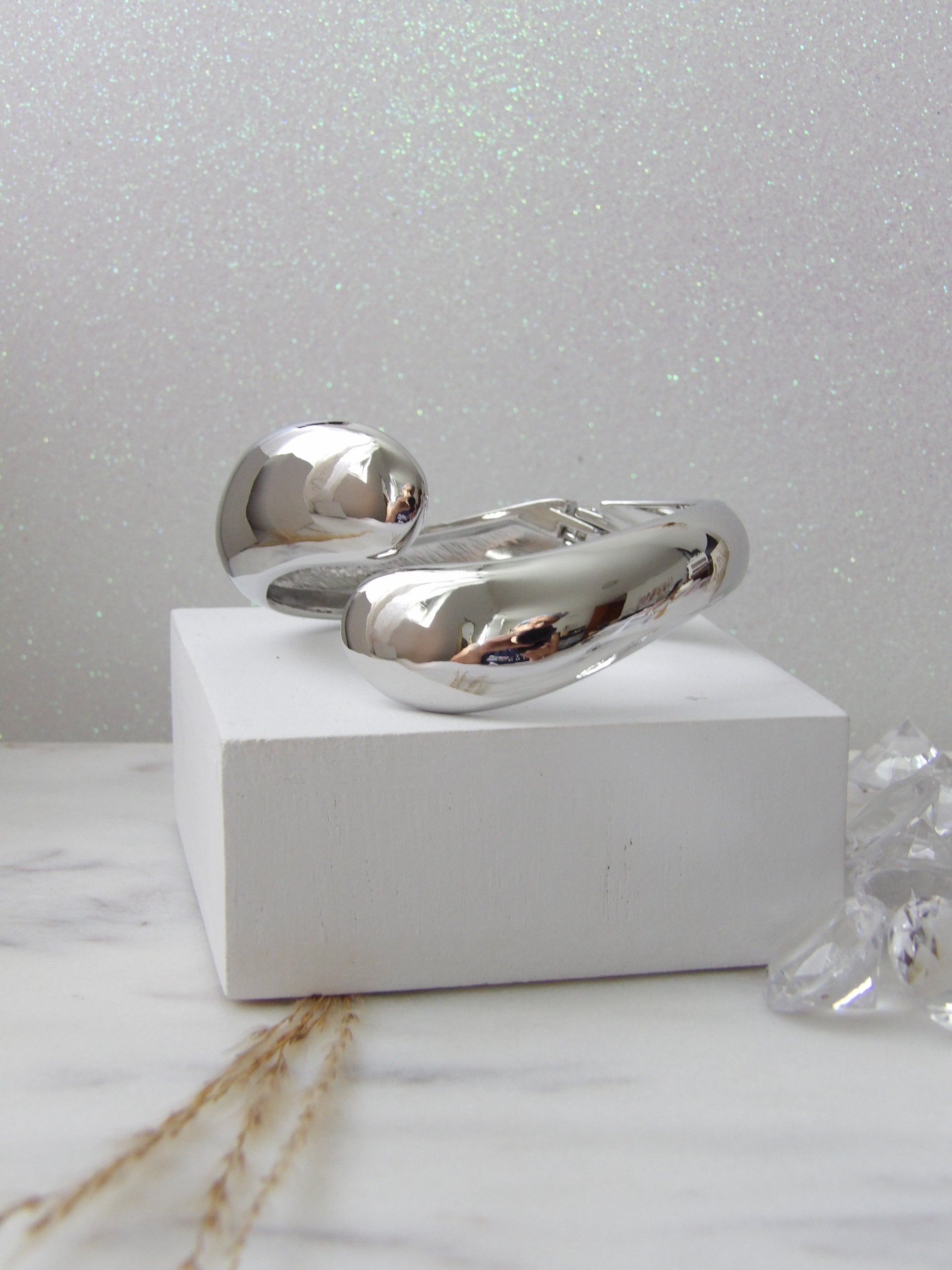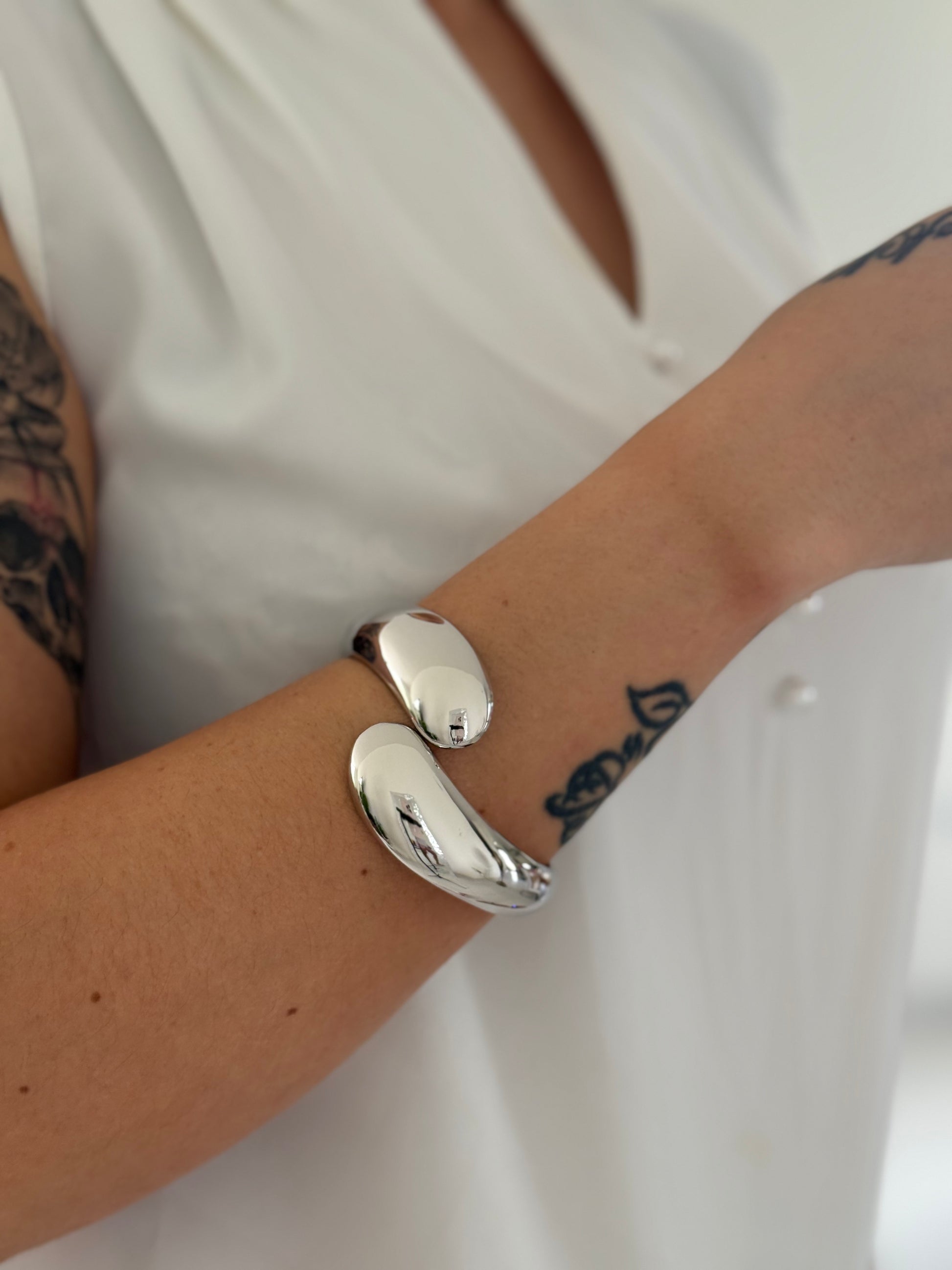 Minimalism with presence. The Lunar Flow Bracelet is a maxi bracelet in rhodium-plated silver, with curved and polished lines that reflect light like a liquid mirror. A piece that wraps around the wrist with a modern, elegant, and bold design. Perfect for wearing alone or combined with other accessories, this bracelet elevates any look with a touch of timeless sophistication. ➤ Dare to stand out with a design that flows with your style.