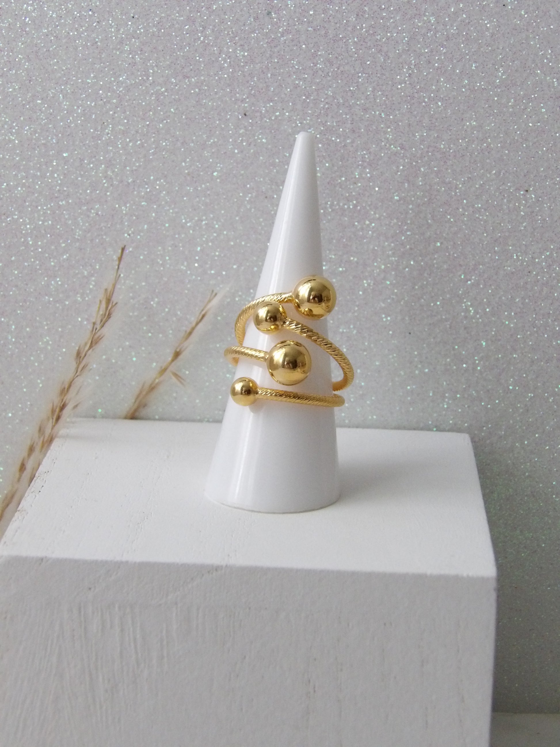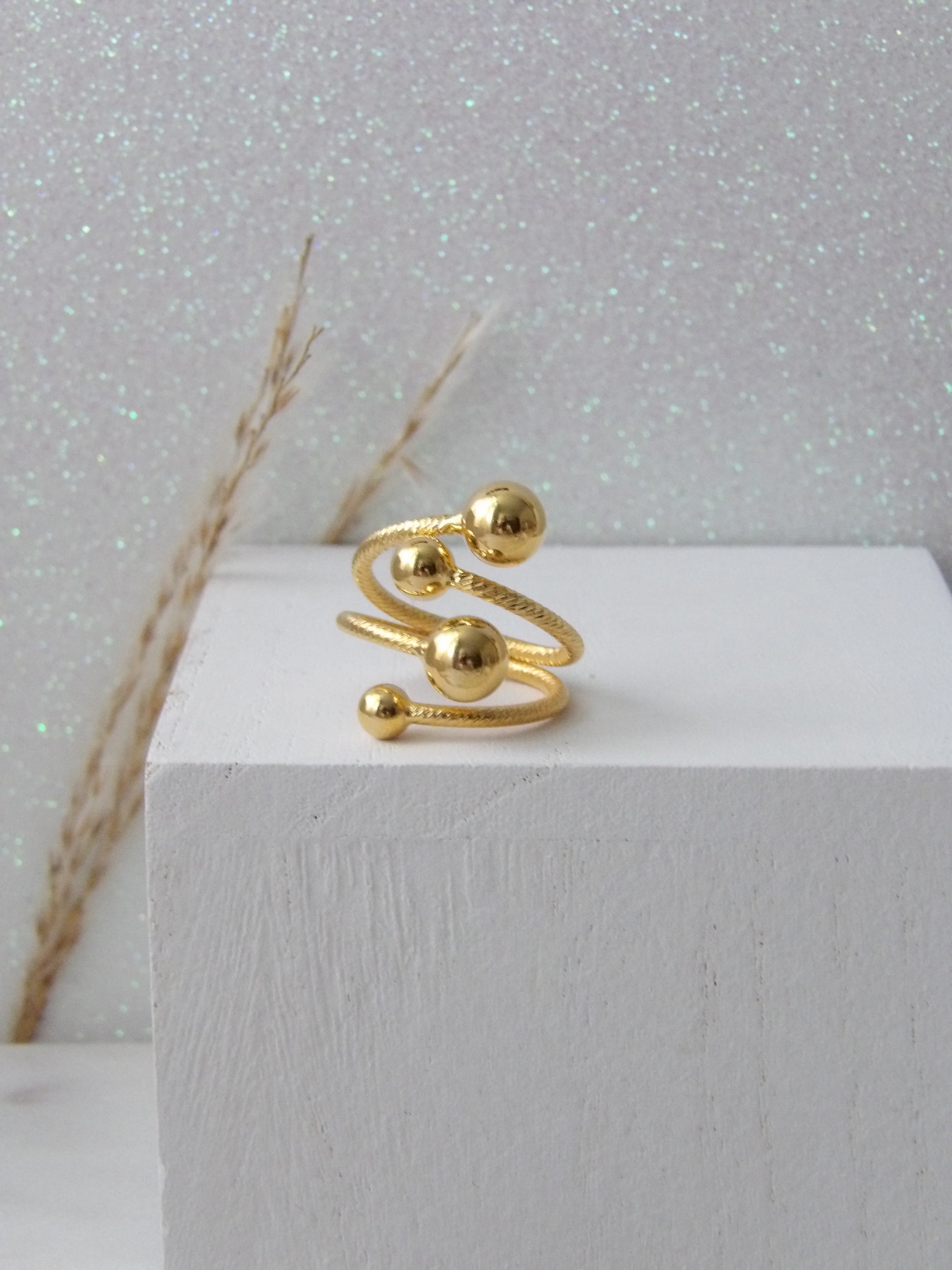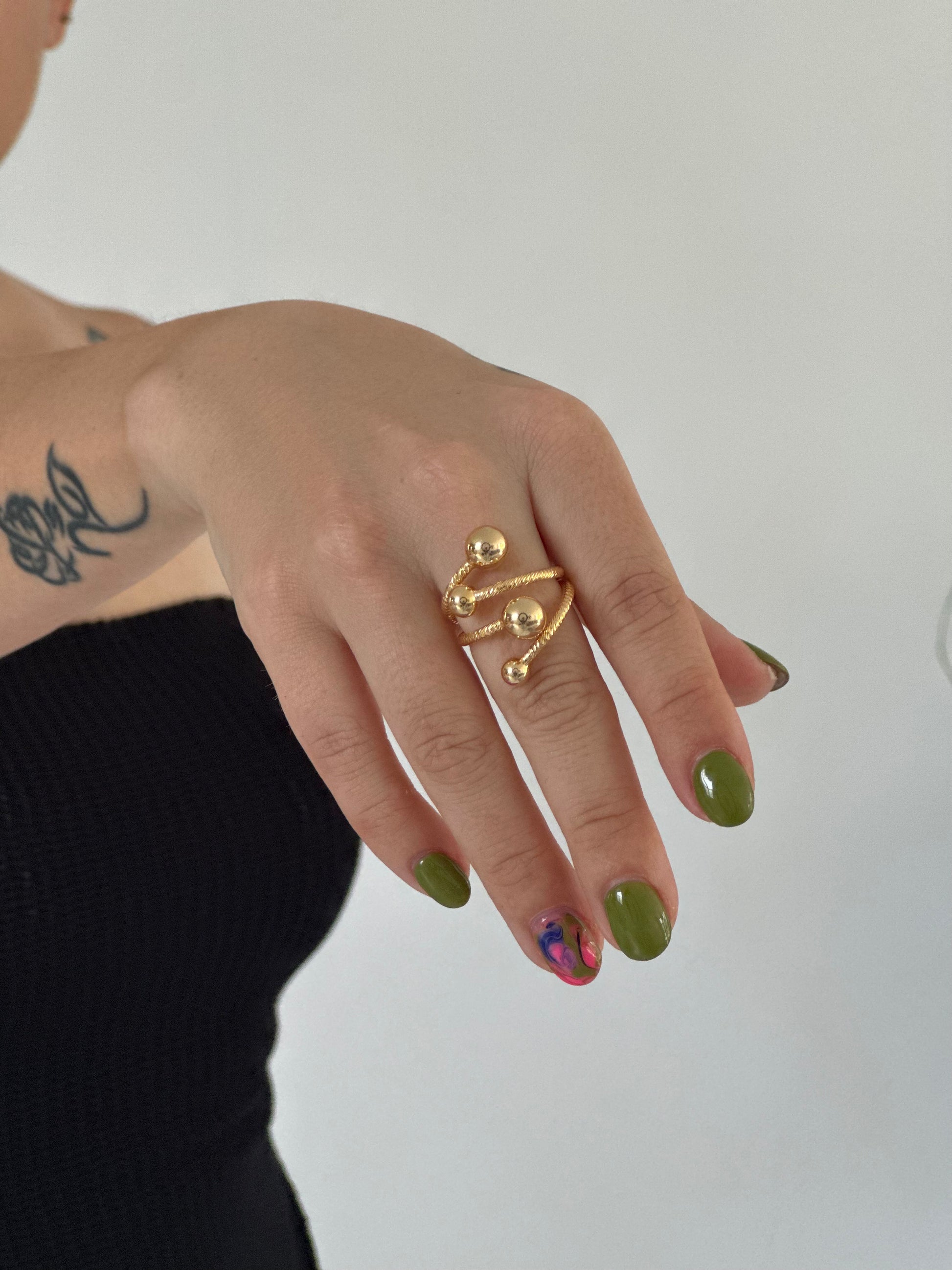 LYRA | Adjustable Ring Handmade in 24K Gold-Plated Bronze Movement that inspires. Lyra is a handmade jewel with an enveloping design and golden spheres that seem to dance on your skin. Its light, elegant, and artistic silhouette makes this ring a perfect piece to express style, confidence, and authenticity. ✨ Made to stand out. Designed to shine with you.