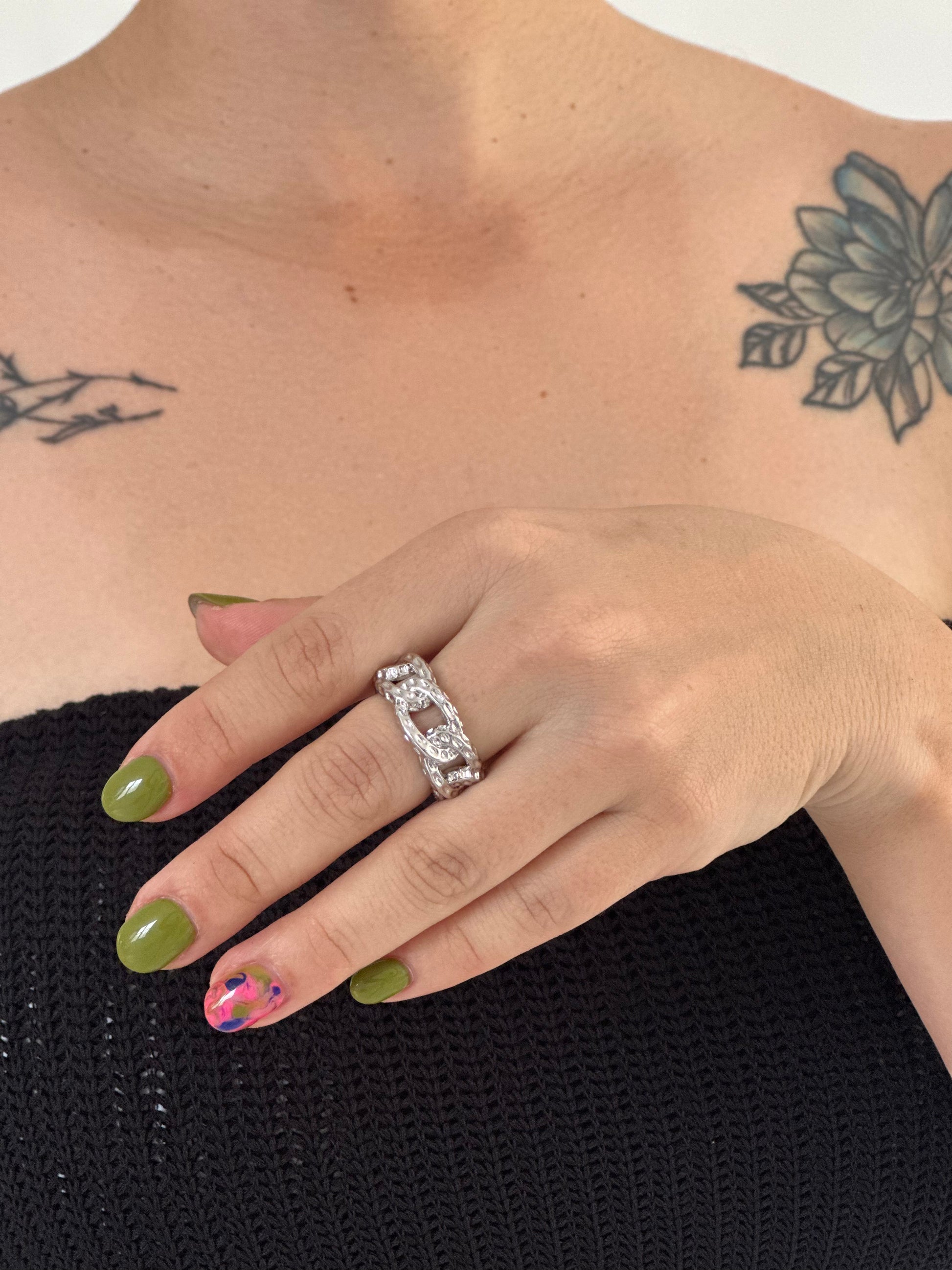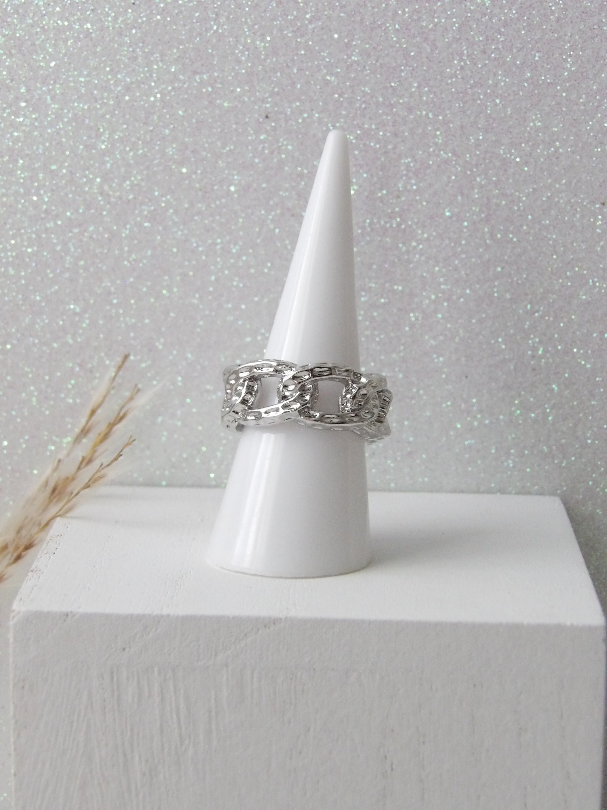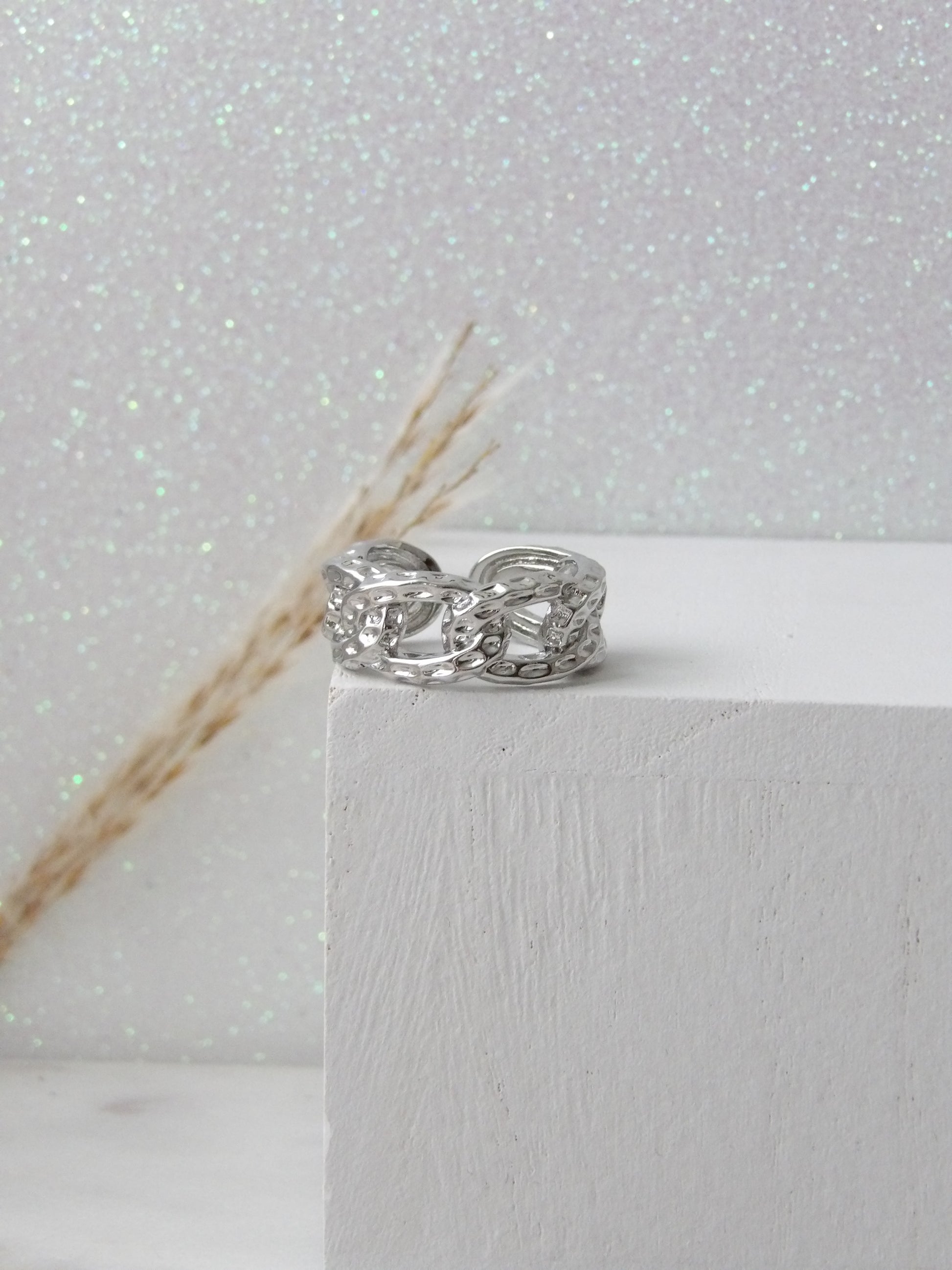 A piece that speaks for itself. Magna is an adjustable ring with a chain design, featuring a shiny SILVER-plated finish. Its maxi silhouette makes it a must-have for those looking to make a statement with elegance and character. Ideal to wear alone or as the standout piece in a bold combination. ✨ Be your center. Shine big. (RHODIUM)