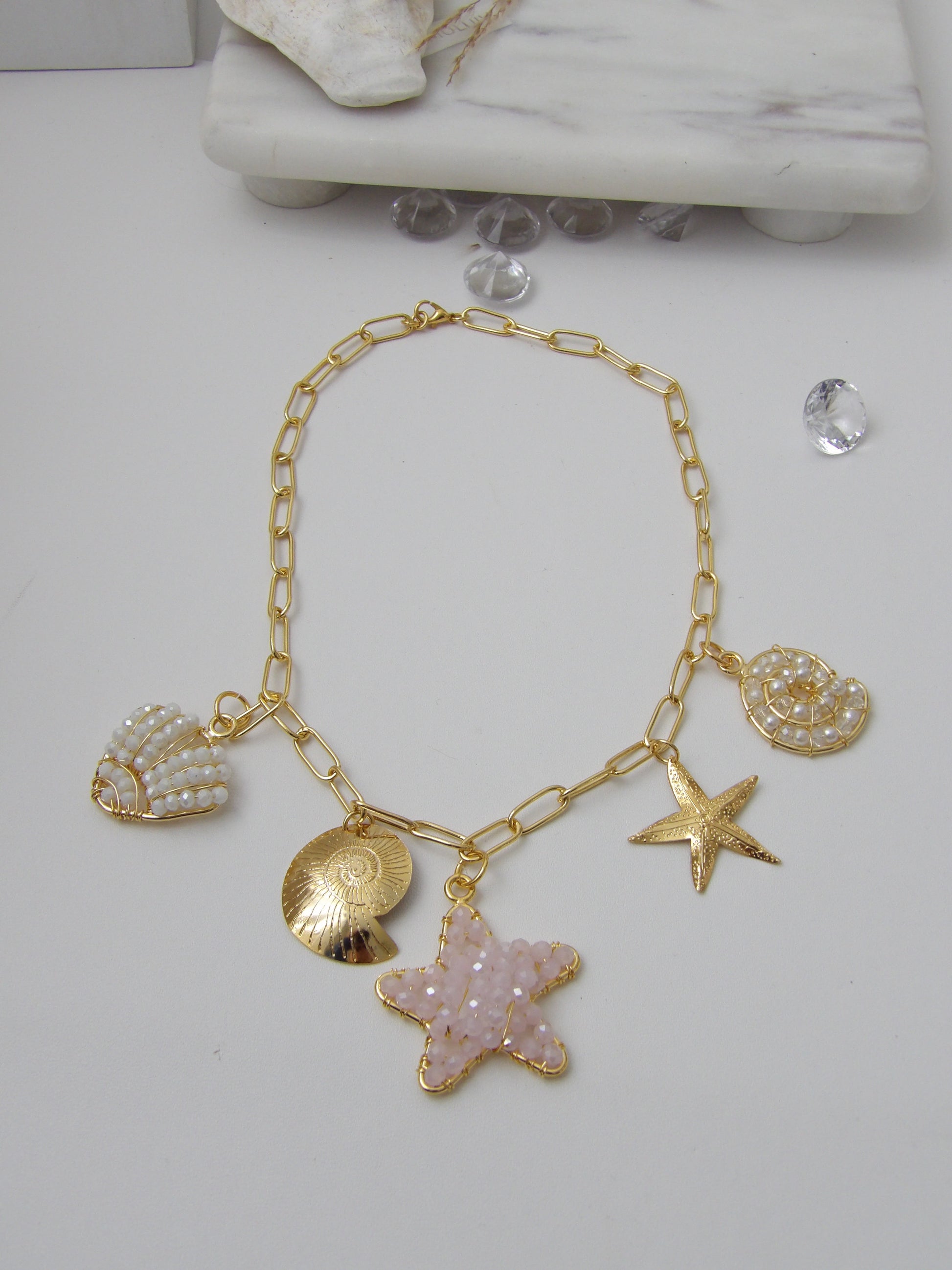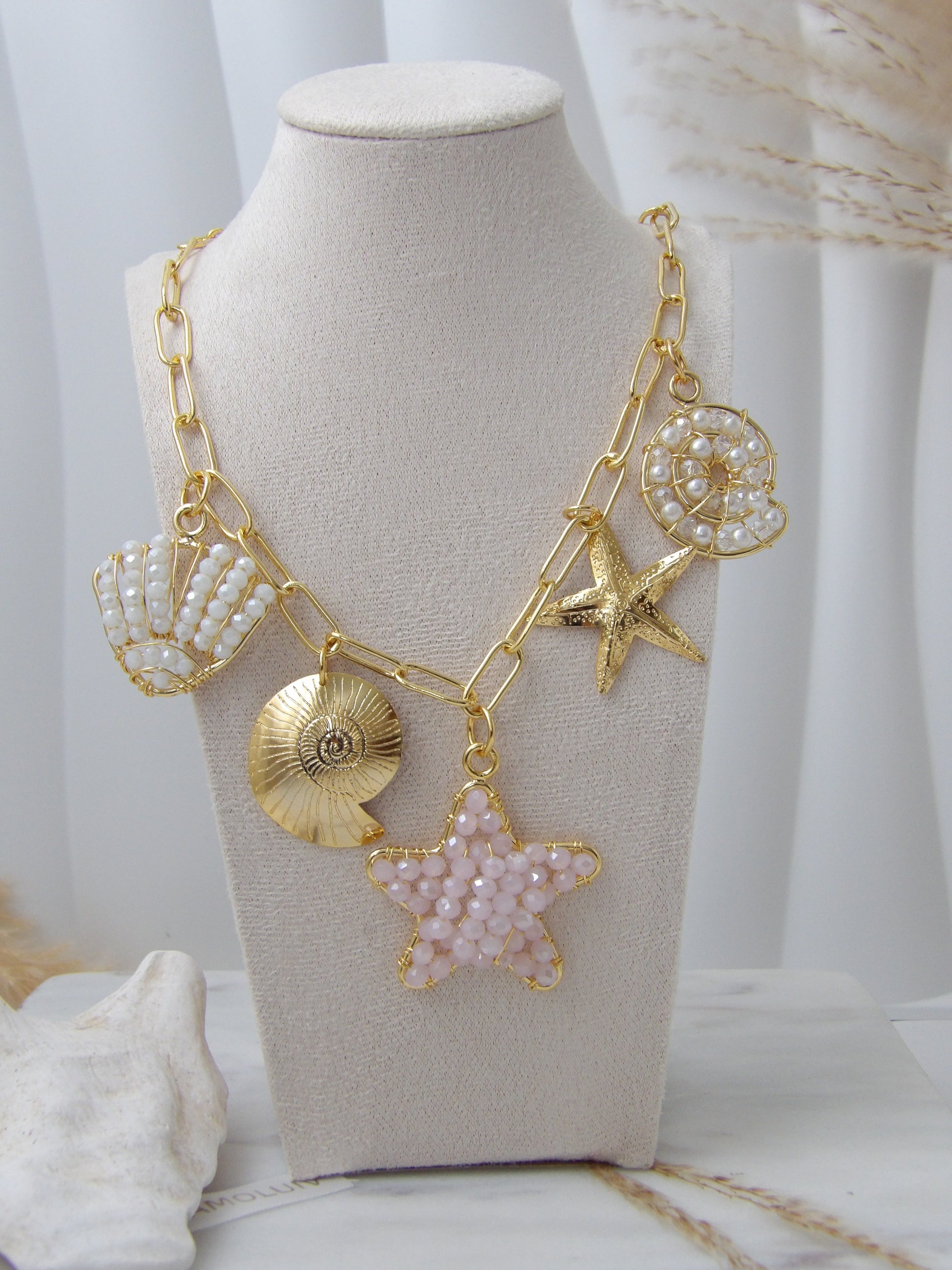 Let yourself be swept away by the magic of the sea. The Marena Necklace is a celebration of marine beauty, featuring artisan-crafted charms shaped like seashells, stars, and spirals, delicately woven with bronze and soft pearl accents. Each element is thoughtfully designed to evoke the freshness, sparkle, and free spirit of an endless summer.
