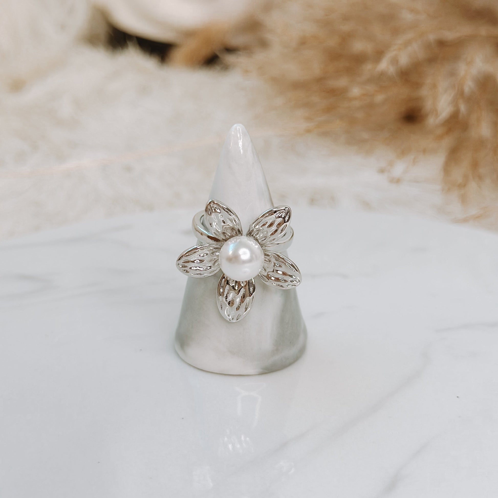 Indulge in luxury with our Margaret silver Ring, featuring a beautiful flower with a single pearl. Made with goldfield and an adjustable design, this tropical and elegant piece exudes sophistication and exclusivity. Elevate your style with this timeless treasure.