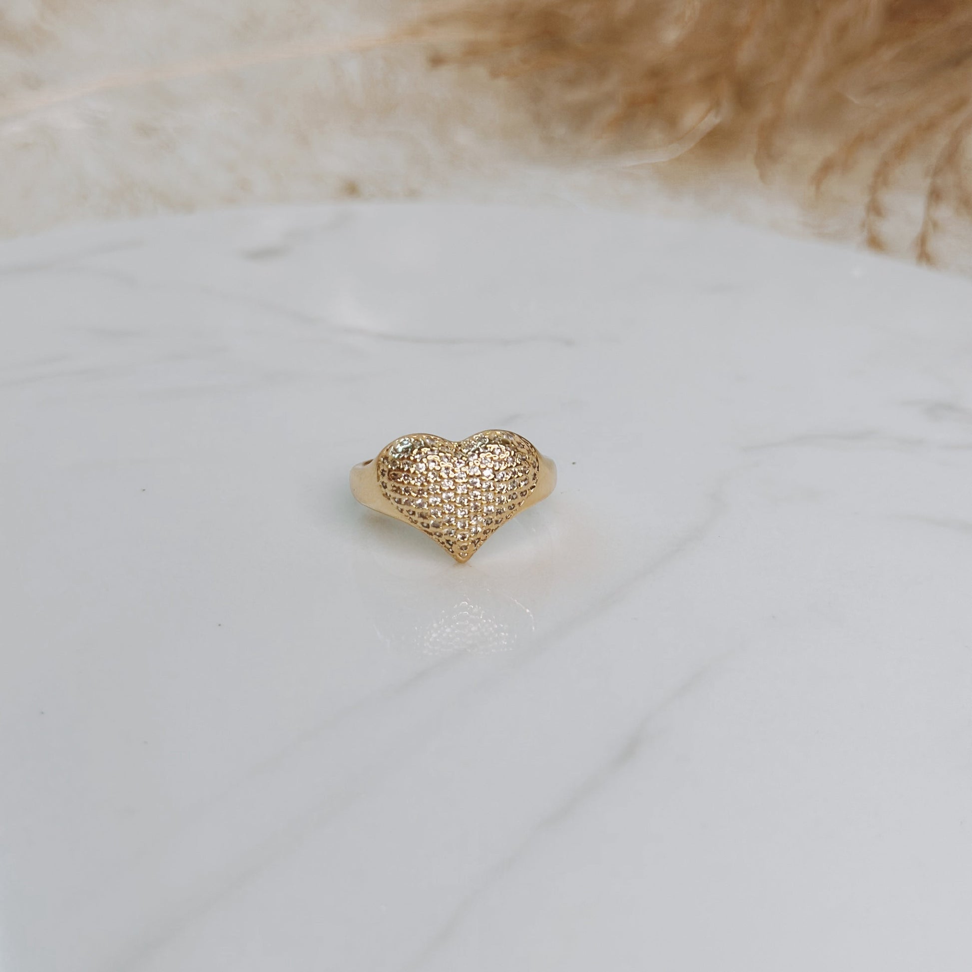 Embrace the luxe appeal of the Roma Ring Gold. Made with rhodium and adorned with a bright heart with sparkling zircons, this adjustable ring exudes sophistication and glamour. Elevate any outfit with this exclusive piece that adds a touch of elegance to your look.