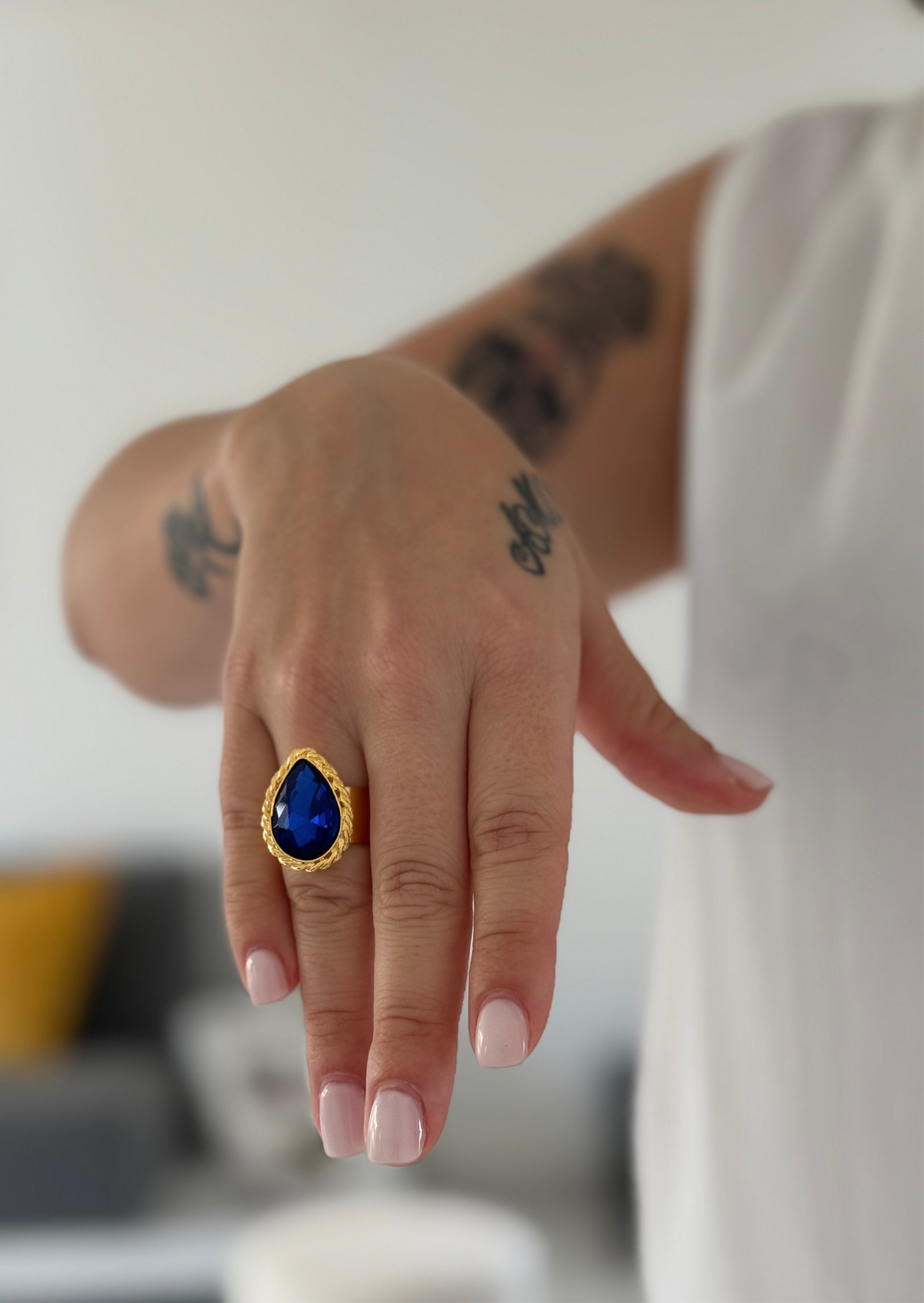 The Midnight Glow Ring captures the elegance of the night sky in an impressive and sophisticated piece of jewelry. Handcrafted in gold-plated bronze, this adjustable ring features a deep blue teardrop stone, surrounded by a delicate textured bezel that enhances its sparkle. Perfect for elevating your look with a touch of mystery and distinction. ✨ It shines with every movement, day or night.