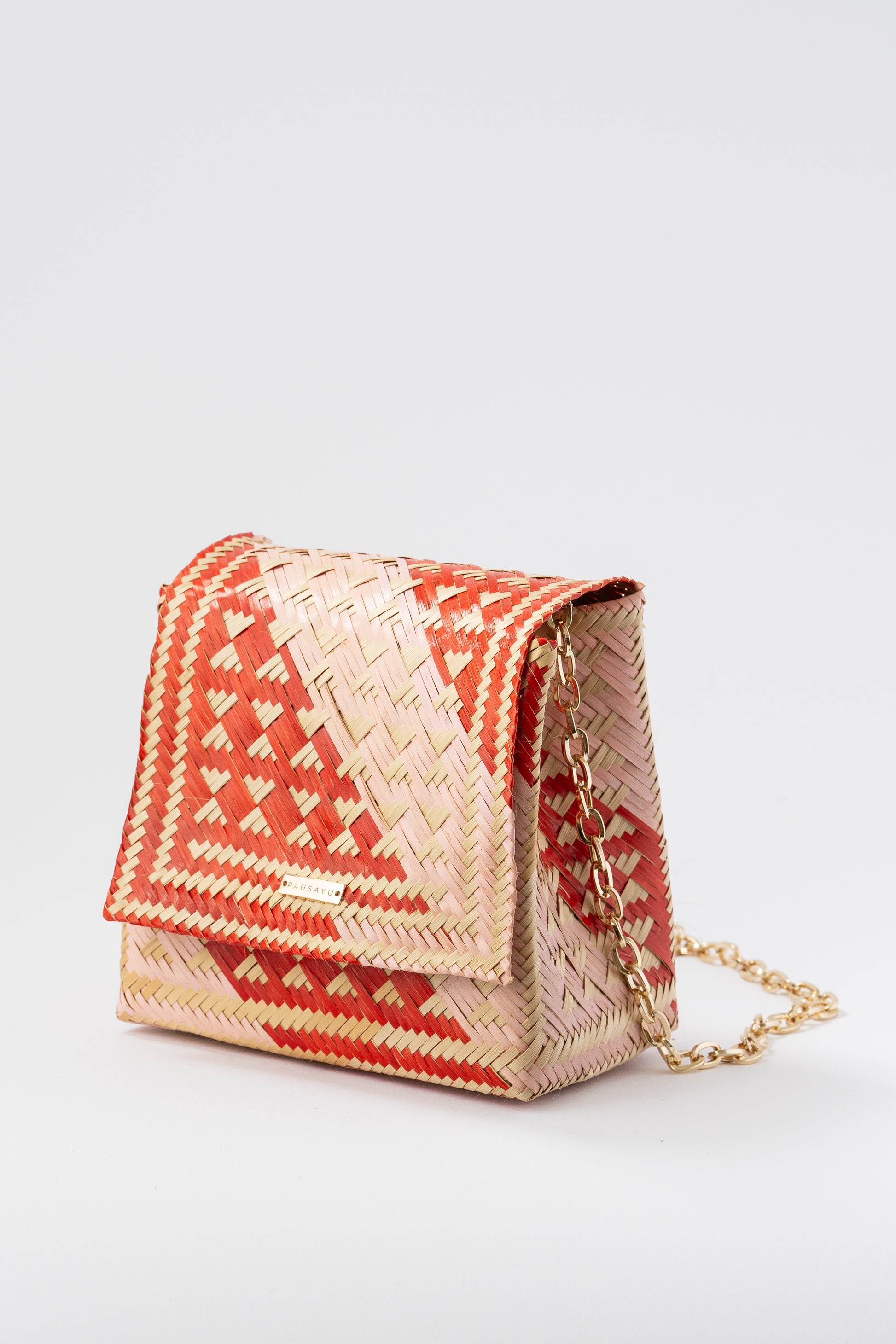 Dimensions: 15 cm x 15 cm x 9 cm. Handcrafted in palm by Wyuu artisans, our MINI LINDA CORAL is lined, featuring an internal pocket and a gold chain. Crafting time: 15 hours.