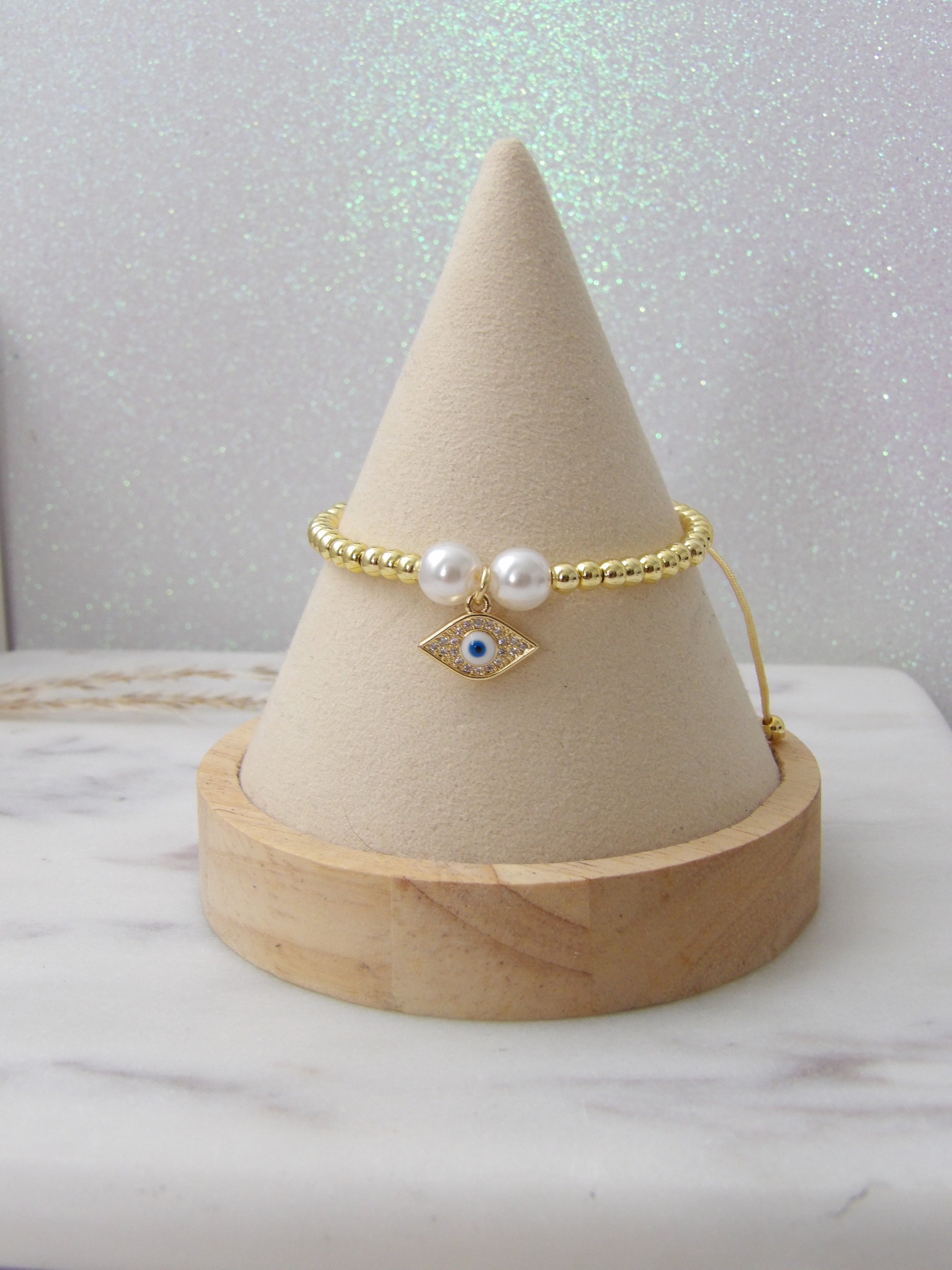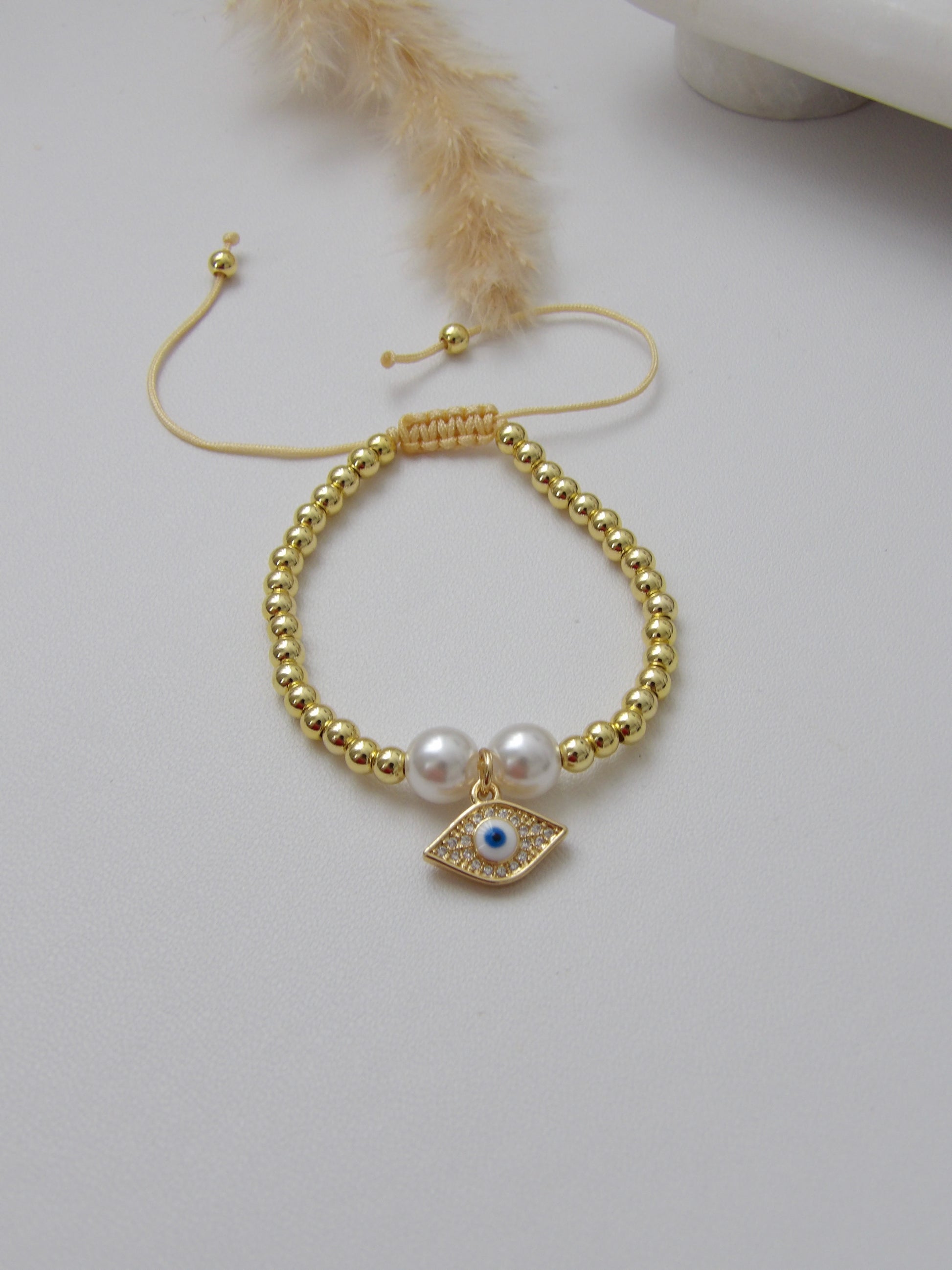 NÉMESIS | Adjustable rhodium bracelet with pearls and protective eye charm An elegant amulet designed to accompany you with style and good energy. Its design combines golden spheres, two classic pearls, and a protective eye charm with sparkling crystals, a symbol of light, intuition, and protection .Handmade, with an adjustable design. Perfect for wearing alone or in combination.