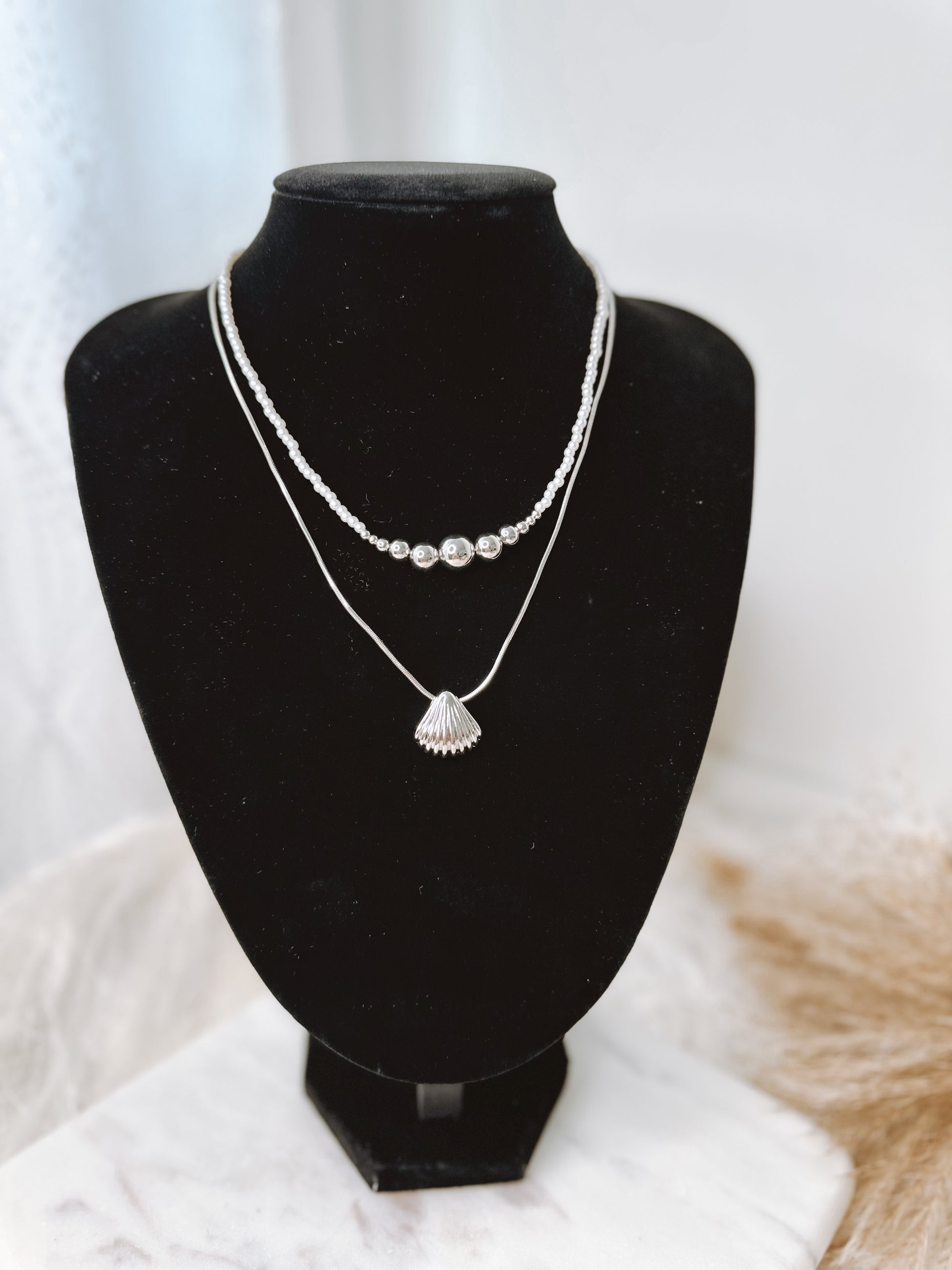 Dress with sophistication and adorns your neckline with the NURIA PEARL DOBLE NECKLACE SILVER. This beautiful design features a single seashell that adds a touch of luxury. Made with goldfield, it's an elegant and exclusive piece that will elevate any outfit. Rhodium