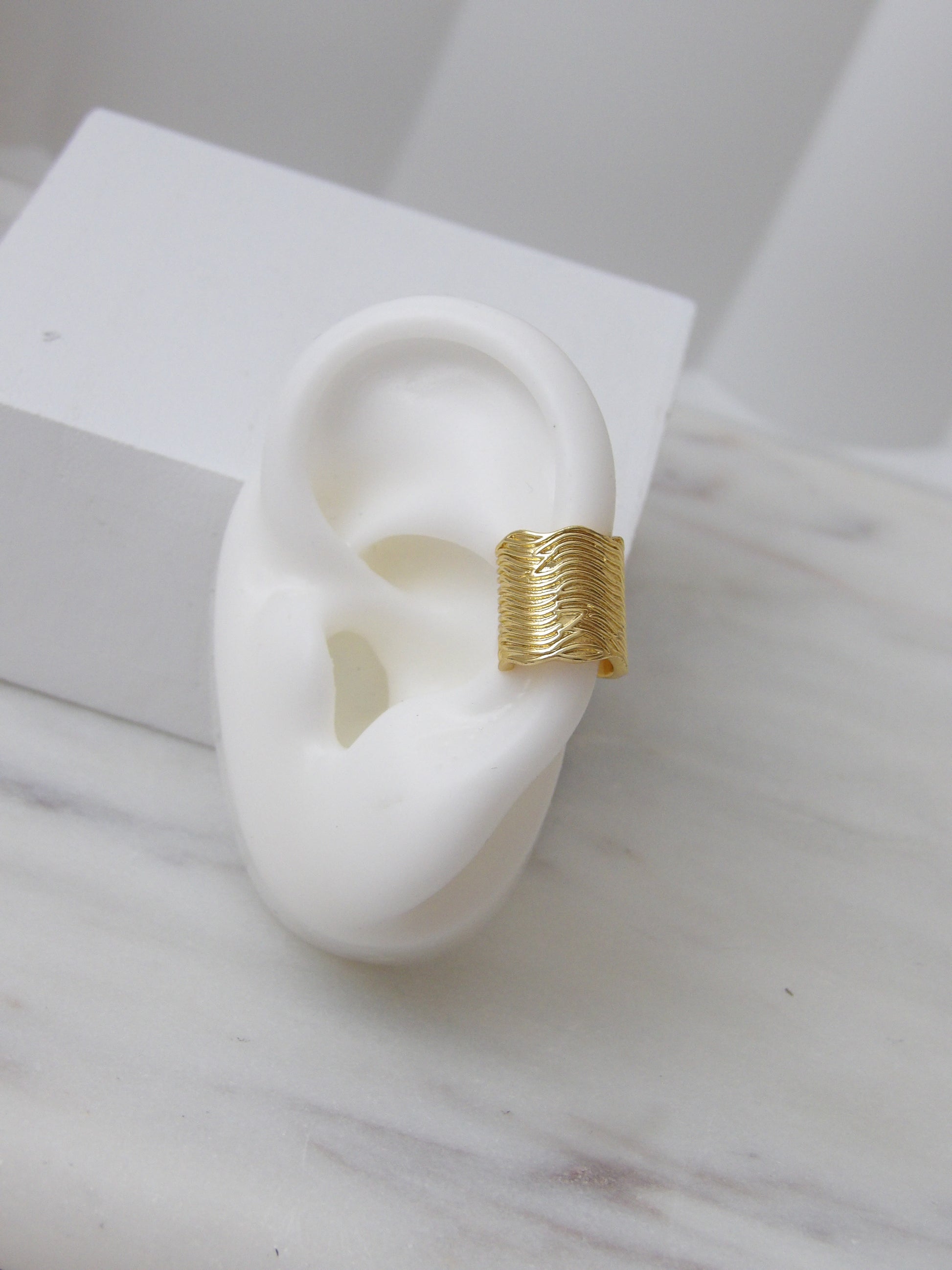 Effortless elegance. This gold-plated ear cuff shines with a wave-like texture and bold shape. No piercing needed—just pure style.