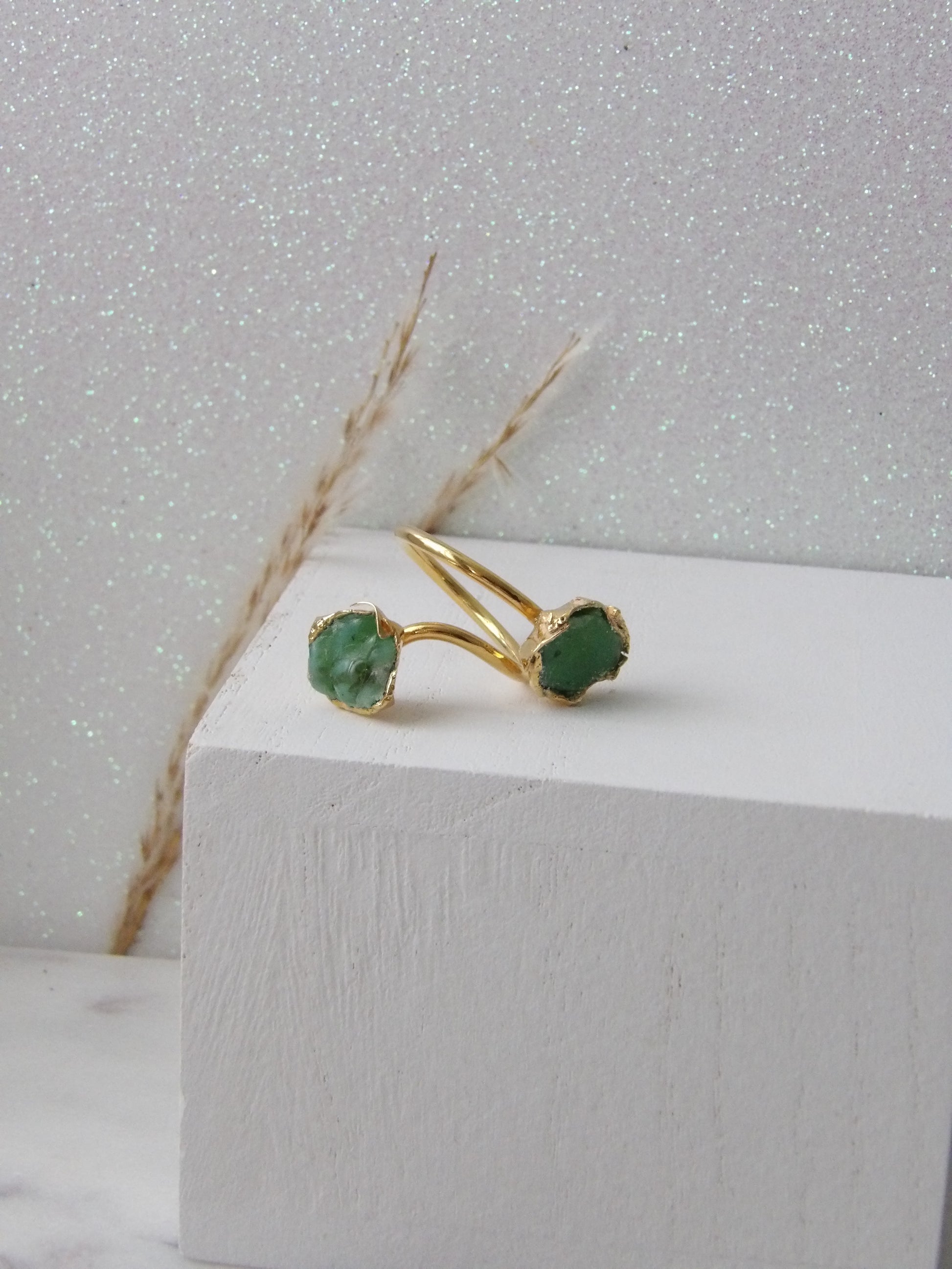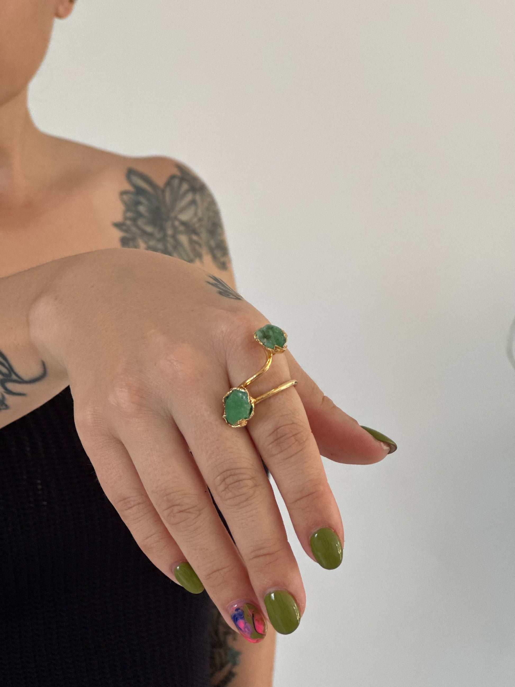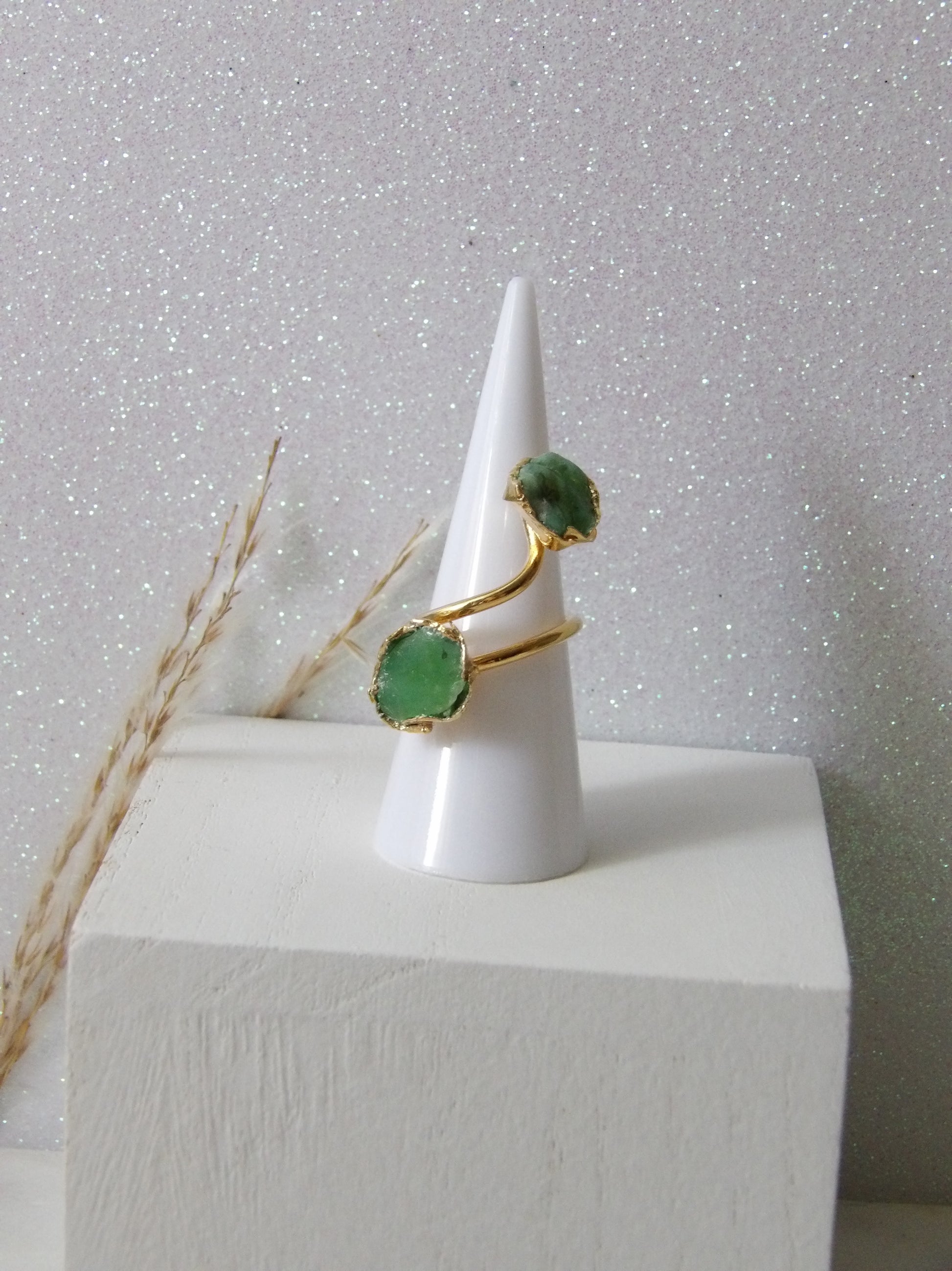 SELVIA | Adjustable Ring in Bronze with Hand-Melted Green CrystalCurves that envelop. Beauty that seduces. Selvia is a handmade adjustable ring with a wrapping design and stones in hand-melted green crystal that evoke living nature. Its open silhouette stylizes the hand with a sophisticated and sensual touch. A jewel that embraces you with character and light. ✨ Subtle, magnetic, unforgettable.