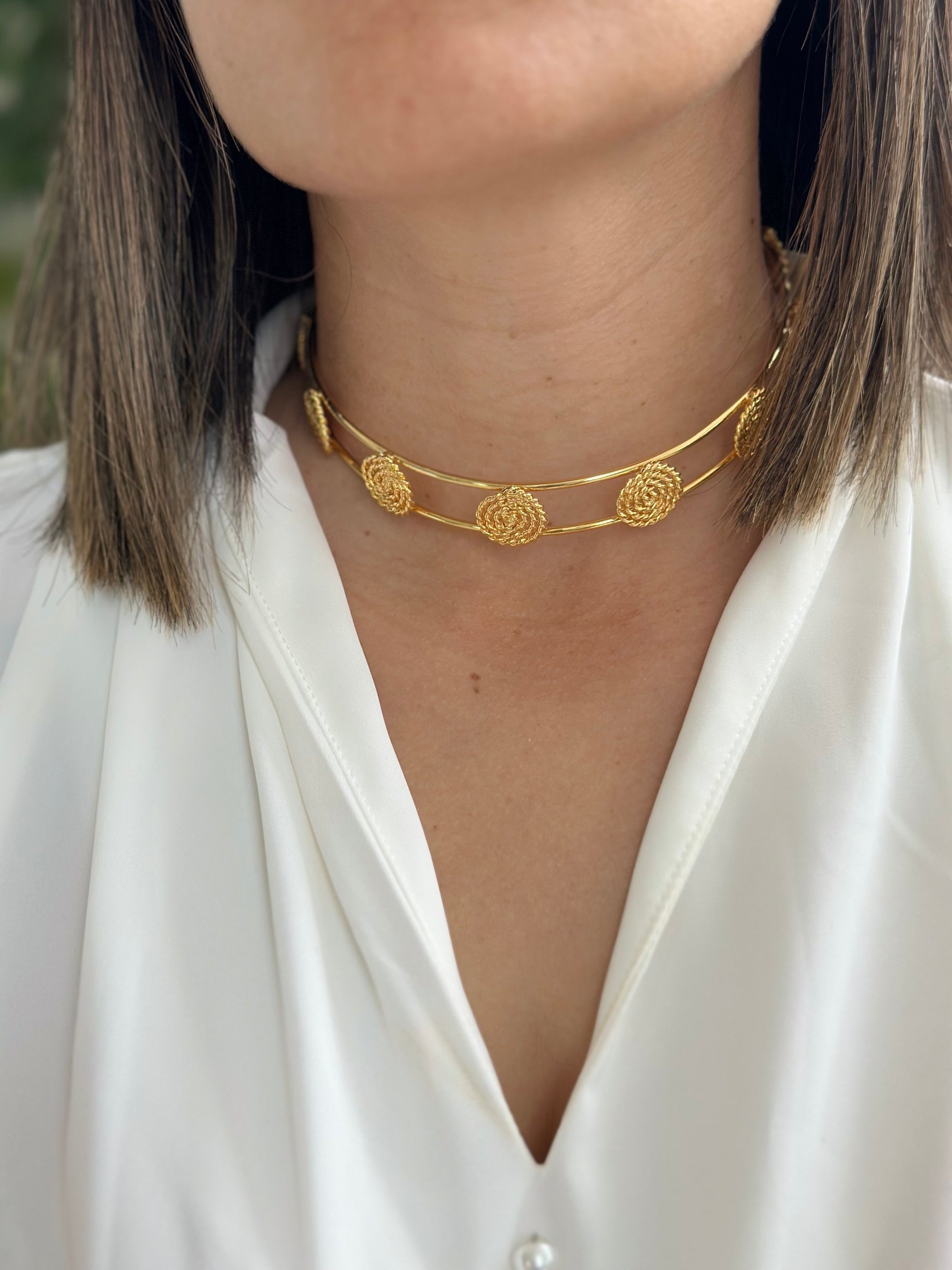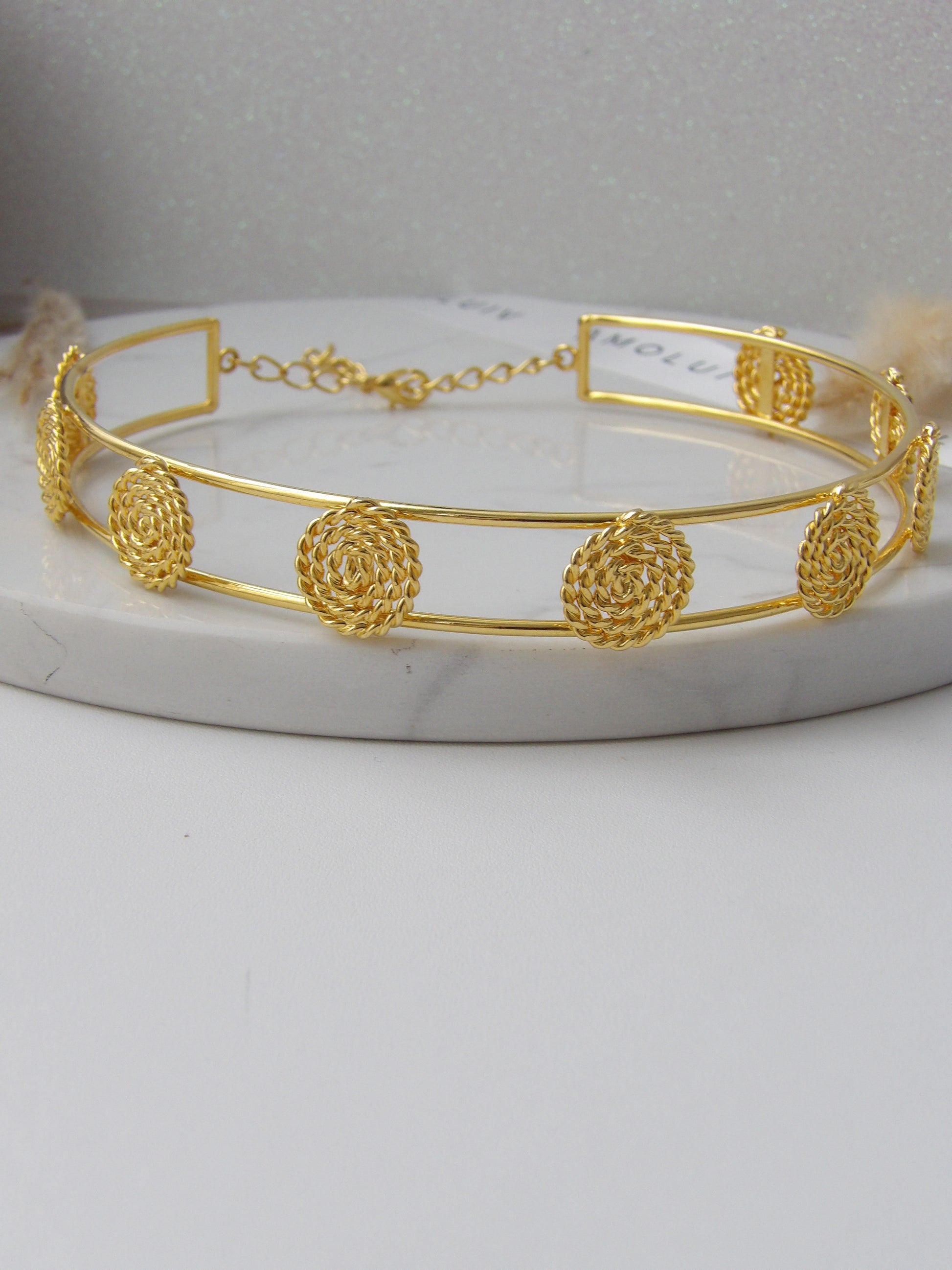 Handcrafted with twisted circular shapes and a sturdy 24K gold-plated bronze structure, it has a geometric, elegant, and handcrafted feel, with a design that highlights the neck with strength and distinction.