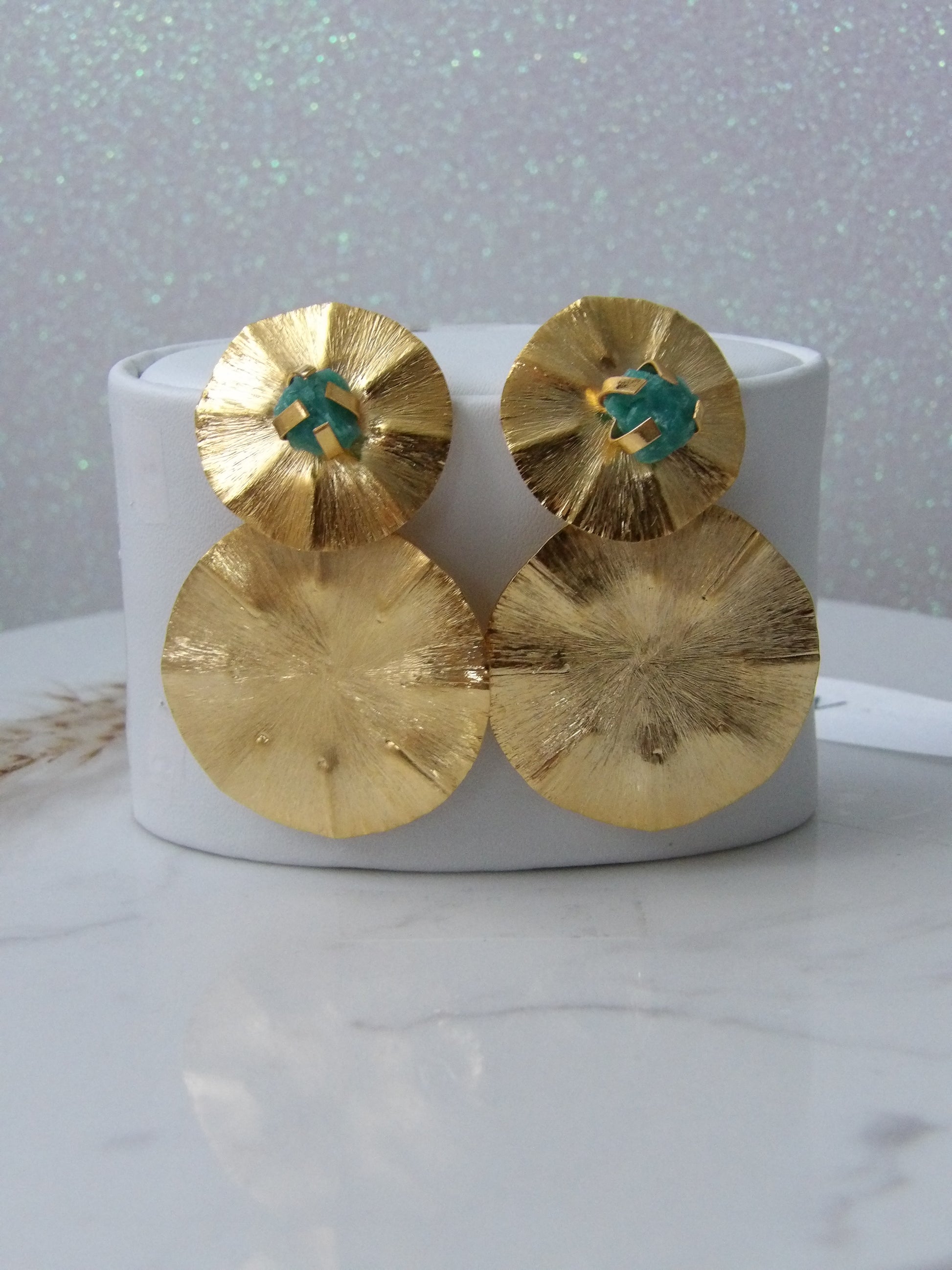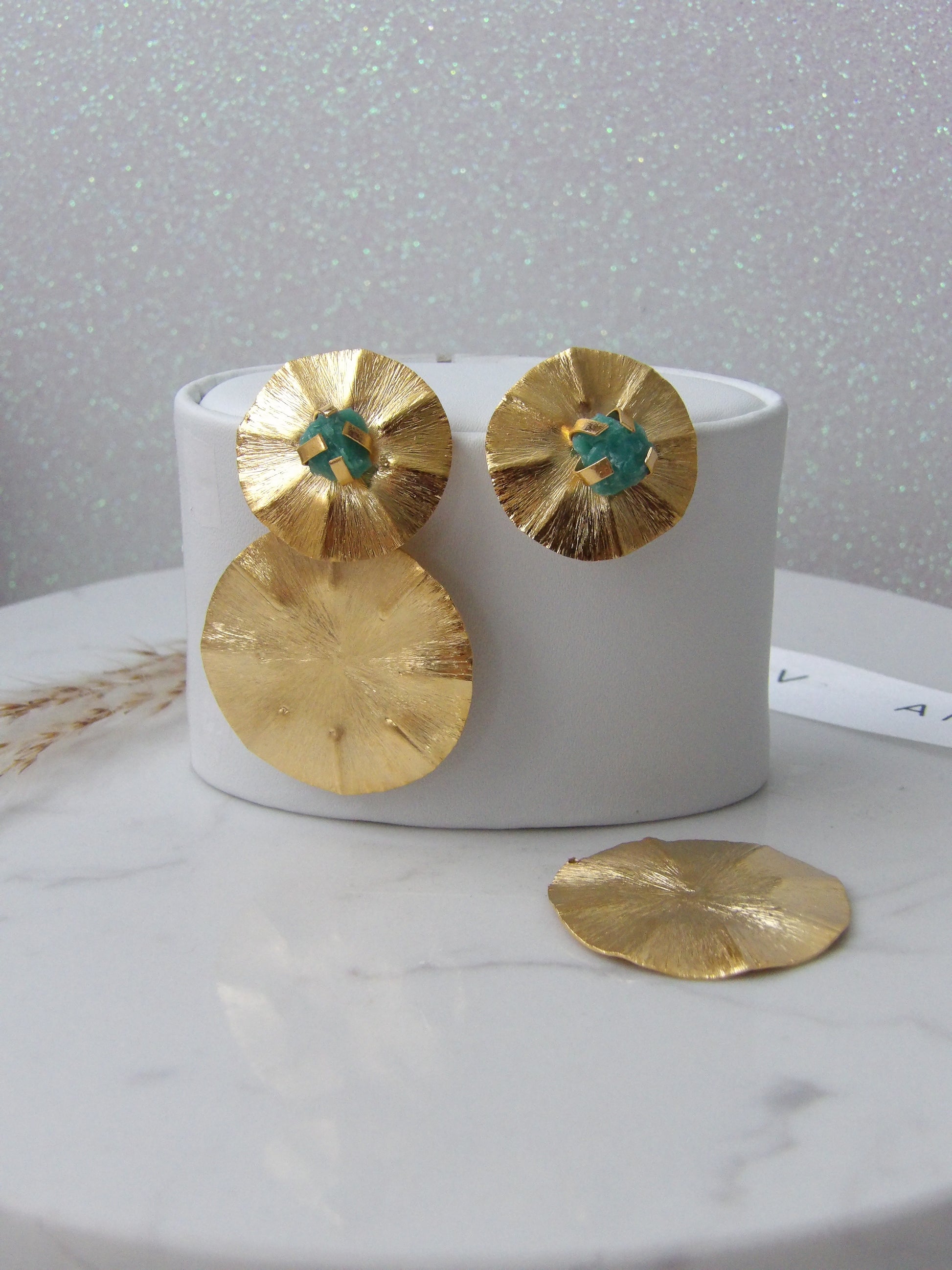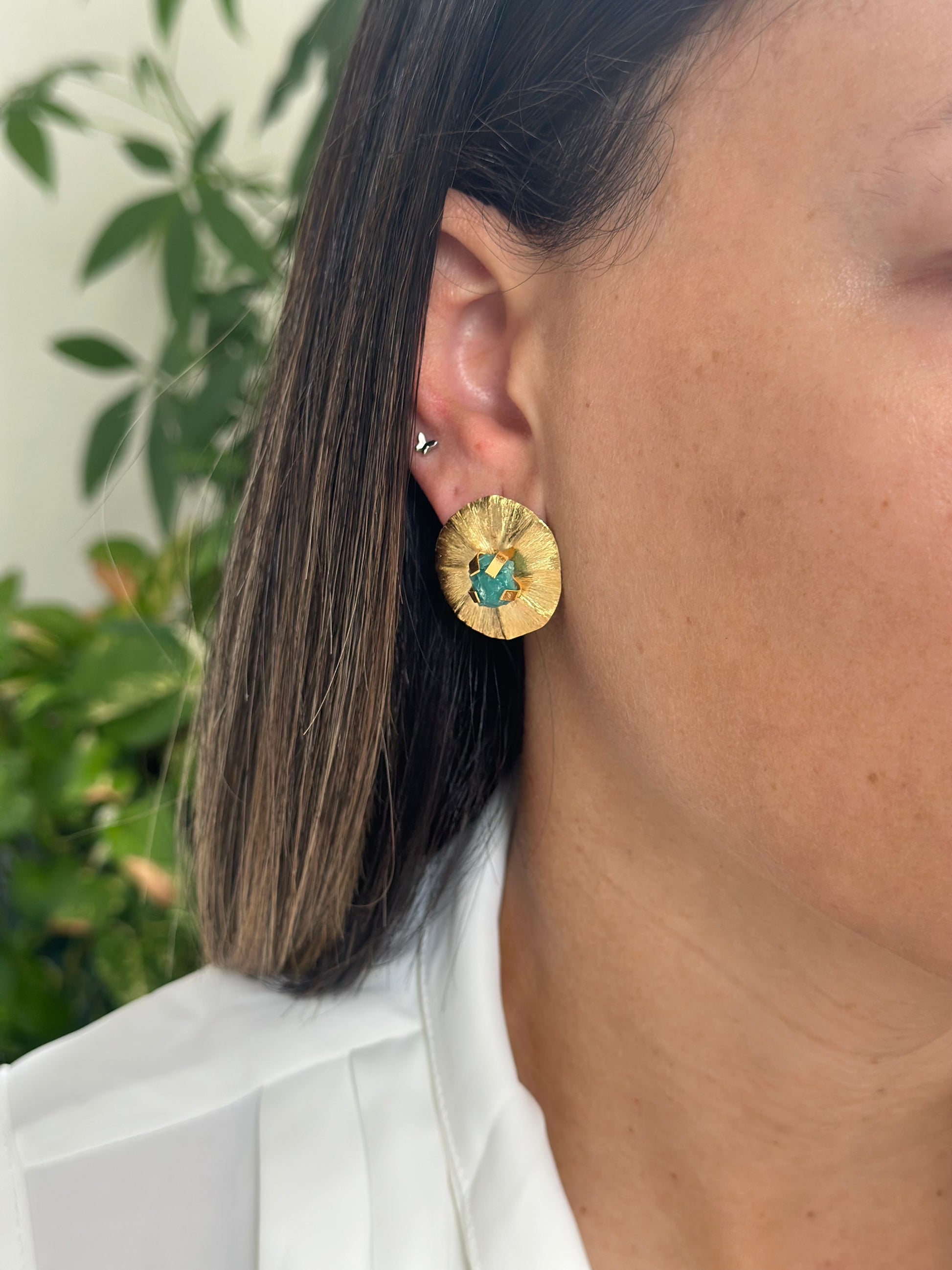 Let your style shine with Solar Essence. Multi-purpose earrings handcrafted in 24k gold-plated bronze, enhanced with an emerald gemstone for a vibrant and sophisticated touch. A versatile piece of jewelry that brightens any occasion with its handcrafted design and natural brilliance.