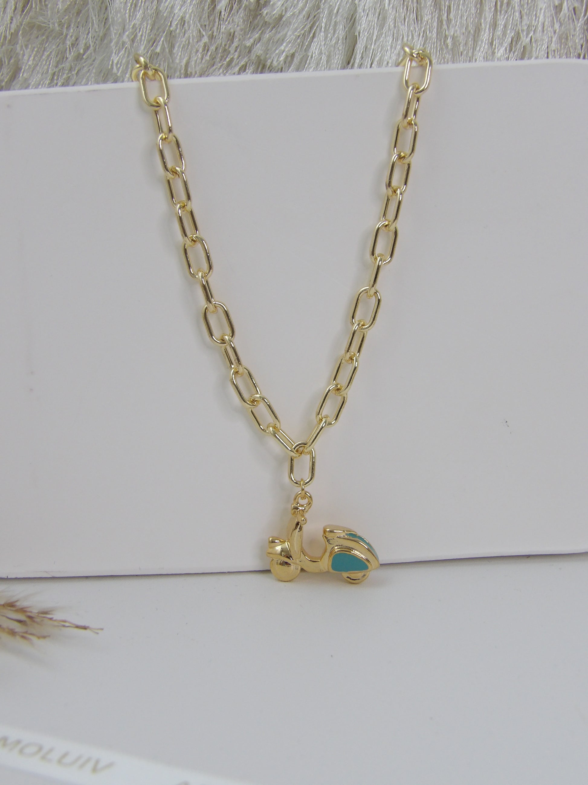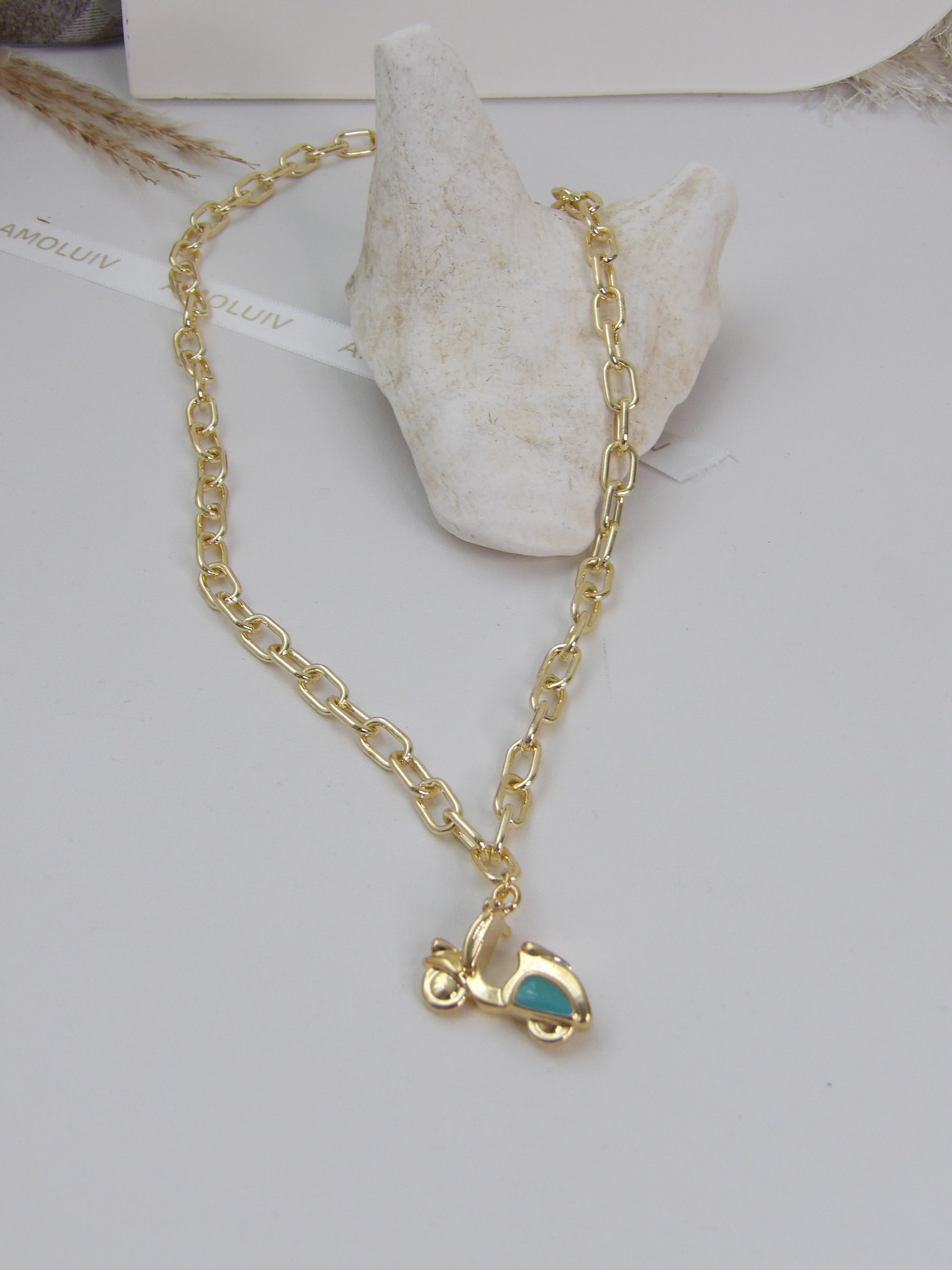 Introducing the SOLEIL GOLD NECKLACE! With a super quiet and unique design, this necklace features a beautiful motorcycle charm that adds a fresh touch to any style. Made with high quality rhodium, this piece is perfect for those looking for a playful accessory.