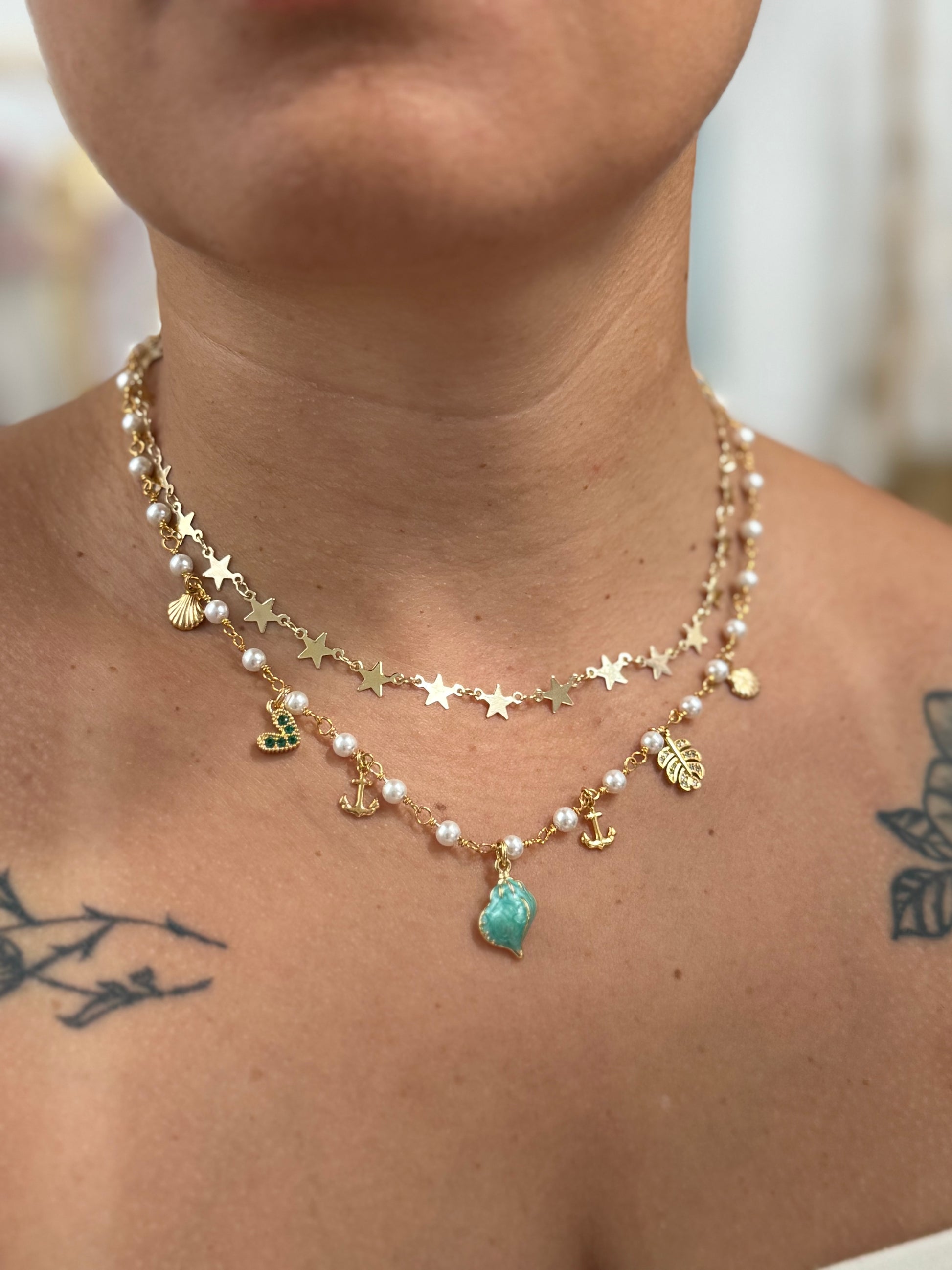 A dreamy island glow. Two layered handmade rhodium necklaces β one with stars, the other with pearls and tropical charms like anchors, leaves, and turquoise stone. Elegant with a hint of wanderlust.