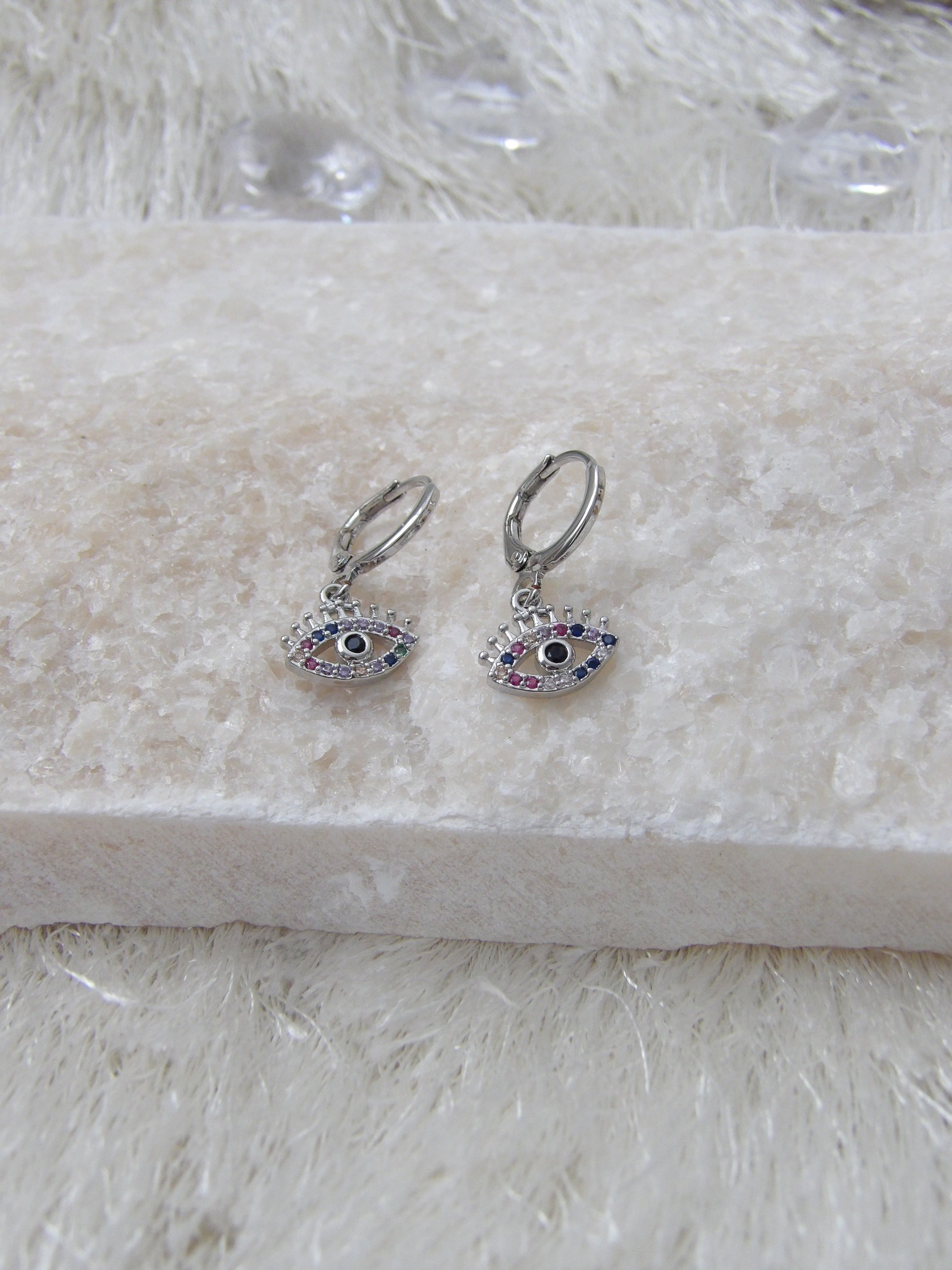 Let your style radiate protection and brilliance with the Stélara Eye earrings. Featuring a drop design in rhodium gold plated finish, these pieces embody the symbolic charm of the protective eye, brought to life with shimmering crystals in white, blue, and soft pink tones. Lightweight yet full of meaning, they are made to stand out—whether worn alone or layered with your favorite jewelry.