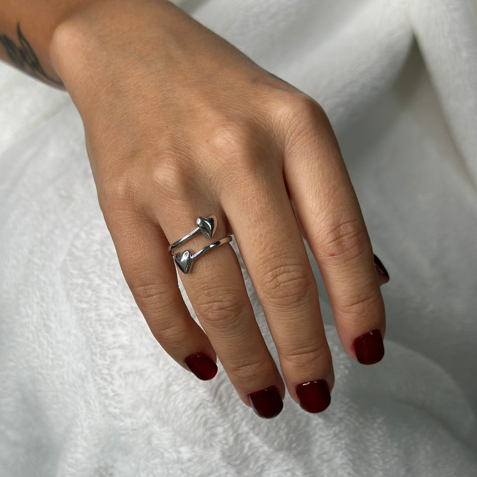 Introducing the playful and stylish TIA SILVER RING! Made with stunning rhodium, this adjustable ring features two beautiful hearts. Perfect for adding a touch of charm and uniqueness to any outfit. (Your finger will thank you!)