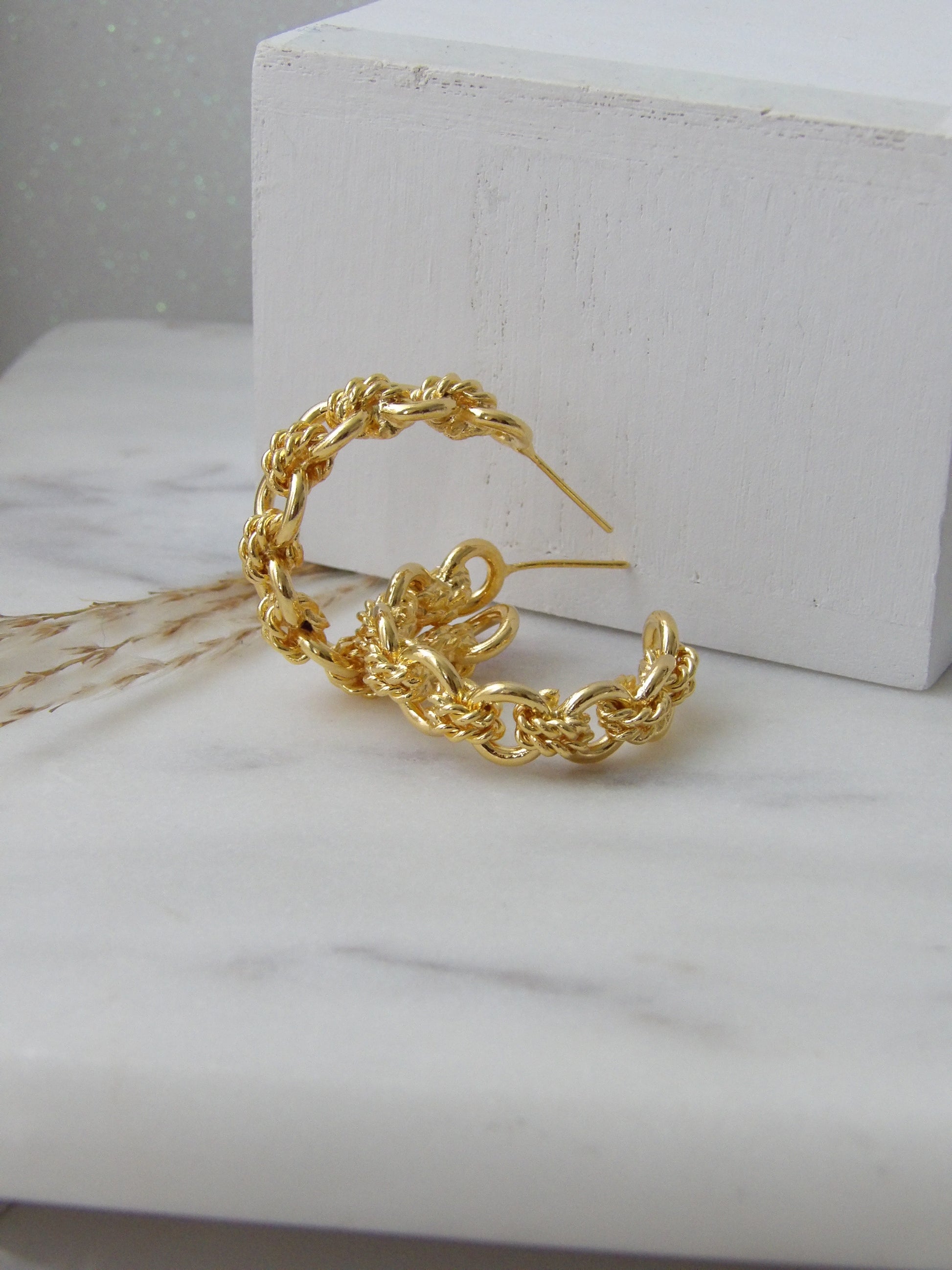 An elegant and modern version of the classic hoop. The TrenS Hoops are handmade earrings in gold-plated bronze, featuring a braid that adds texture, volume, and a spectacular shine. Perfect for adding a sophisticated and unique touch to your daily look or to elevate an evening outfit. Lightweight, comfortable, and designed to stand out. ✨ Designed to inspire you. Made to stand out.