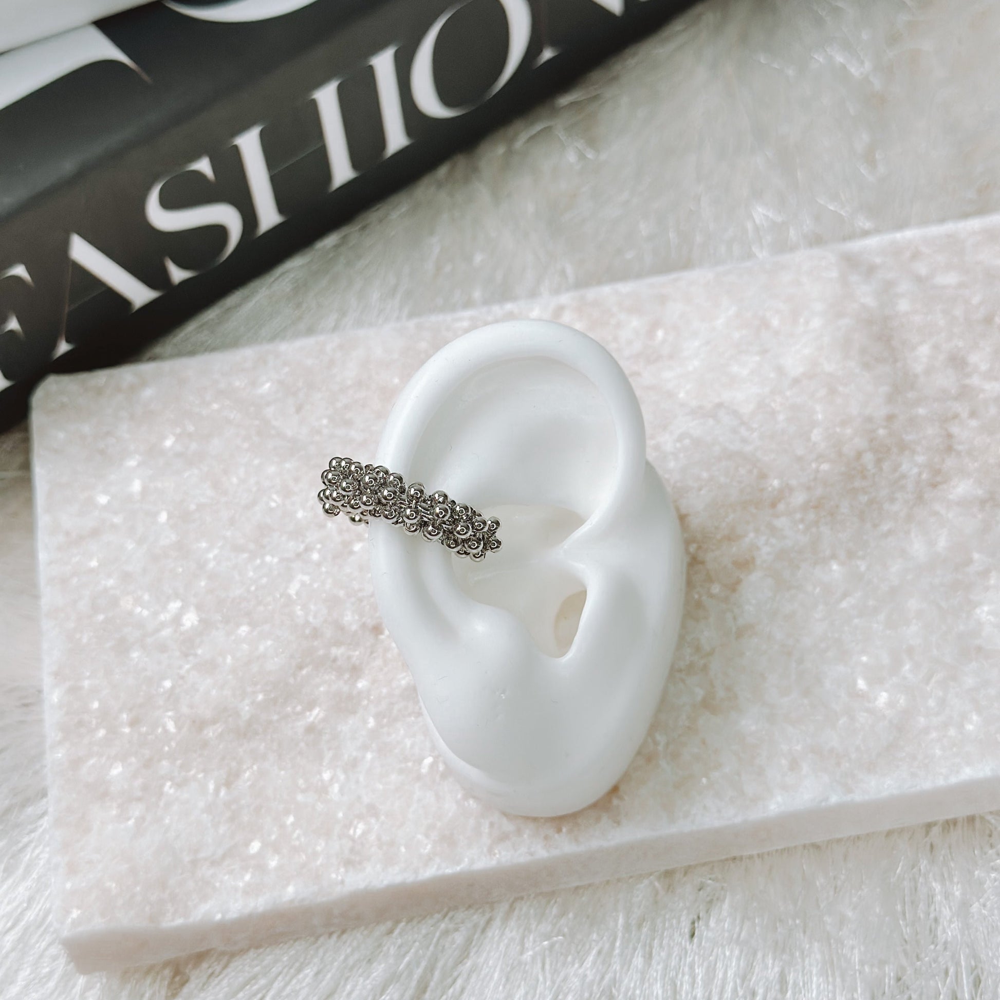 Indulge in a touch of edgy elegance with the TUPIDO EAR CUFF SILVER. This stunning piece features a sleek and modern ear cuff design, adorned with luxuriously rhodio plating for a touch of opulence. A must-have statement accessory for any fashion-forward individual.
